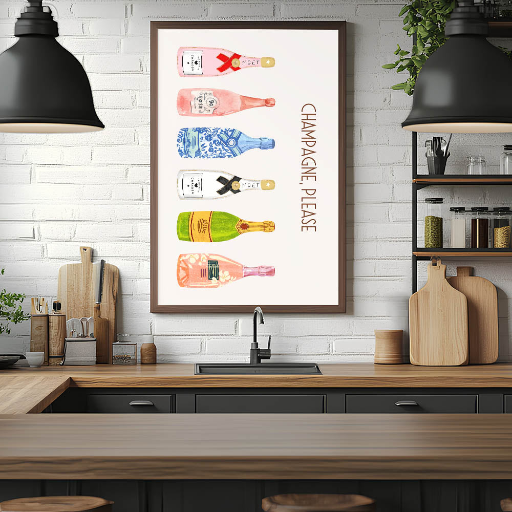 Celebrate in style with this elegant champagne-themed wall art, featuring a vibrant watercolor illustration of colorful champagne bottles and the playful phrase "Champagne, Please." Perfect for bar decor, wine-inspired kitchens, and celebratory spaces, this piece adds a luxurious and festive vibe to any setting.