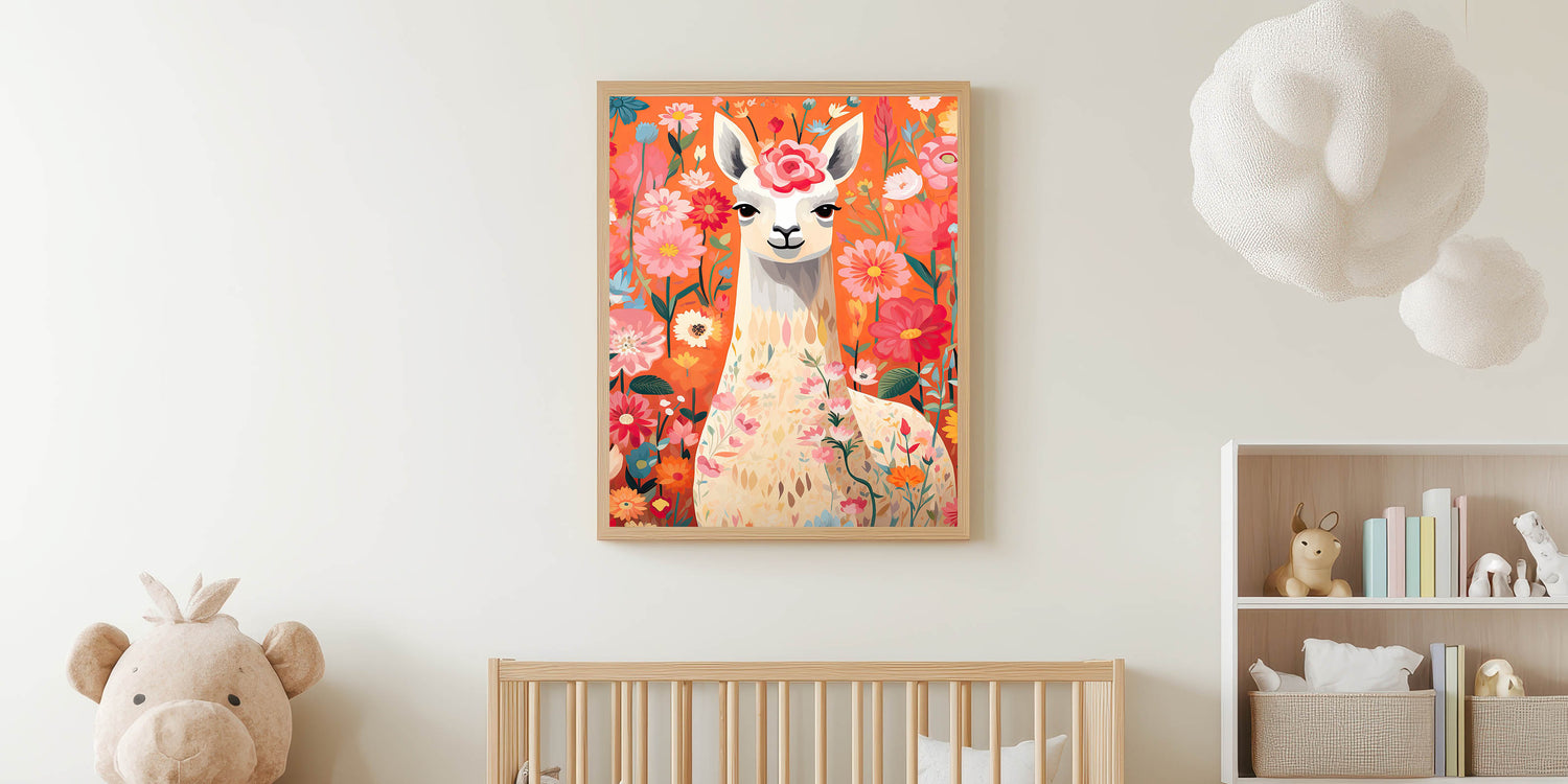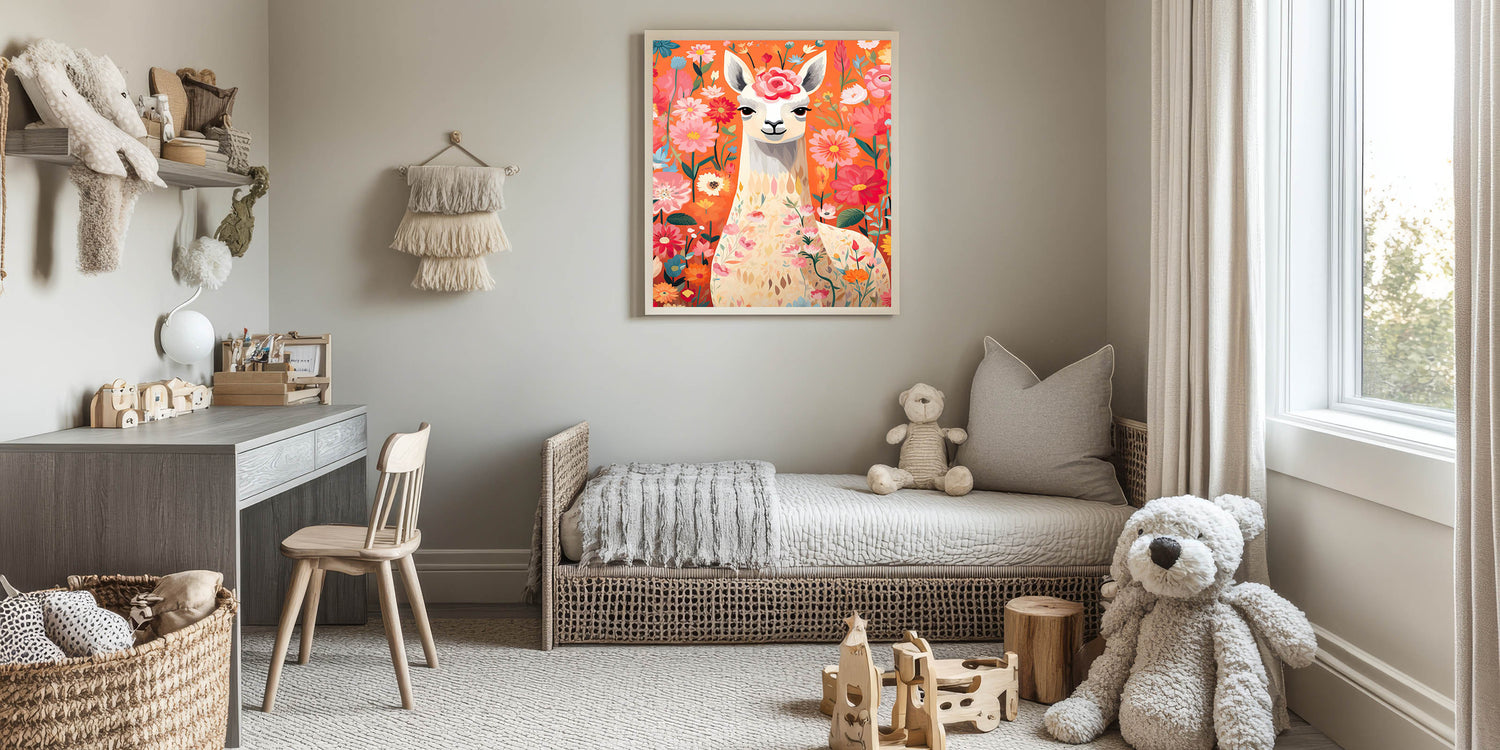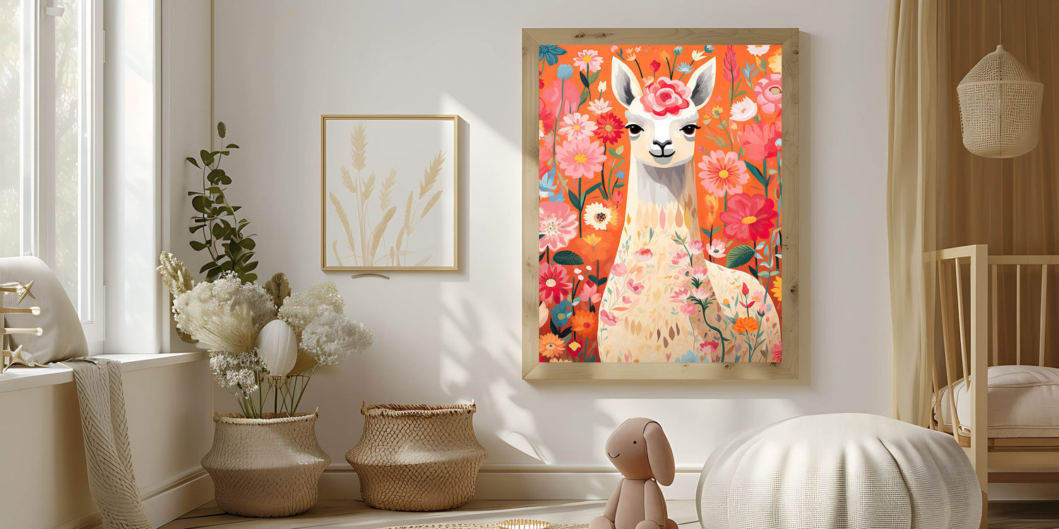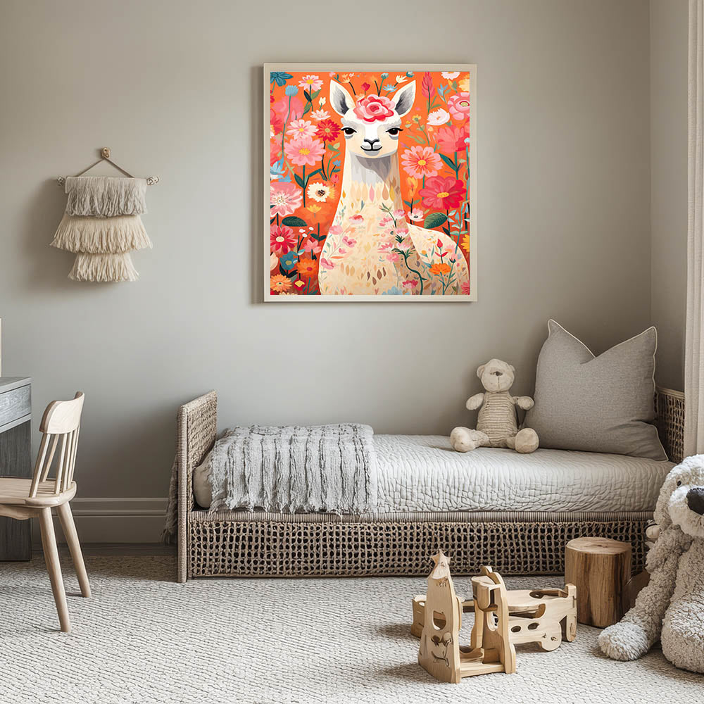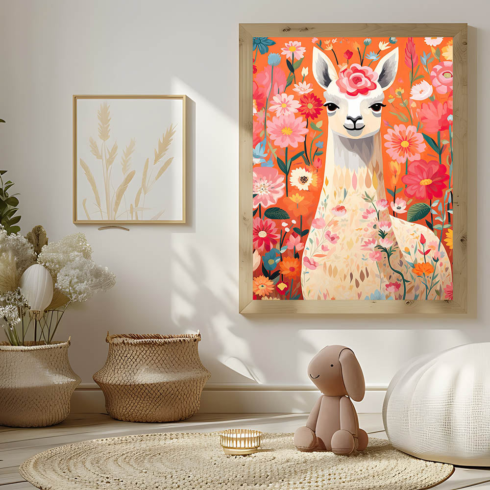 Add a playful and vibrant touch to your child’s space with this Children’s Wall Art Print, featuring a beautifully illustrated llama surrounded by blooming flowers. The warm and lively tones of orange, pink, and red create a cheerful and inviting atmosphere, making this Stretched Canvas Art for Kids a perfect choice for nurseries, playrooms, and kids' bedrooms.