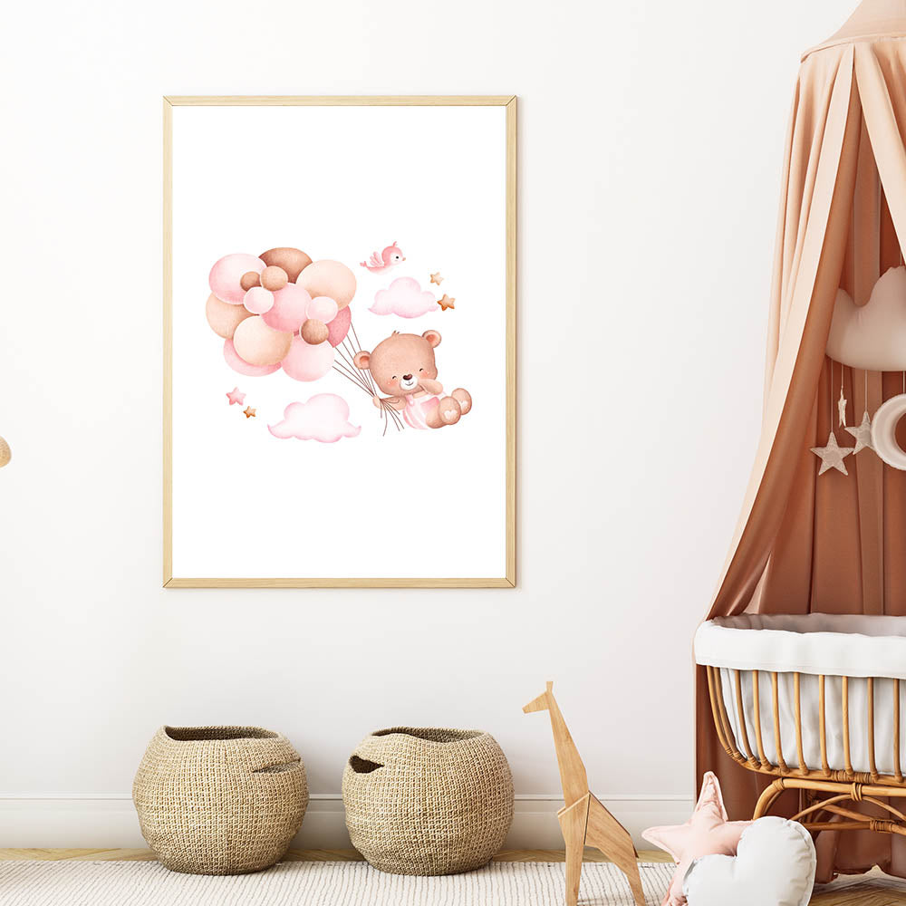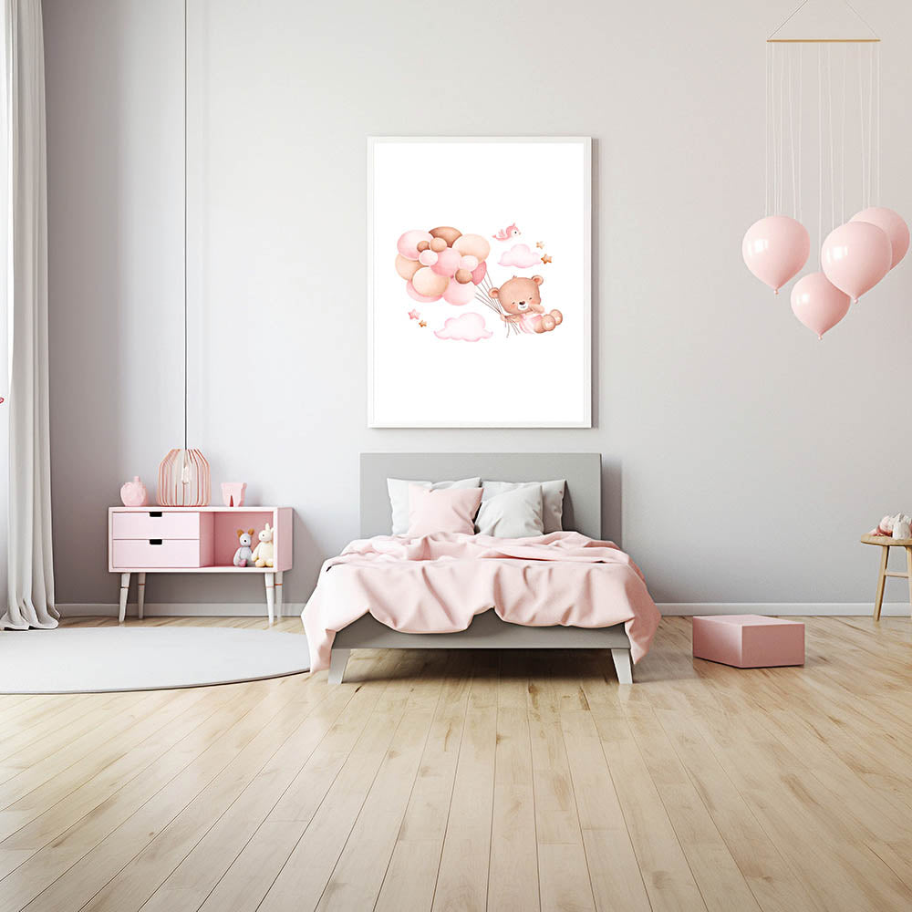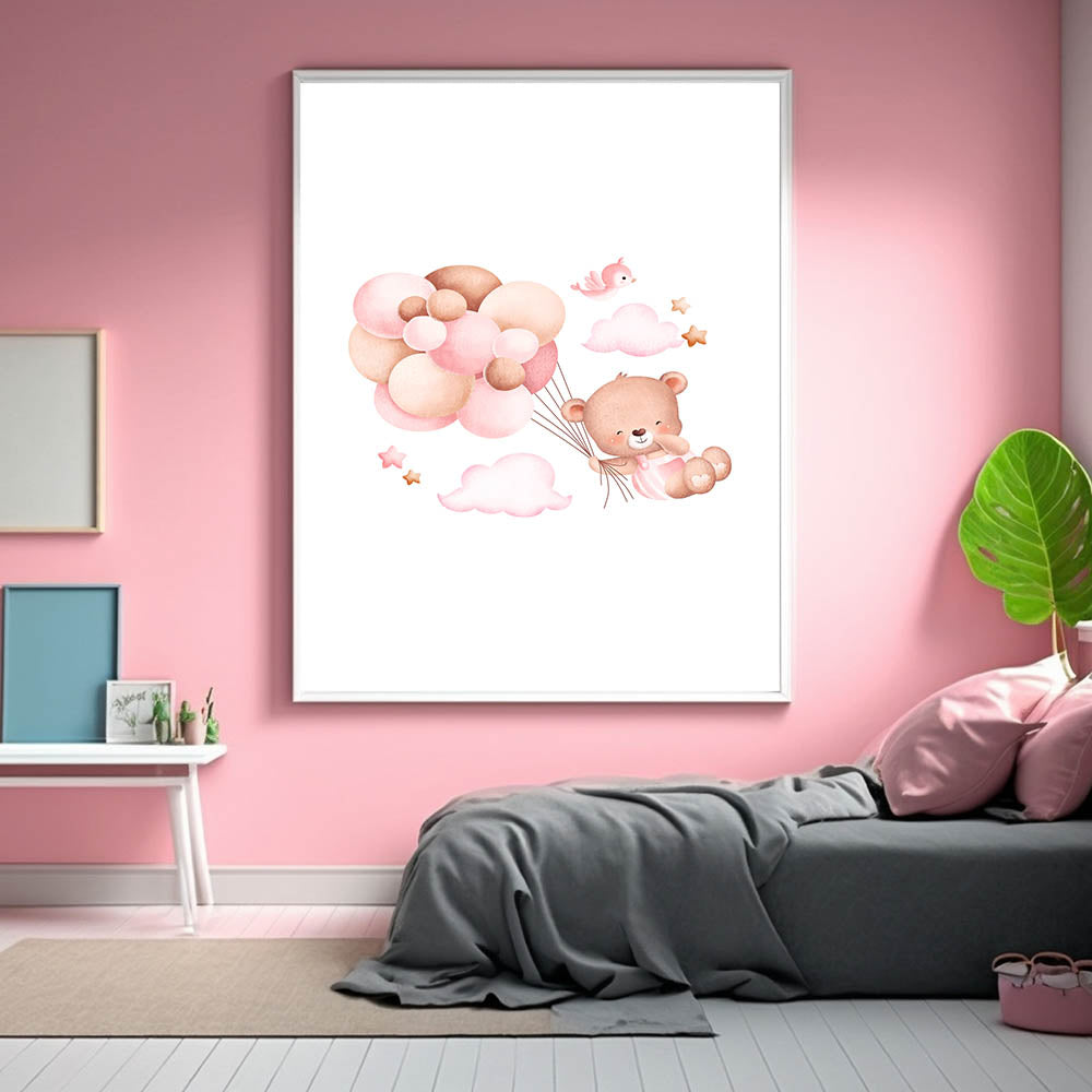 Create a dreamy and cozy space with this adorable floating teddy bear children’s wall decor. Featuring a soft watercolor bear soaring through the sky with pink and beige balloons, this print brings a sense of warmth, joy, and adventure to any nursery, bedroom, or playroom.
