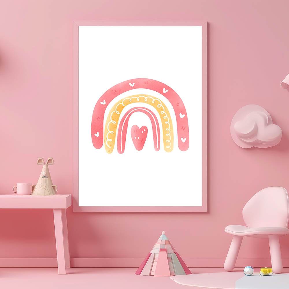 Add a playful and colorful touch to your child’s space with this adorable heart rainbow children’s wall decor. Featuring a soft watercolor rainbow in pink, yellow, and white with cute heart details and swirly patterns, this artwork brings joy and warmth to any nursery, bedroom, or playroom.