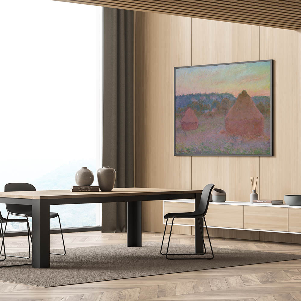 Add the timeless beauty of Claude Monet’s Stacks of Wheat (End of Day, Autumn) to your space. This celebrated Impressionist painting captures the tranquil beauty of wheat stacks bathed in the soft hues of an autumn sunset. Monet’s signature brushstrokes and mastery of light and color bring a dreamlike quality to this serene rural scene. Perfect for any art lover, this piece evokes a sense of peace and nostalgia.