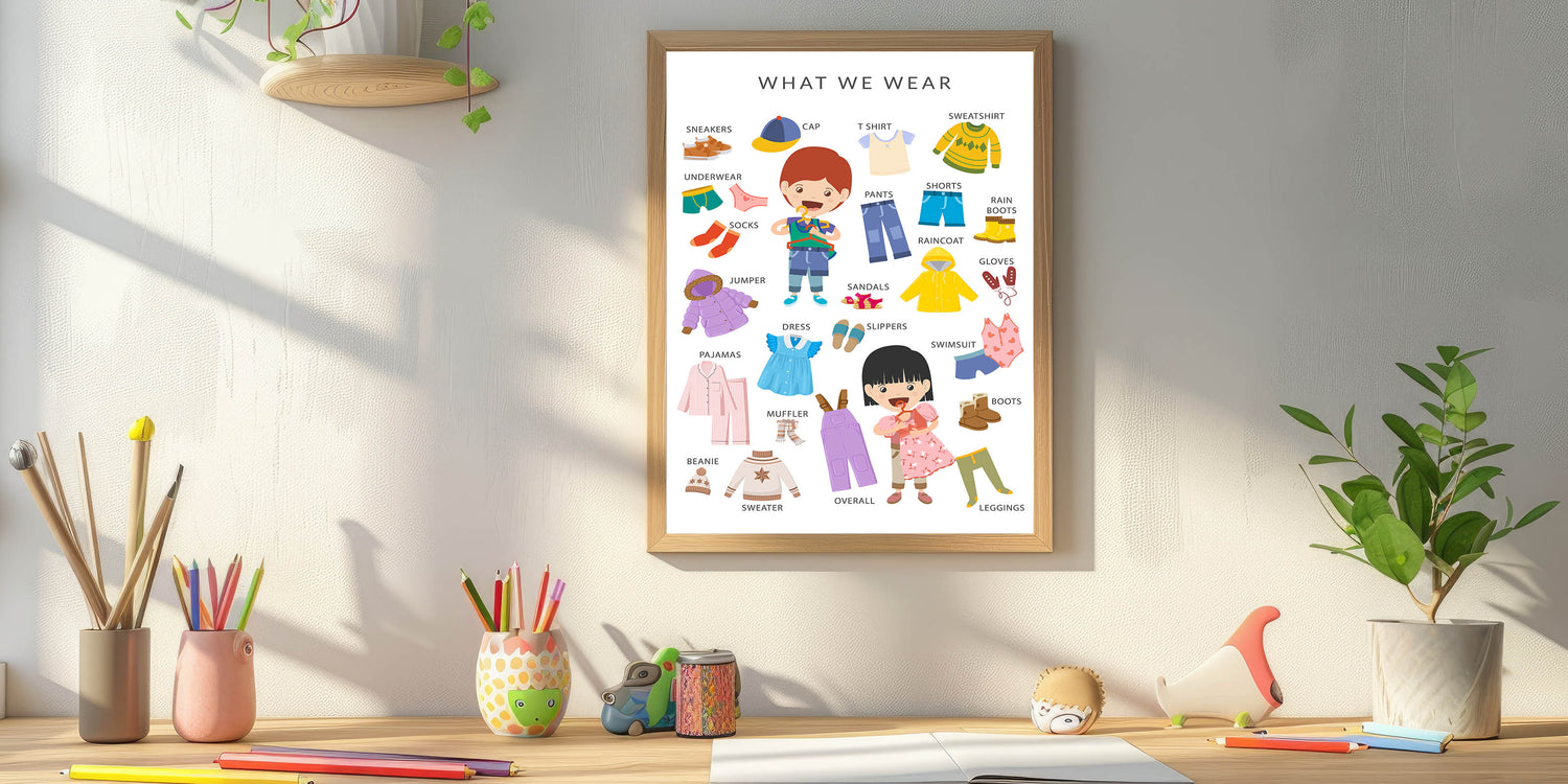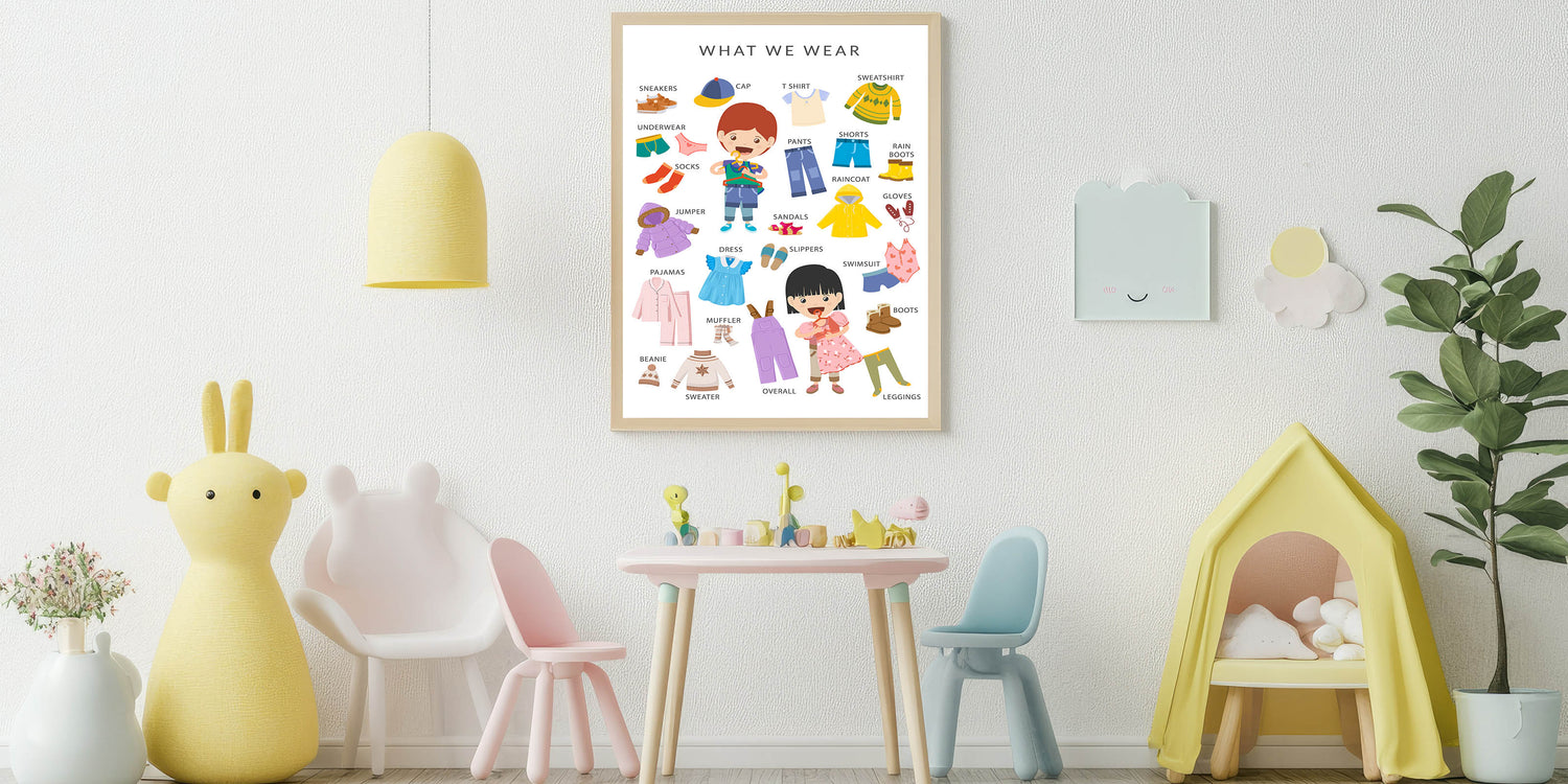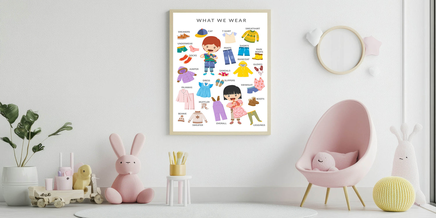 Encourage interactive learning with this clothing-themed learning poster for kids. Whether for a homeschool setup, preschool classroom, or playroom, this educational nursery decor makes getting dressed a fun learning experience.