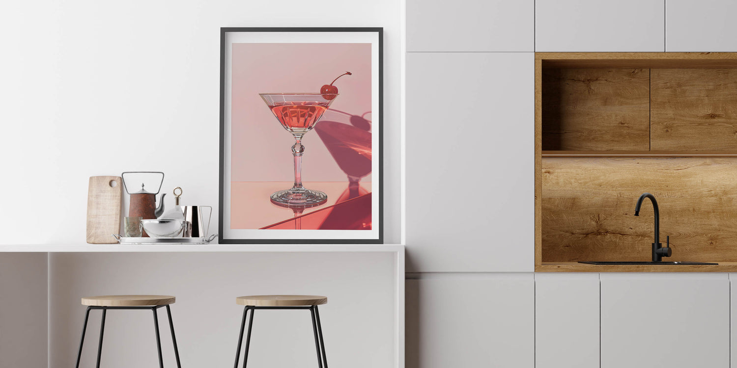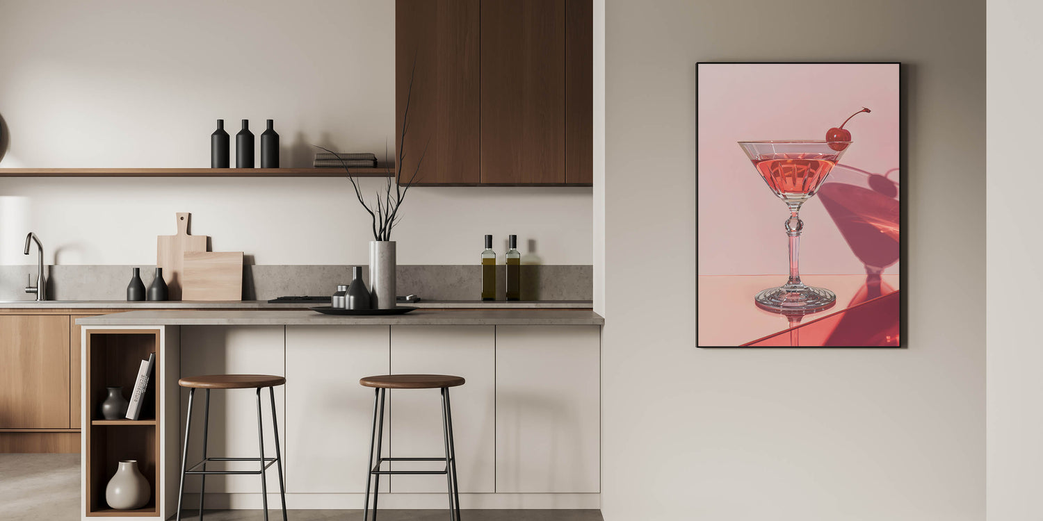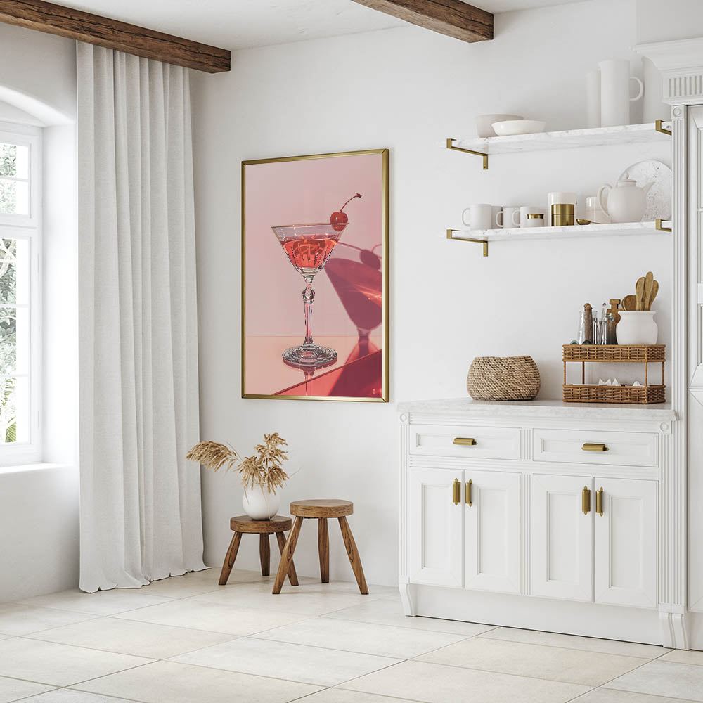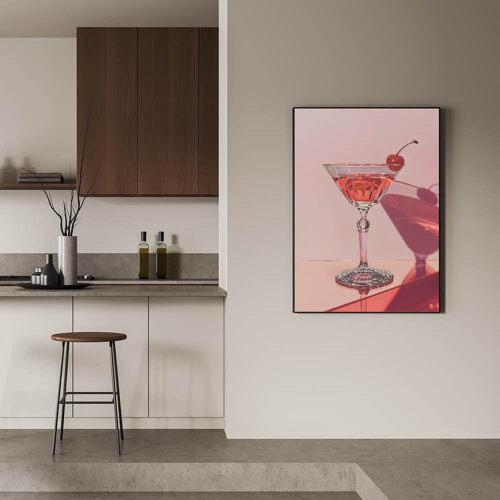 Add a bold and sophisticated touch to your space with this Cherry Martini cocktail wall art, a stunning representation of elegance and modern luxury. Featuring a crystal martini glass filled with a deep red cocktail, garnished with a glossy cherry, this drink-themed art print is a statement piece for bar decor, kitchen wall art, or contemporary lounge interiors. The rich pink and red tones, along with the dramatic reflections, create a visually striking composition perfect for upscale spaces.