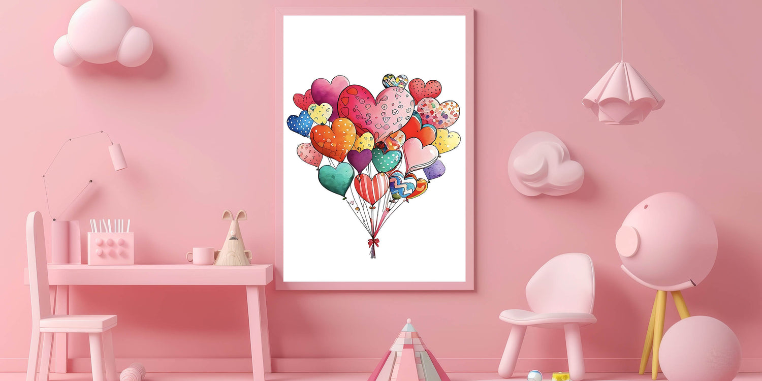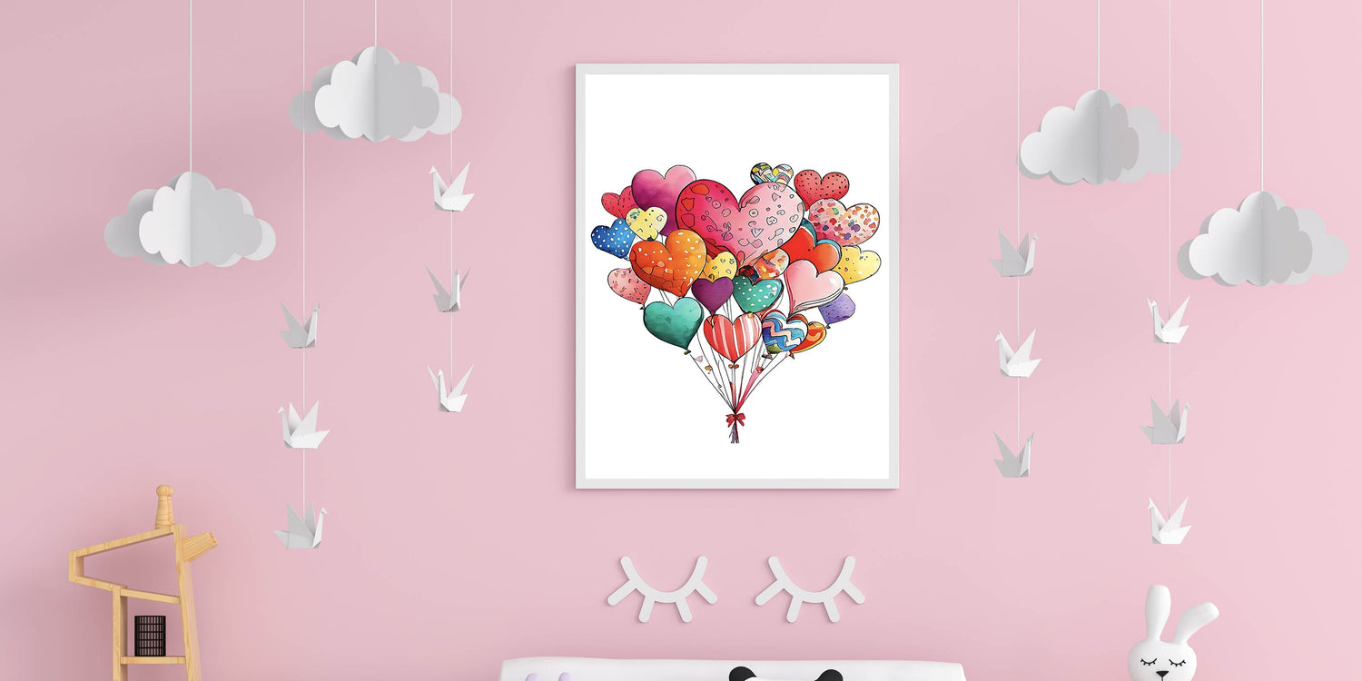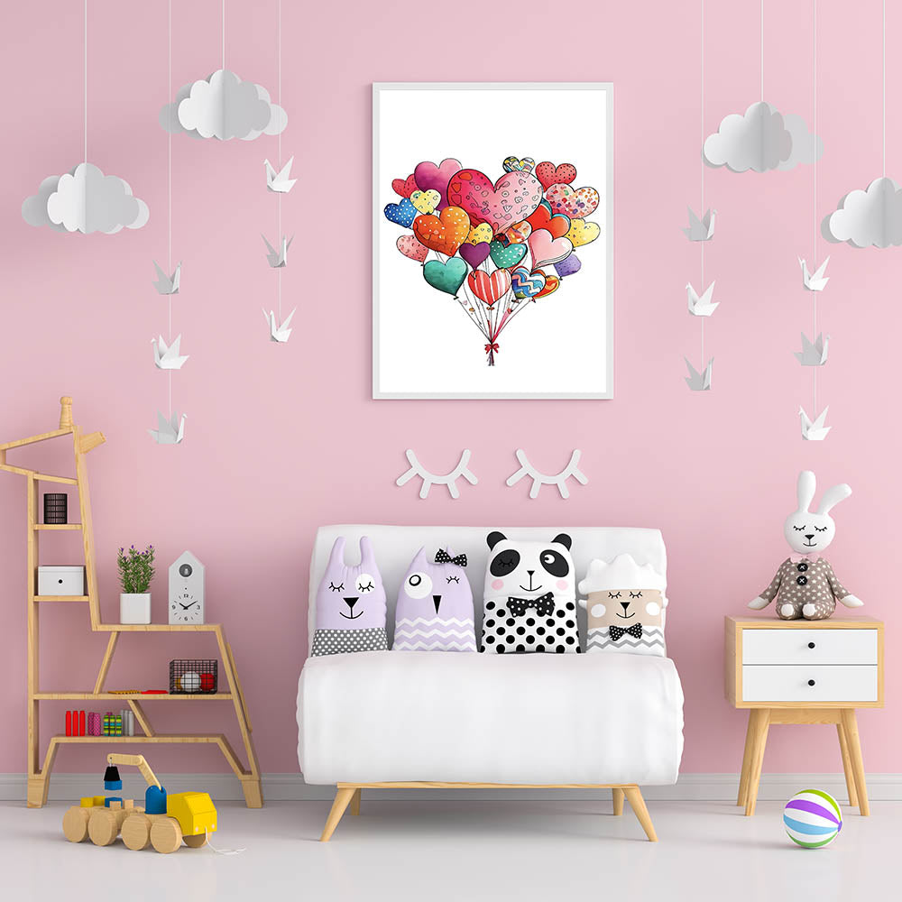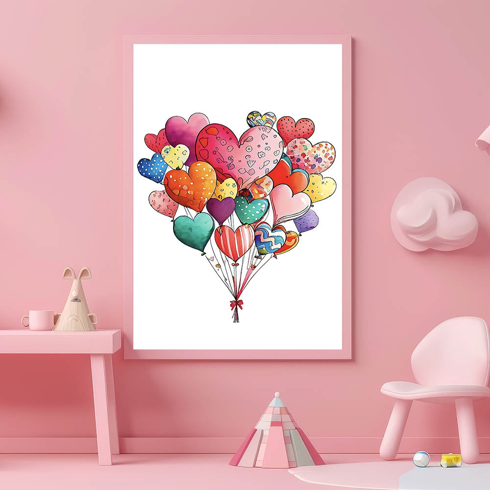 Brighten up your little one's space with this whimsical heart balloon wall art, perfect for a girls' room, nursery, or playroom. Featuring a lively assortment of colorful heart-shaped balloons, this design radiates joy and warmth, making it an excellent addition to any children's wall decor.