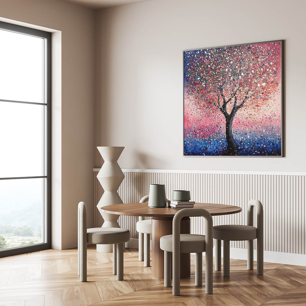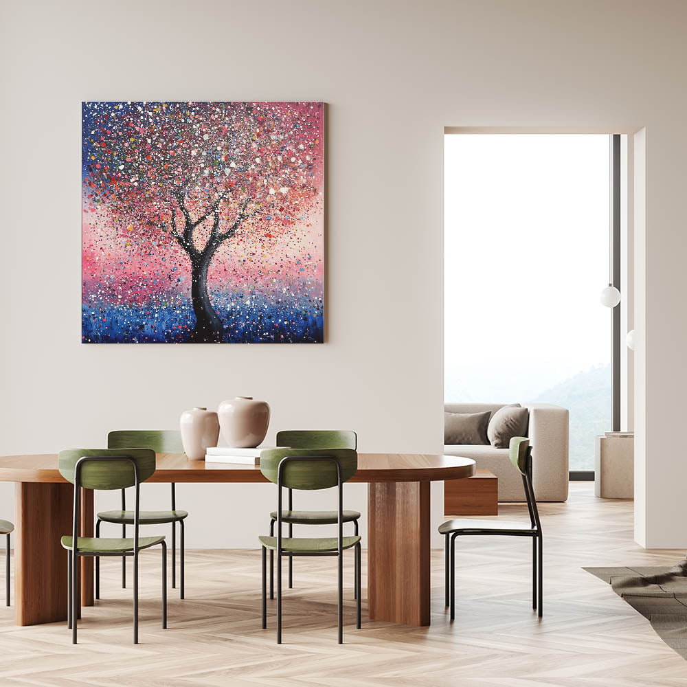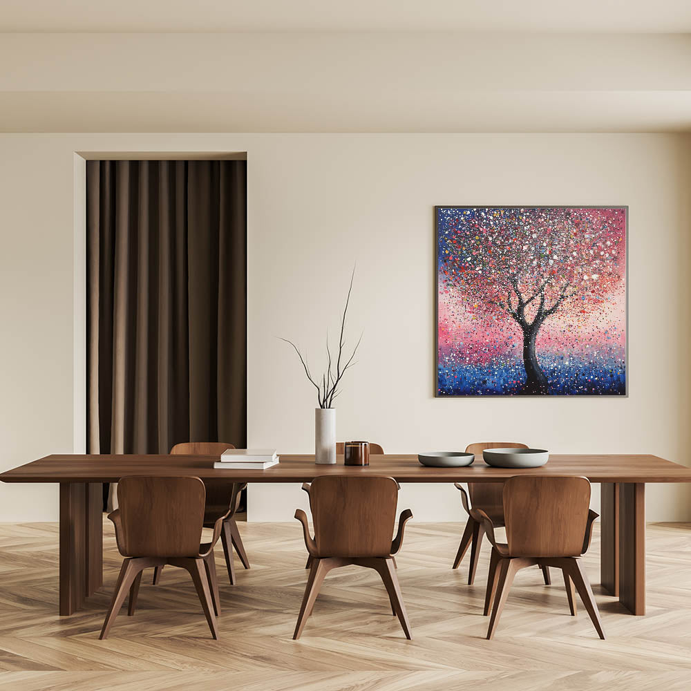 Transform your dining space with this contemporary dining art piece, featuring a stunning abstract tree bursting with pink, blue, and multicolor accents. The energetic splatter-paint technique and gradient background create a dynamic and eye-catching focal point, perfect for modern and artistic dining areas. This elegant dining room wall art brings warmth, creativity, and a vibrant energy to any space.