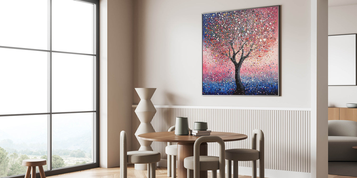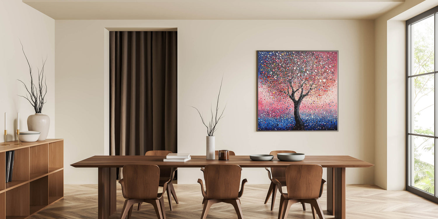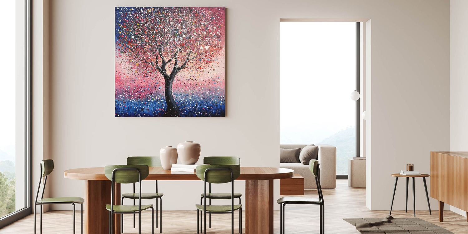 Transform your dining space with this contemporary dining art piece, featuring a stunning abstract tree bursting with pink, blue, and multicolor accents. The energetic splatter-paint technique and gradient background create a dynamic and eye-catching focal point, perfect for modern and artistic dining areas. This elegant dining room wall art brings warmth, creativity, and a vibrant energy to any space.