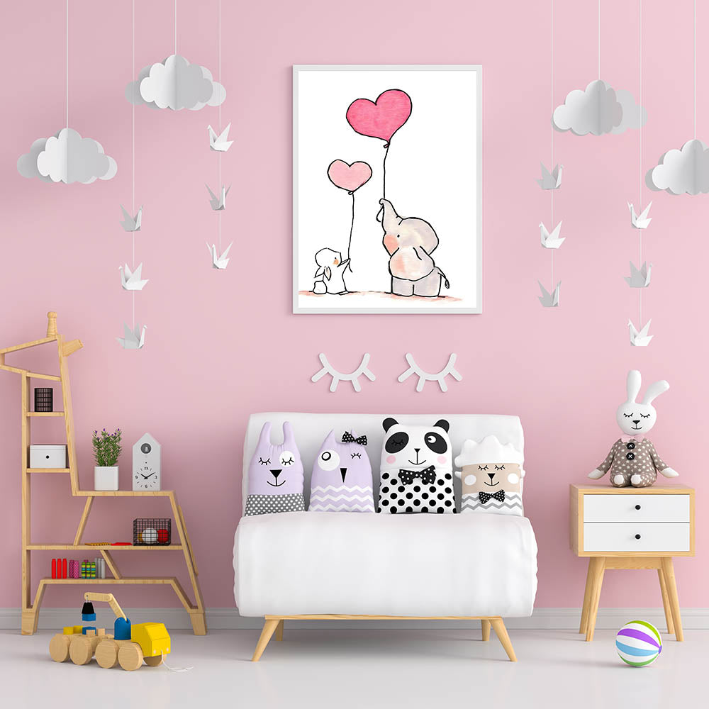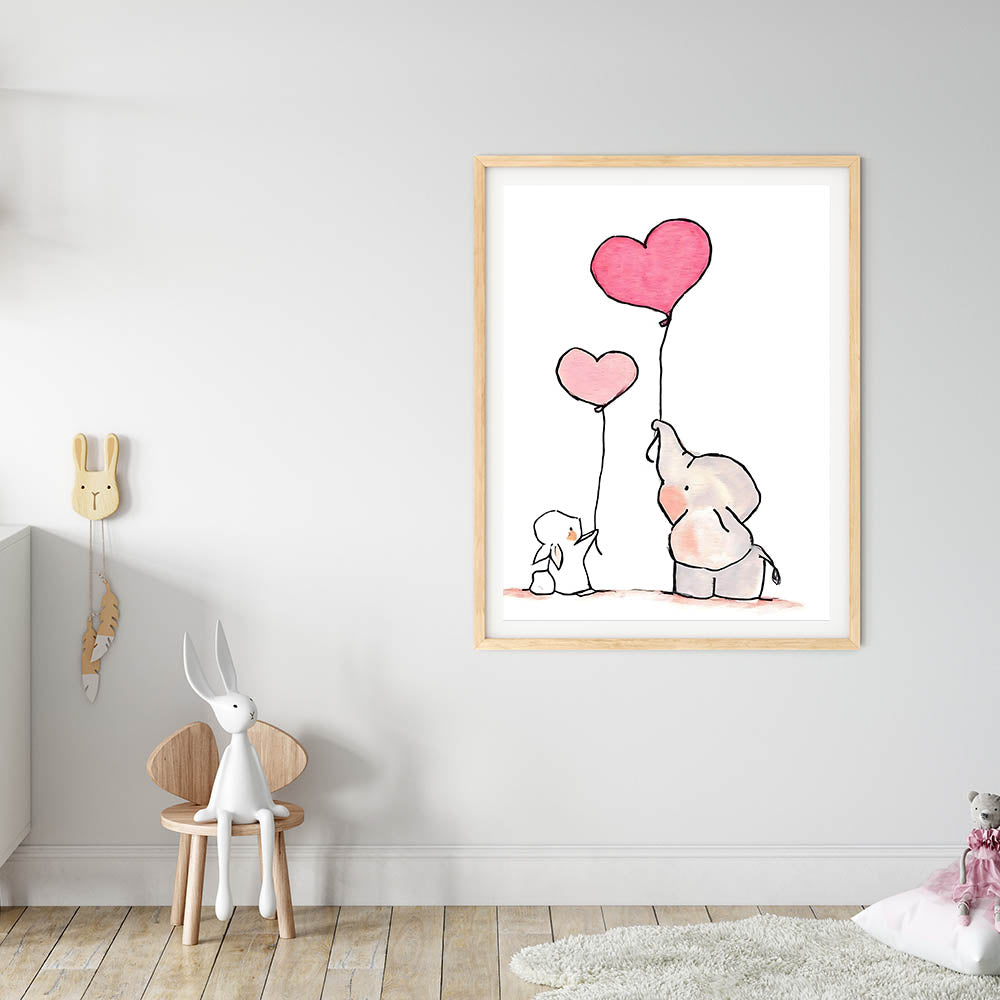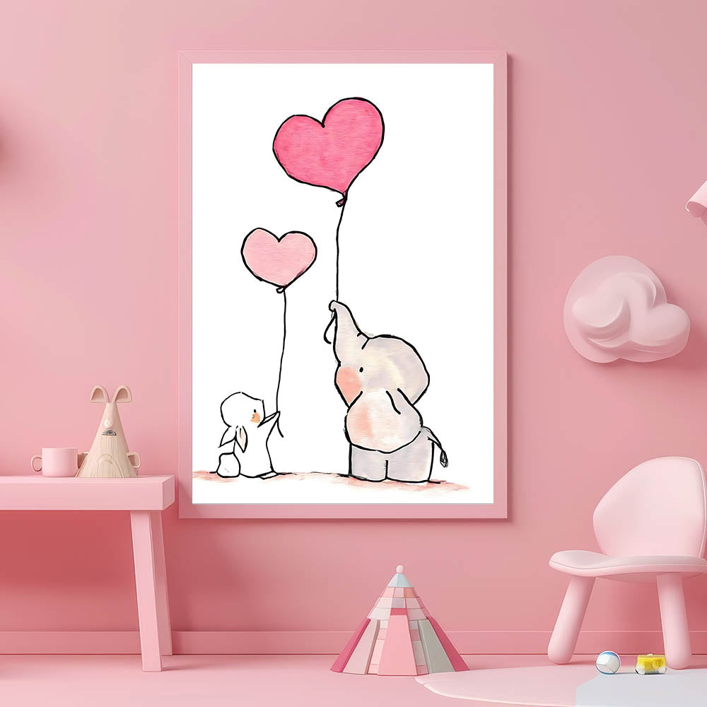Add a touch of sweetness and friendship to your child’s space with this adorable elephant and bunny wall art. Featuring a gentle elephant and bunny holding heart-shaped balloons, this delightful illustration symbolizes love, kindness, and joy. The soft watercolor effect and minimalist design make it a perfect fit for a girls' bedroom, nursery, or playroom.