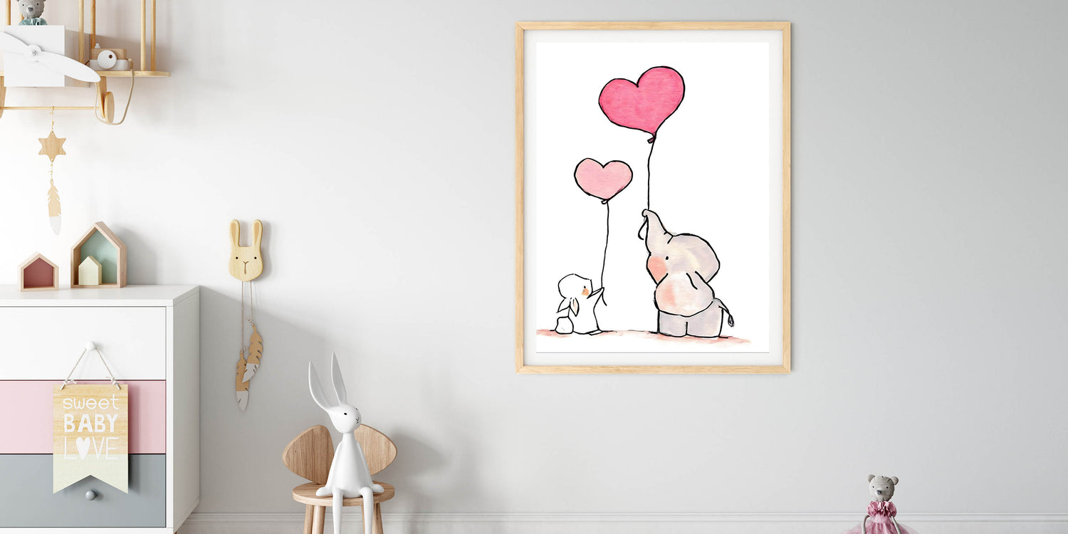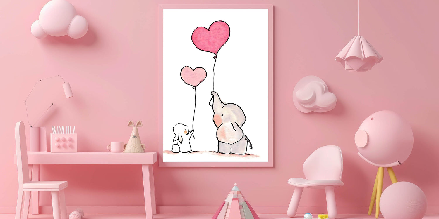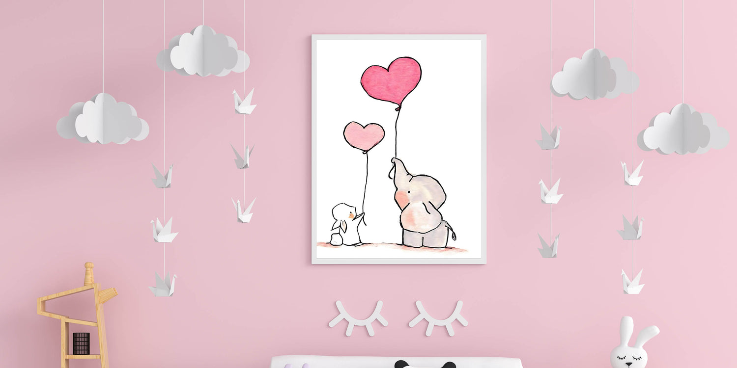 Add a touch of sweetness and friendship to your child’s space with this adorable elephant and bunny wall art. Featuring a gentle elephant and bunny holding heart-shaped balloons, this delightful illustration symbolizes love, kindness, and joy. The soft watercolor effect and minimalist design make it a perfect fit for a girls' bedroom, nursery, or playroom.