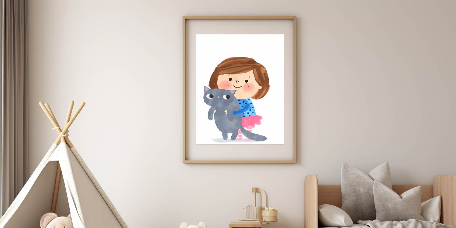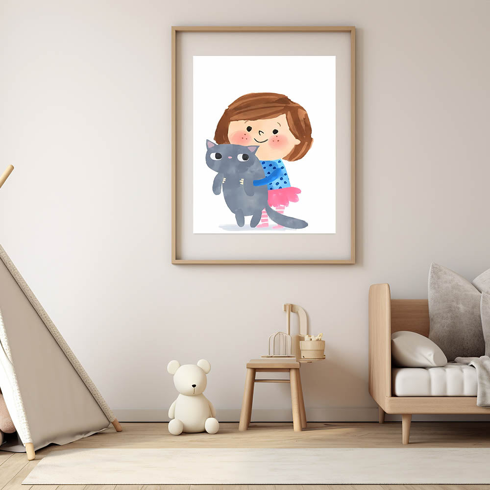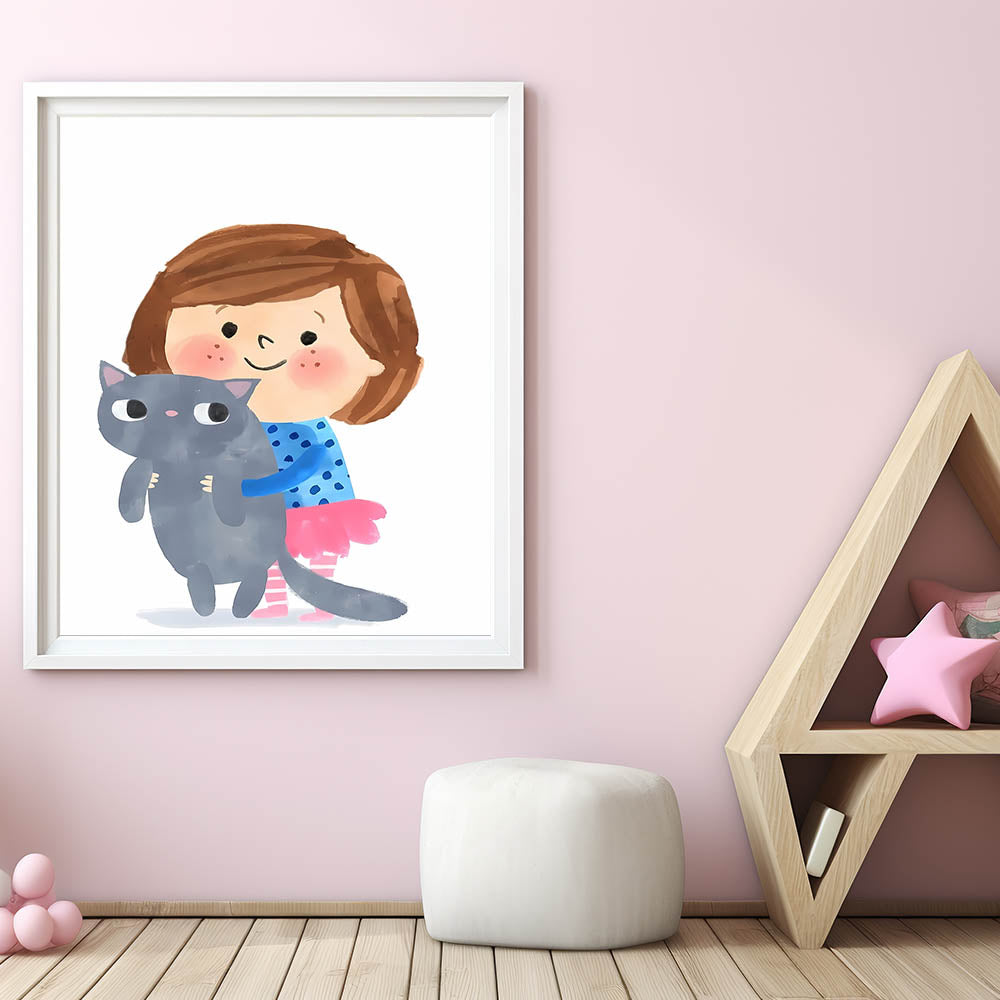 Add a sweet and playful touch to your child’s space with this adorable girl holding a cat wall art. Featuring a smiling young girl hugging her fluffy gray cat, this charming illustration captures the essence of love and companionship. The soft watercolor strokes and cheerful colors make this artwork perfect for a girls' bedroom, nursery, or playroom.