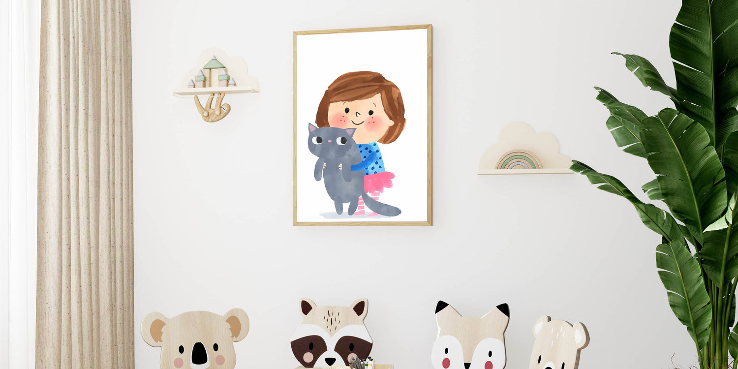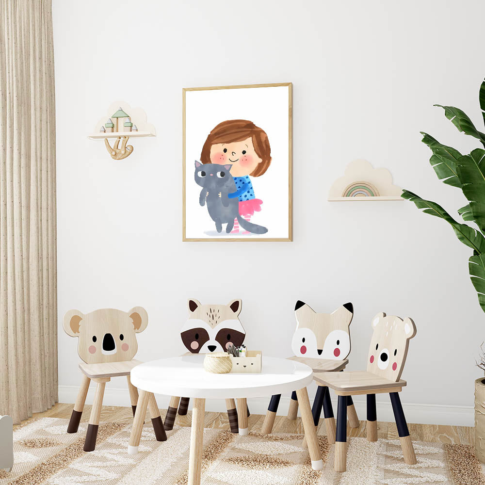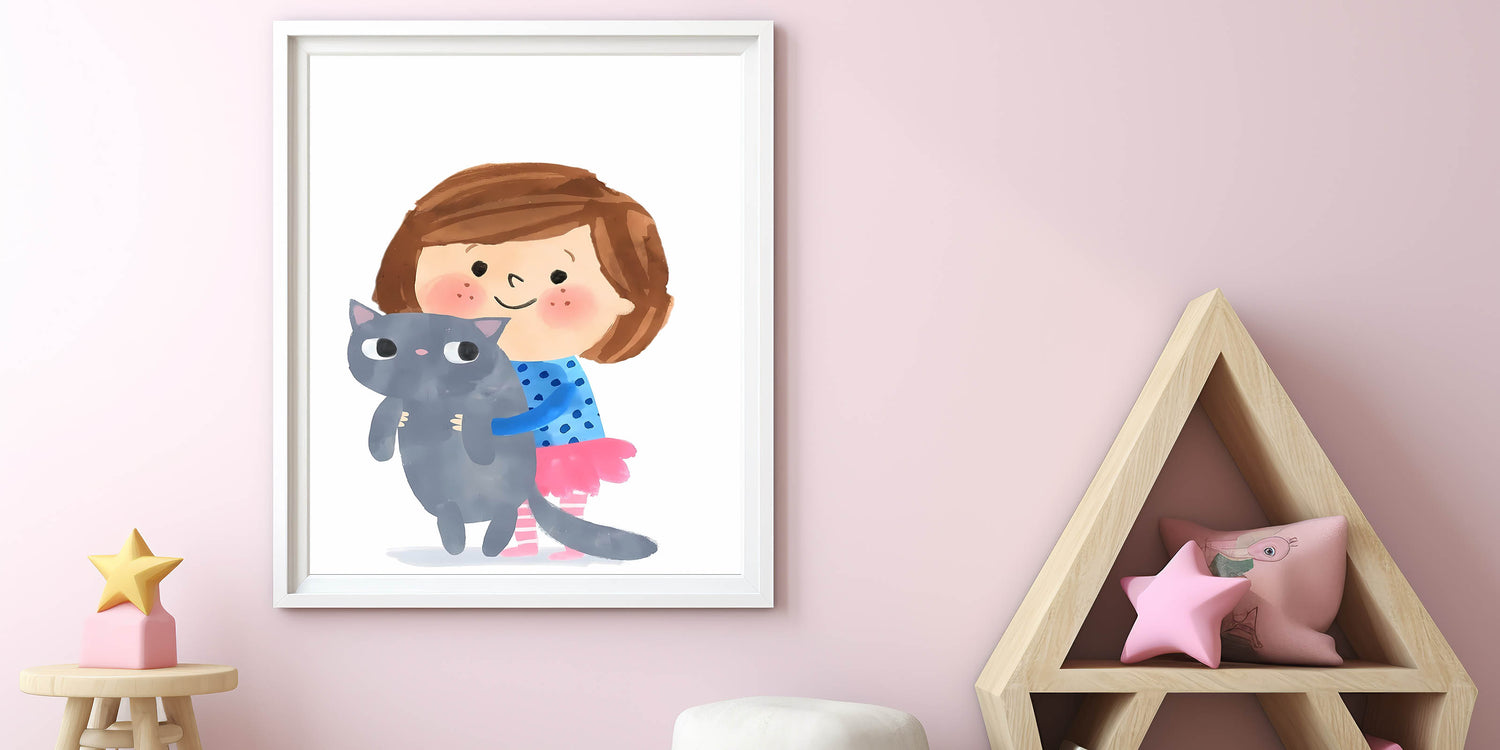 Add a sweet and playful touch to your child’s space with this adorable girl holding a cat wall art. Featuring a smiling young girl hugging her fluffy gray cat, this charming illustration captures the essence of love and companionship. The soft watercolor strokes and cheerful colors make this artwork perfect for a girls' bedroom, nursery, or playroom.