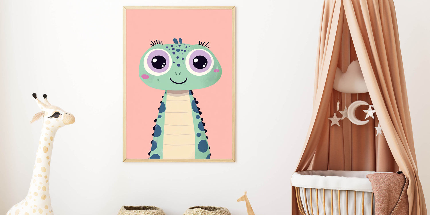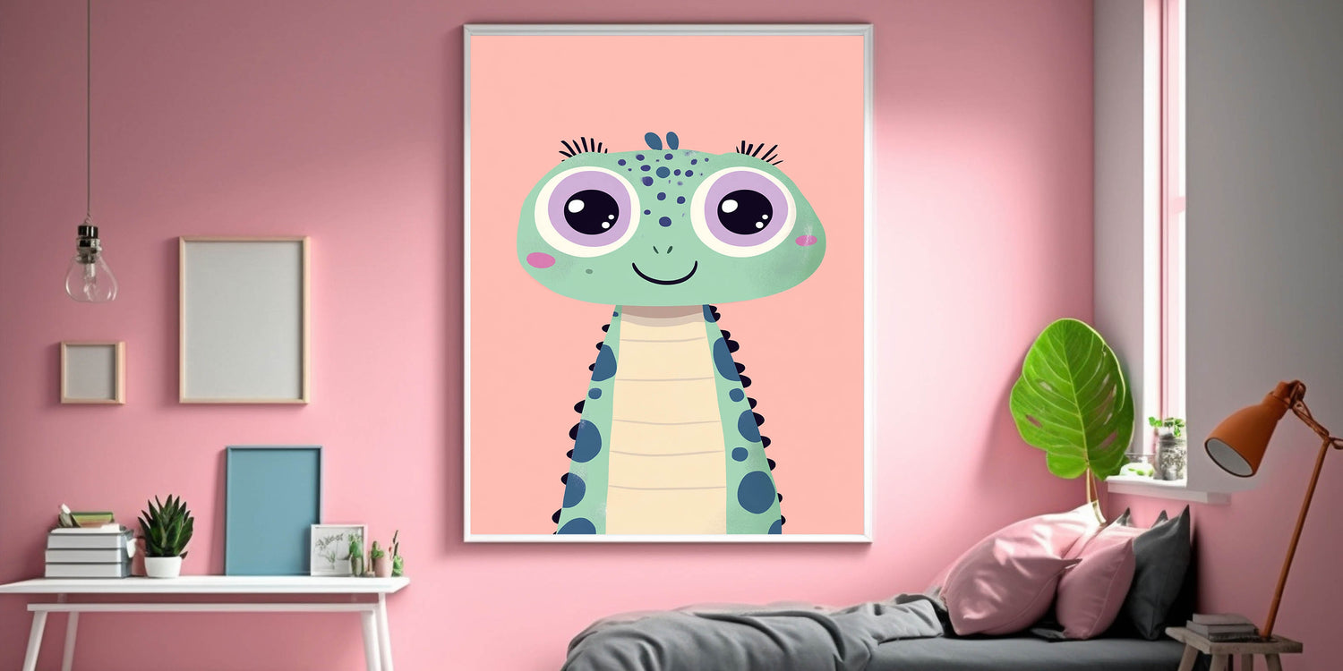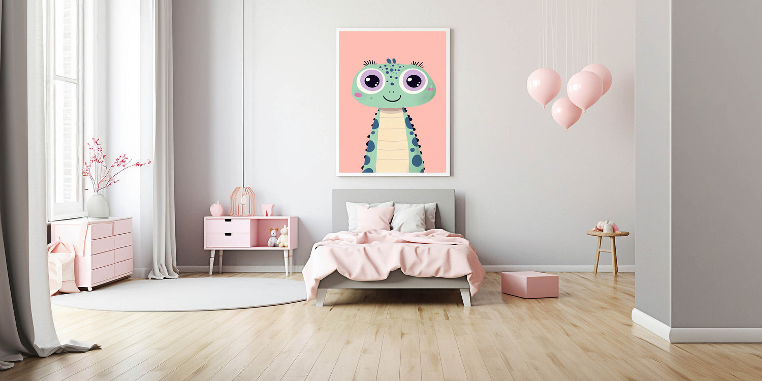 Brighten up your little one’s space with this adorable green dinosaur wall art, designed to add a fun and playful touch to any girls' bedroom, nursery, or playroom. The artwork features a charming green dinosaur with big, expressive purple eyes, delicate eyelashes, and a soft pink blush, set against a warm pink background. Its cute and friendly look makes it an ideal addition to children's wall decor and a great way to spark imagination.