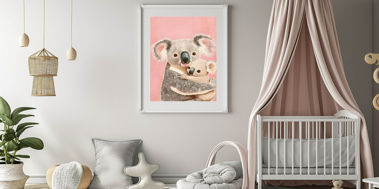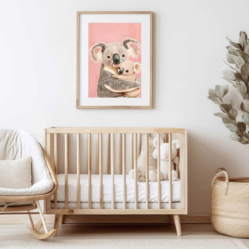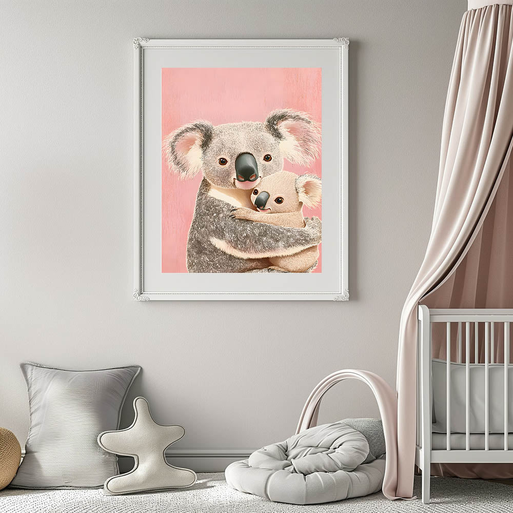 Create a heartwarming and cozy atmosphere with this koala nursery wall art. This charming illustration features a loving mother koala embracing her baby against a soft pink background, making it the perfect baby room decor piece. The gentle colors and detailed fur texture add warmth and comfort to any children’s wall art collection.