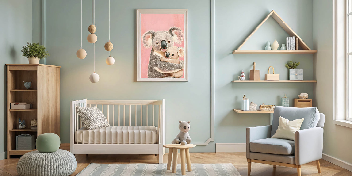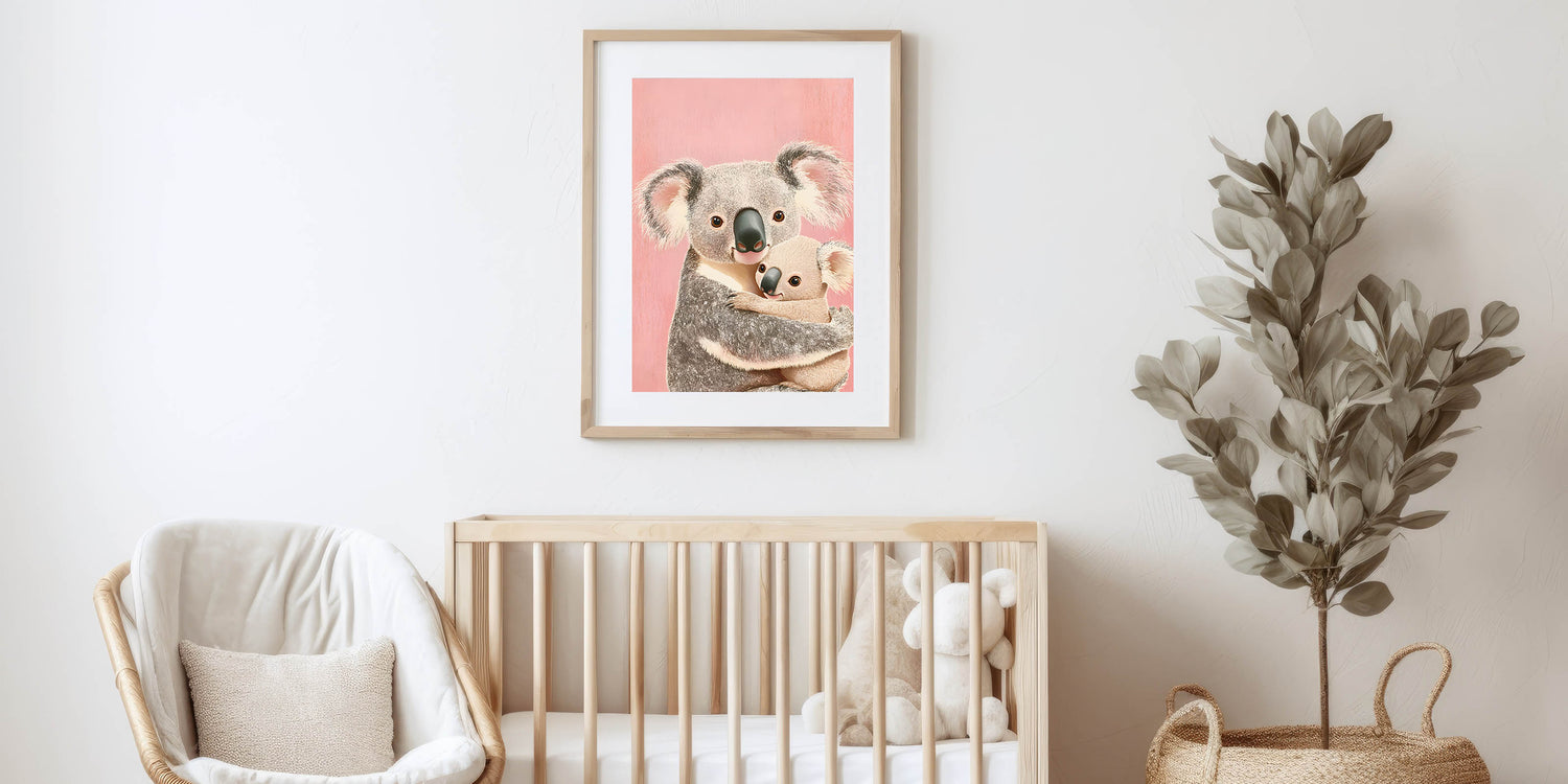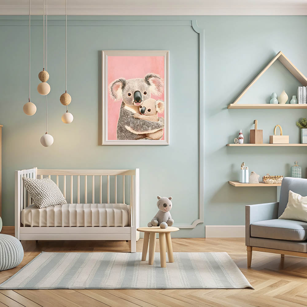 Create a heartwarming and cozy atmosphere with this koala nursery wall art. This charming illustration features a loving mother koala embracing her baby against a soft pink background, making it the perfect baby room decor piece. The gentle colors and detailed fur texture add warmth and comfort to any children’s wall art collection.