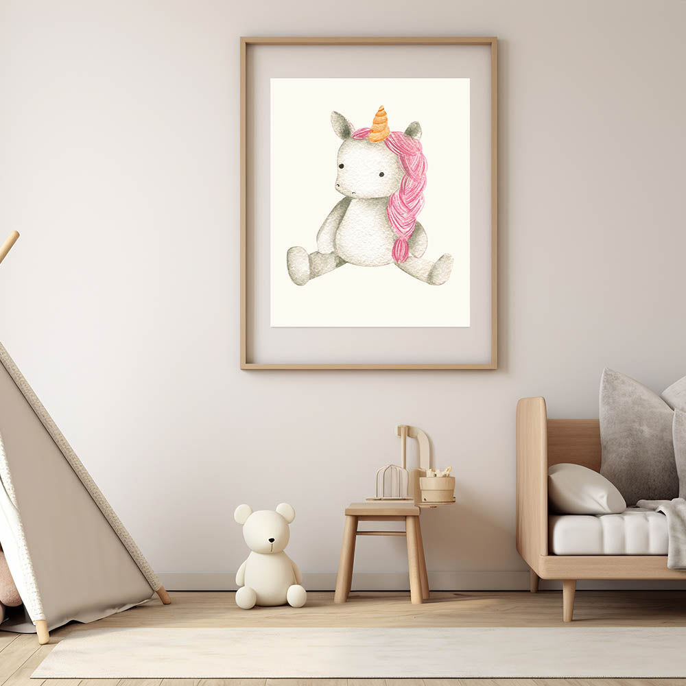 Add a touch of magic to your child’s space with this adorable plush unicorn nursery wall art. Featuring a soft watercolor-style unicorn with a pink braided mane and golden horn, this artwork brings a dreamy and comforting atmosphere to any nursery or playroom. Its minimalistic yet charming design makes it a perfect choice for children's wall decor.