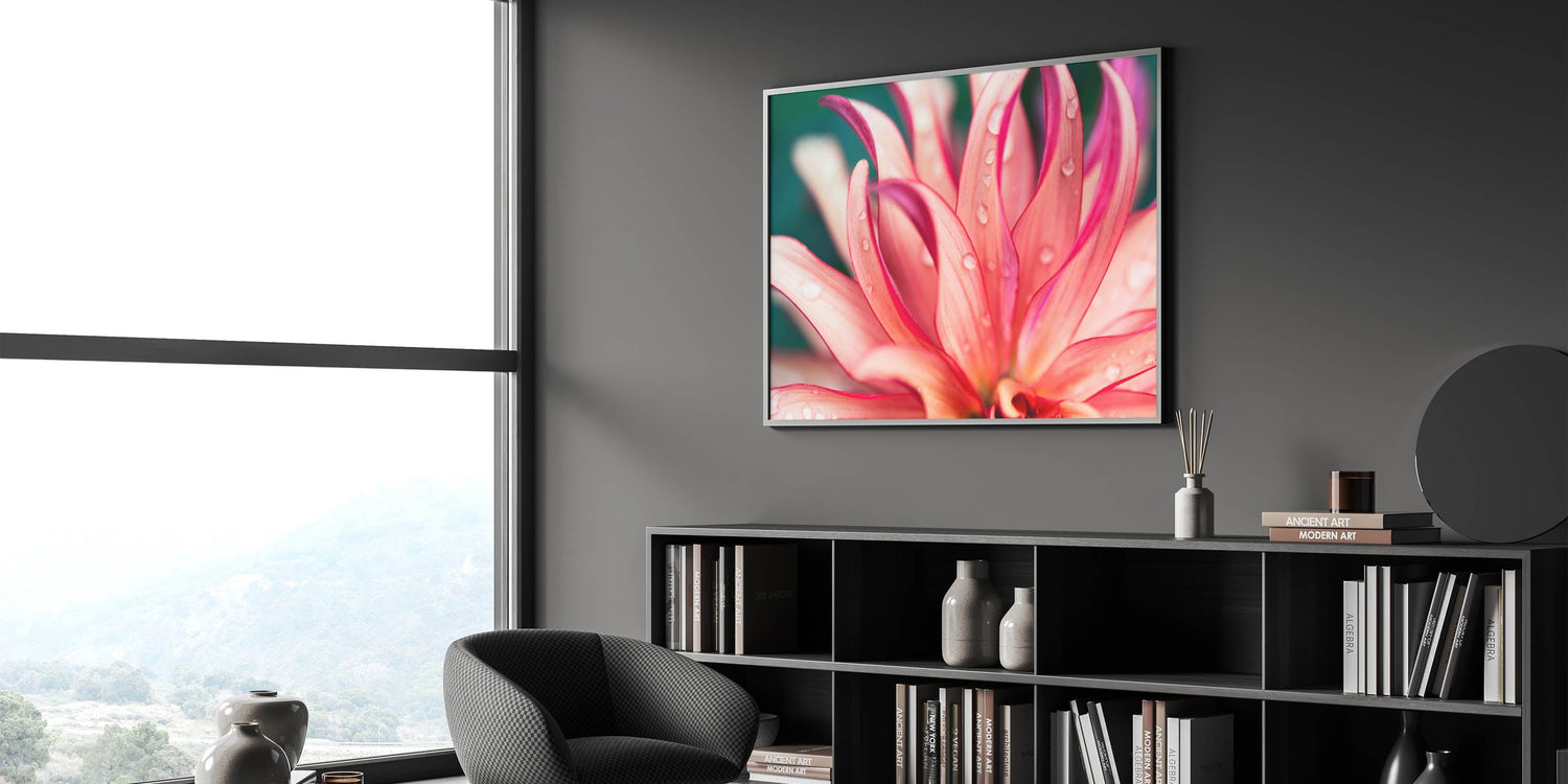 Add a touch of natural elegance to your space with this breathtaking fine art photography limited edition print. Featuring a close-up macro shot of a delicate dahlia flower, this artwork showcases soft pink and orange hues with water droplets accentuating its intricate petals.