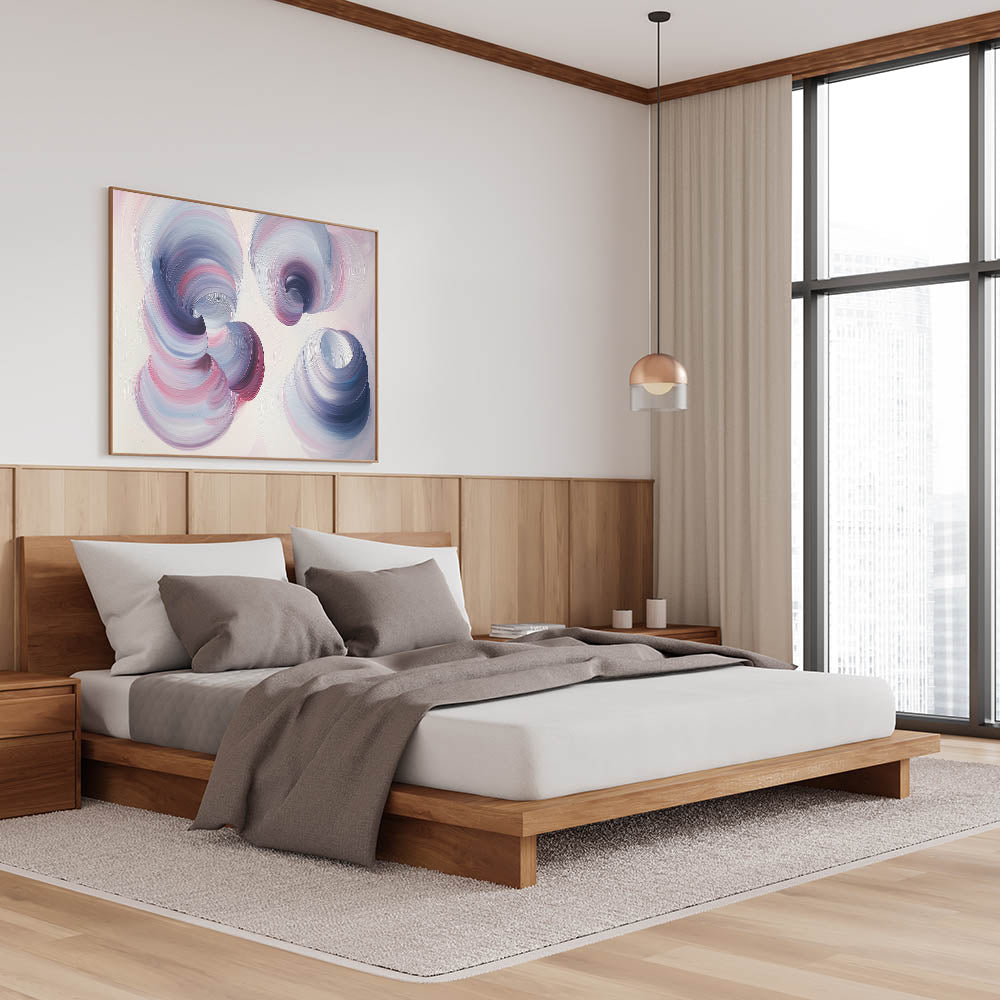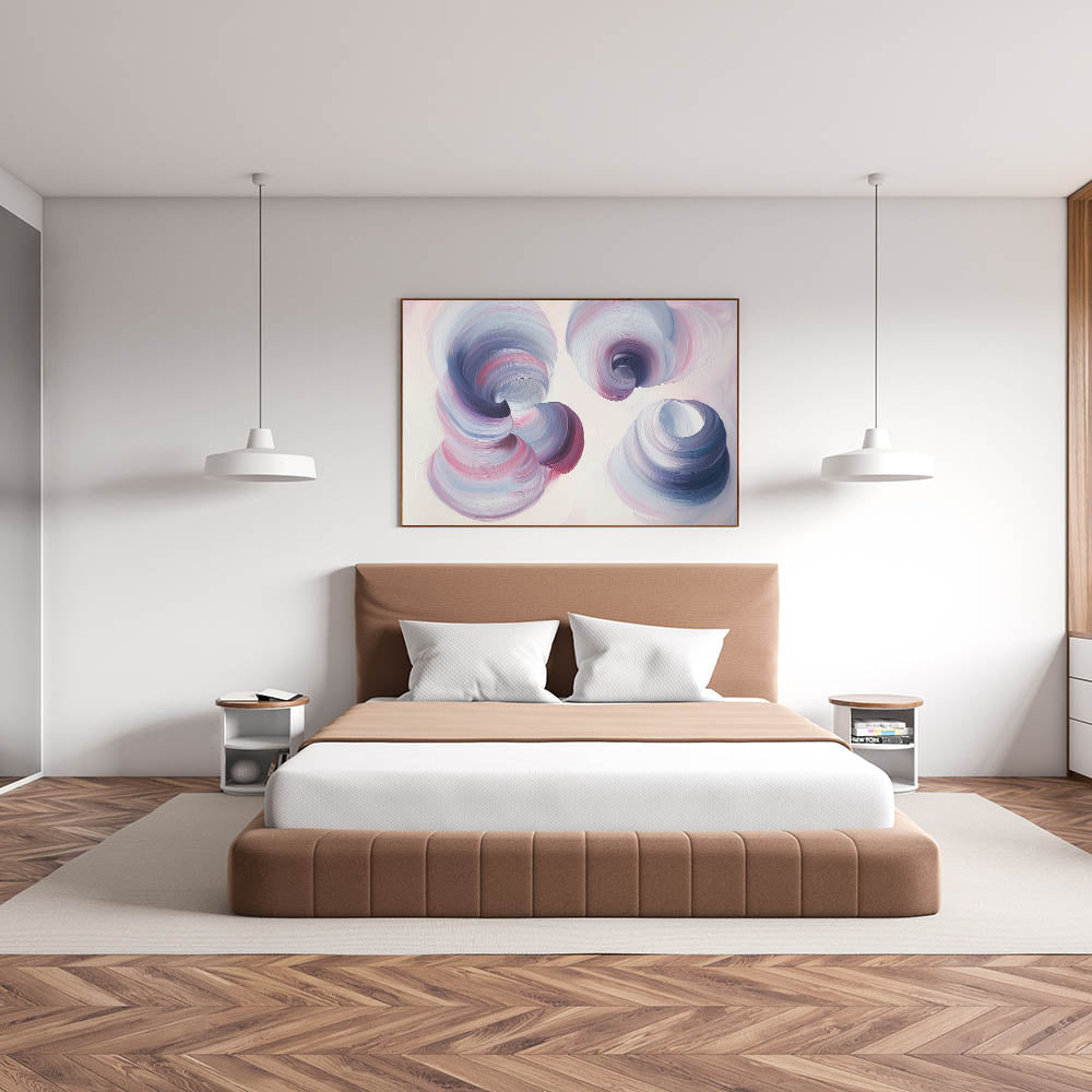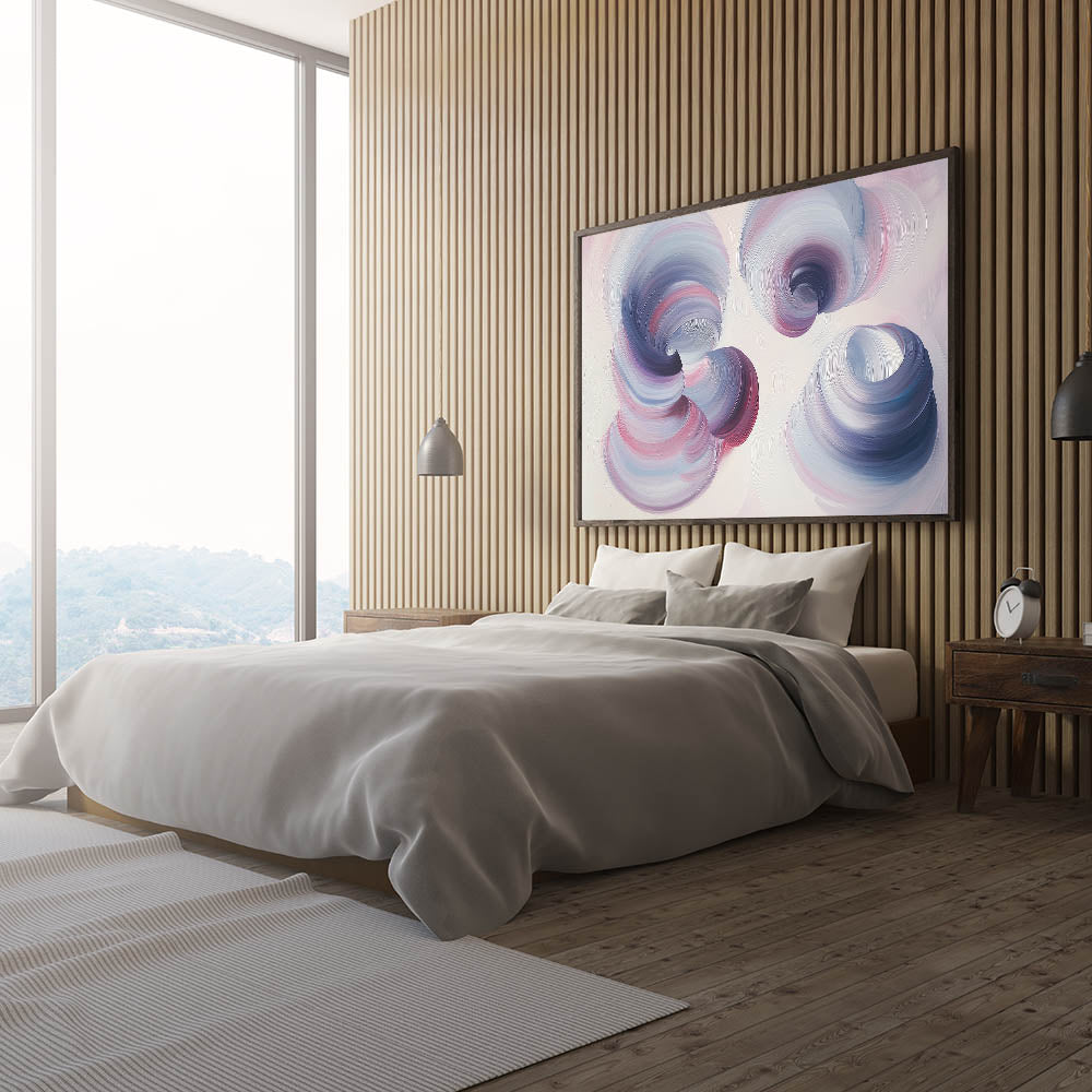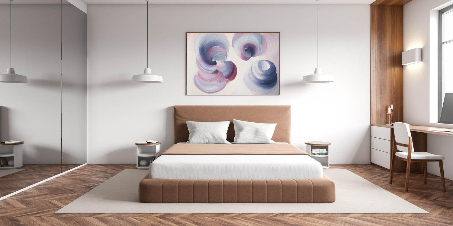 Transform your bedroom into a serene and elegant retreat with this dreamy swirl bedroom wall art, featuring soft, flowing brushstrokes in lilac, pastel pink, and muted blue. The ethereal motion and delicate color palette create a soothing and contemporary aesthetic, making this artwork a perfect addition to modern and minimalist interiors. This customizable bedroom wall art blends gentle hues with dynamic movement, offering a captivating yet peaceful atmosphere for your space.