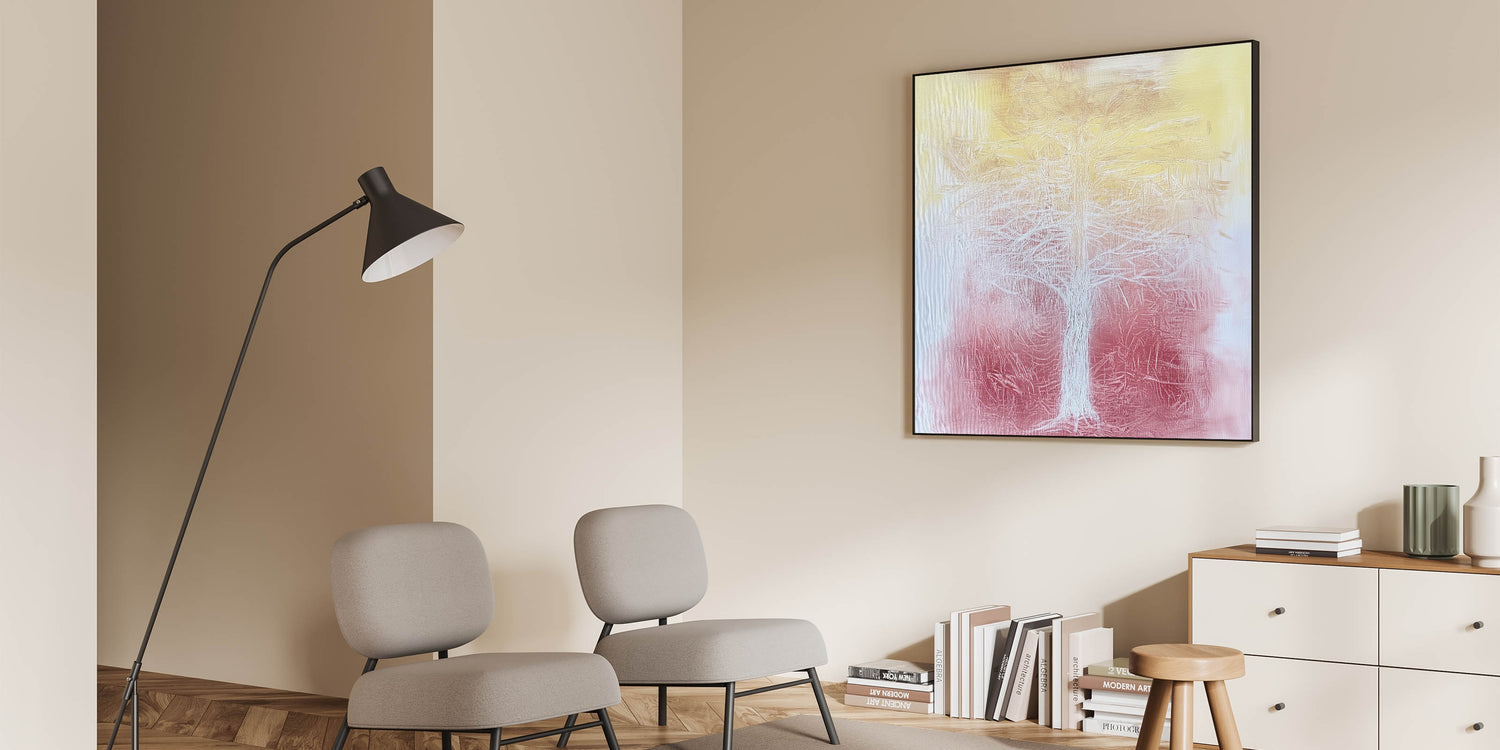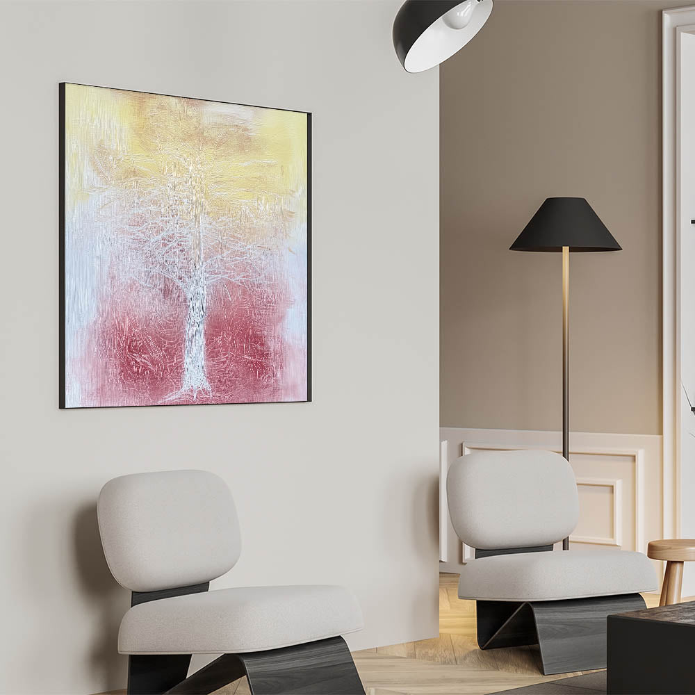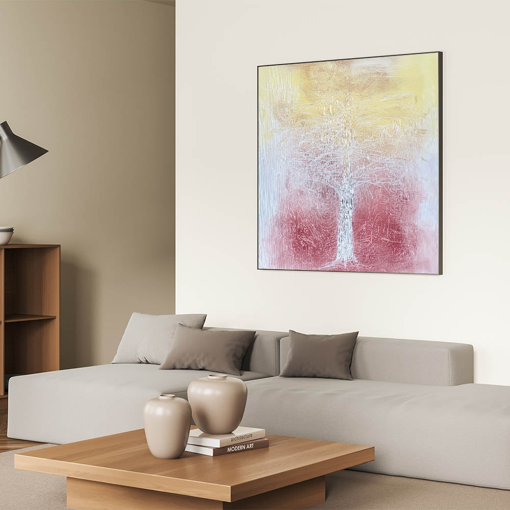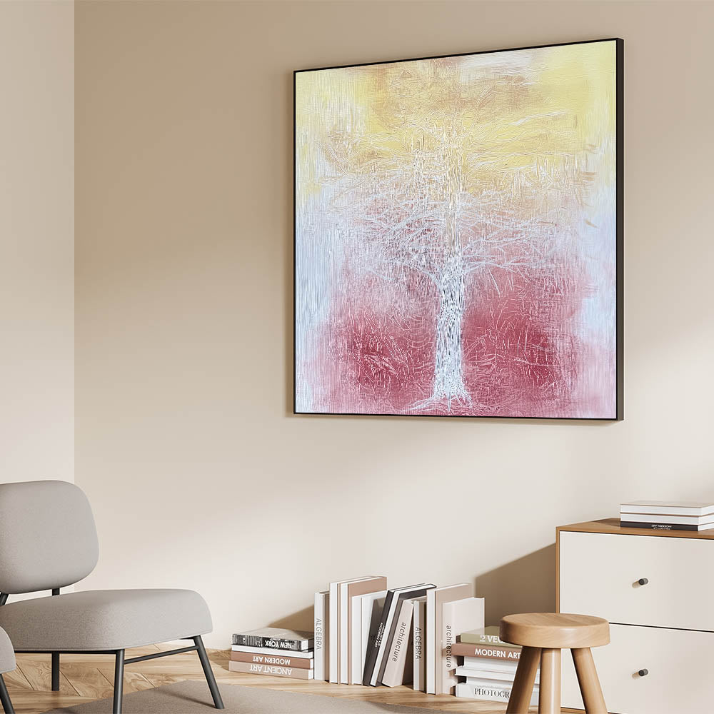 Elevate your space with the gentle beauty of this abstract floral artwork, featuring a delicate white tree set against a soft gradient of yellow and pink. The textured design and dreamy color palette create a serene and sophisticated atmosphere, making this artwork perfect for both modern and classic interiors.