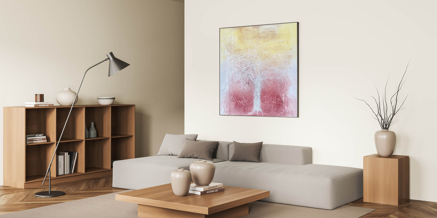 - Soft and Subtle Colors: The blend of warm yellow and soft pink hues with a striking white tree creates a tranquil and inviting design.