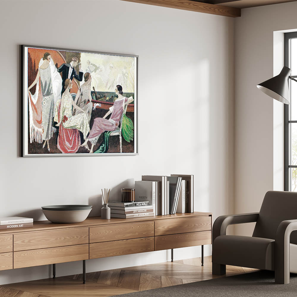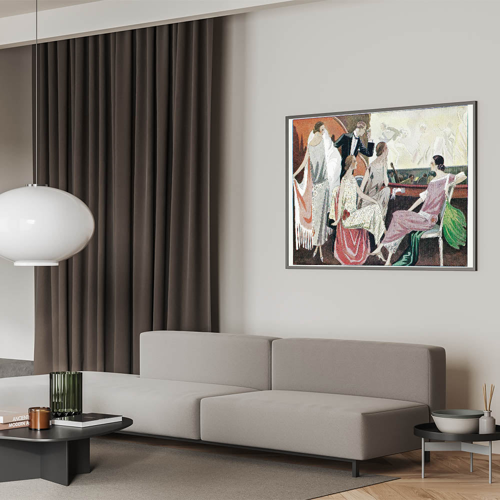 This captivating Art Deco wall art transports you to a glamorous 1920s theater scene, capturing the essence of vintage elegance and sophistication. Featuring elegantly dressed figures in refined evening attire, this artwork is a tribute to the opulence of the Art Deco era. The soft colors and intricate details make it a statement piece for any space, perfect for adding a touch of nostalgia and style to your décor.