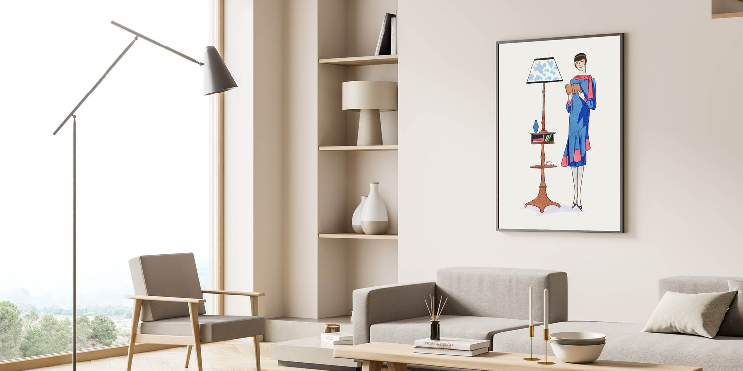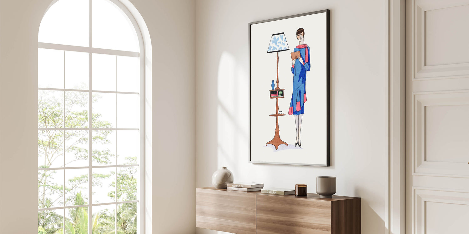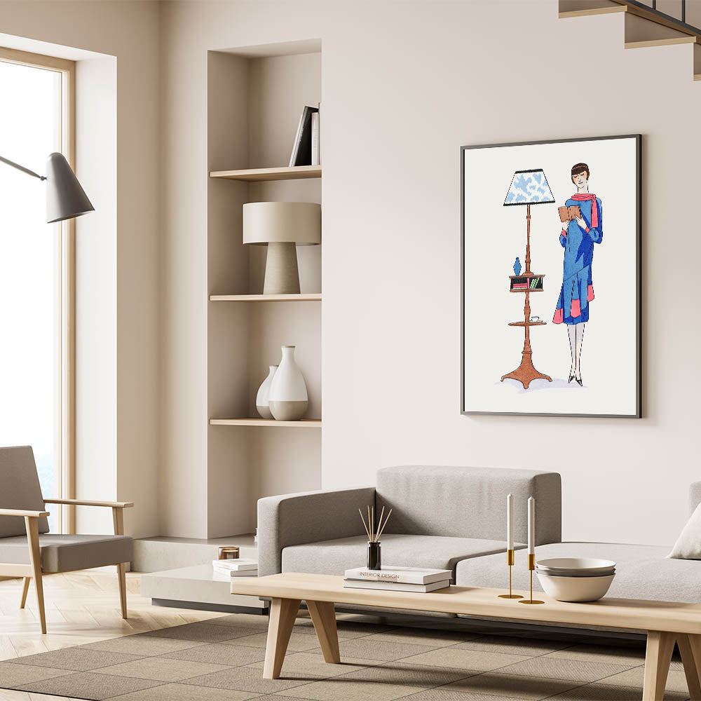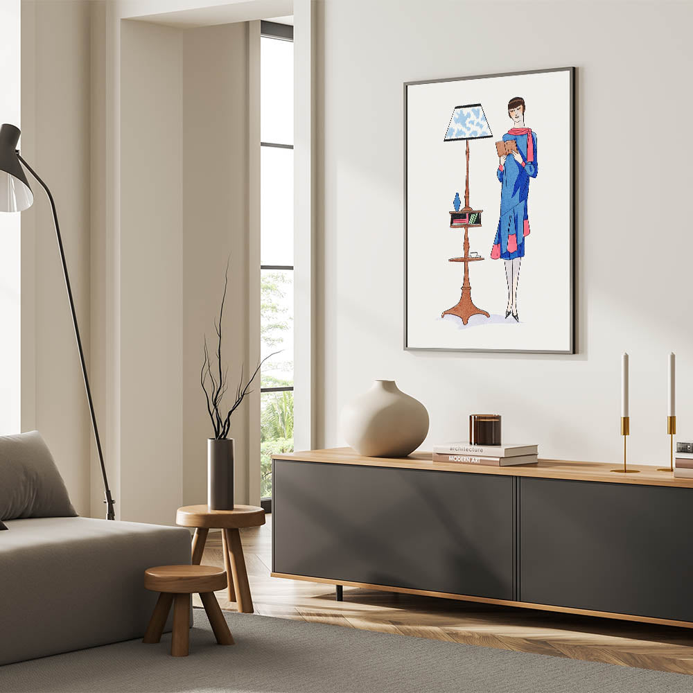 Step into the elegance of the 1920s with this charming Art Deco wall art featuring a stylish woman engrossed in a book. Dressed in a vibrant blue outfit with pink accents, she stands beside a classic reading lamp and a wooden shelf, evoking a sense of sophistication and leisure. The bold colors and whimsical design make this piece a delightful addition to any room, from a cozy reading nook to a contemporary living space.