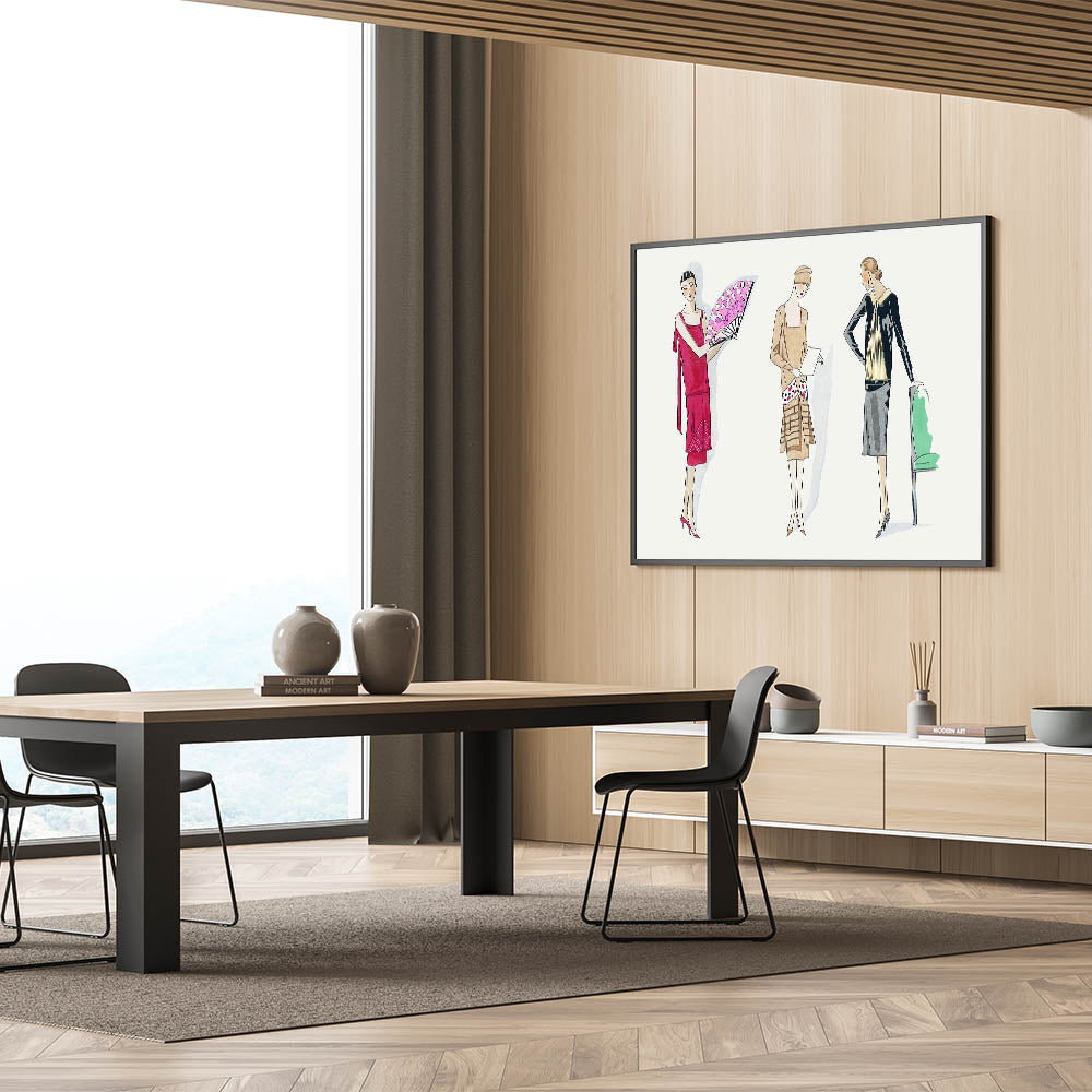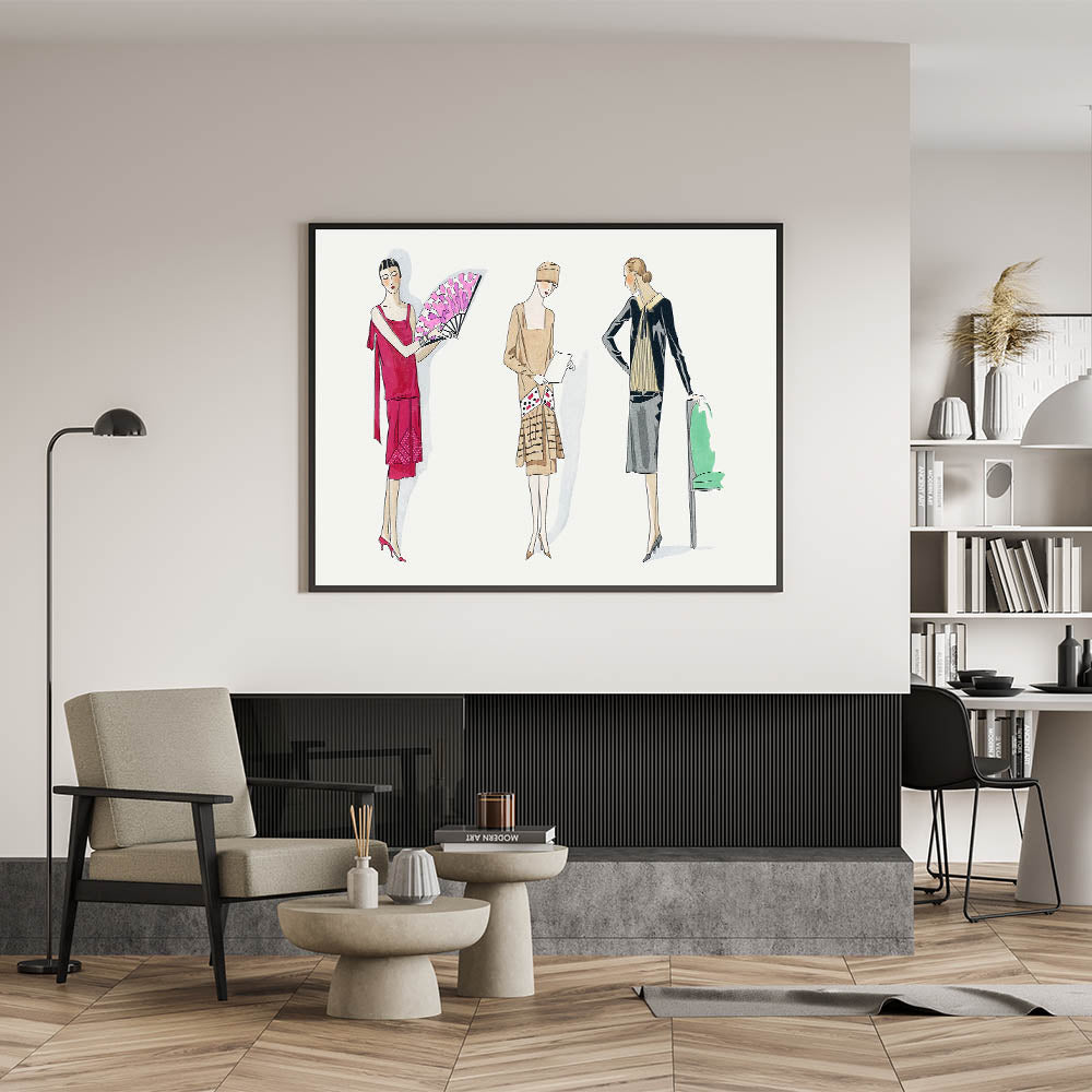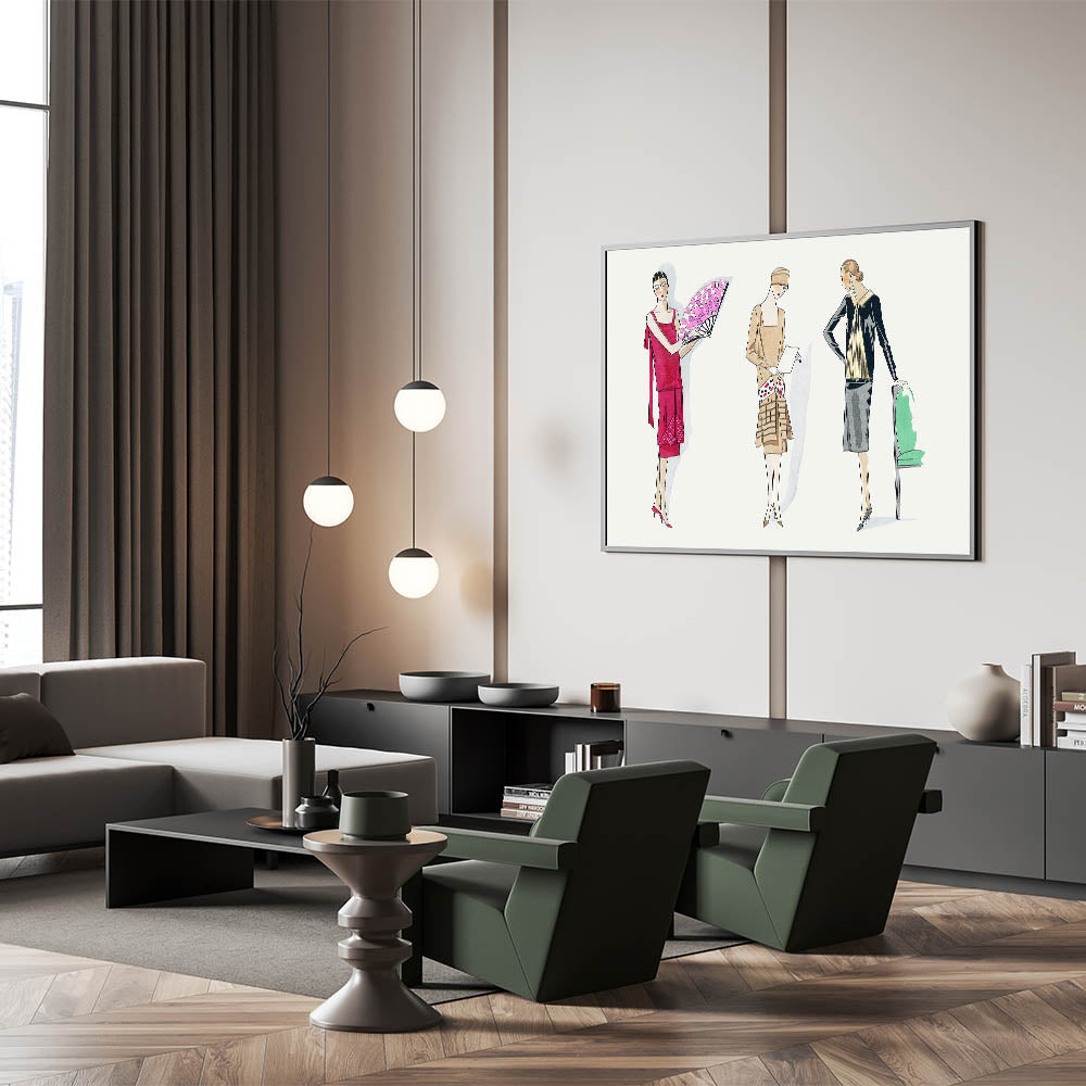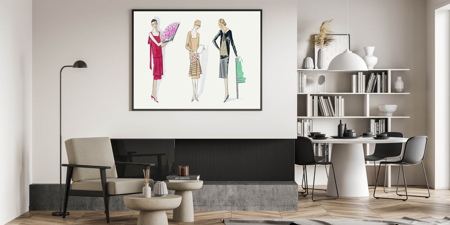 Celebrate the sophistication of 1920s fashion with this Art Deco wall art featuring a trio of elegantly dressed women. Each figure showcases unique, stylish attire: a woman in a vibrant pink dress holding a fan, another in a chic tan ensemble, and a third in a sleek black outfit. The illustration captures the grace and elegance of the Art Deco era, with soft pastels and bold shades bringing the scene to life. Perfect for fashion enthusiasts and lovers of vintage style, this artwork adds a refined, timeless charm to any space.