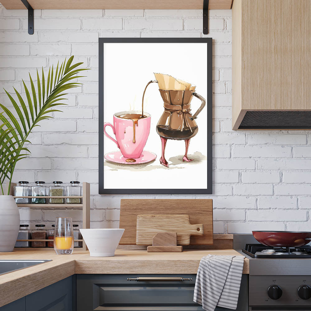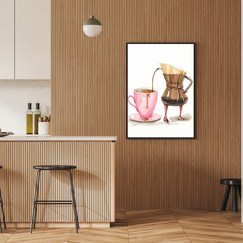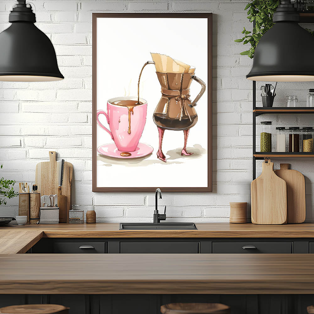 Start your day with style and a touch of humor with this coffee wall art featuring a chic, anthropomorphic coffee carafe gracefully pouring into a pink mug. The whimsical high-heel details, warm brown tones, and delicate artistic rendering make this beverage wall art a perfect addition to kitchen art decor, coffee stations, and cozy café spaces. Whether you’re a coffee enthusiast or simply enjoy playful and creative artwork, this print adds personality and charm to any space.