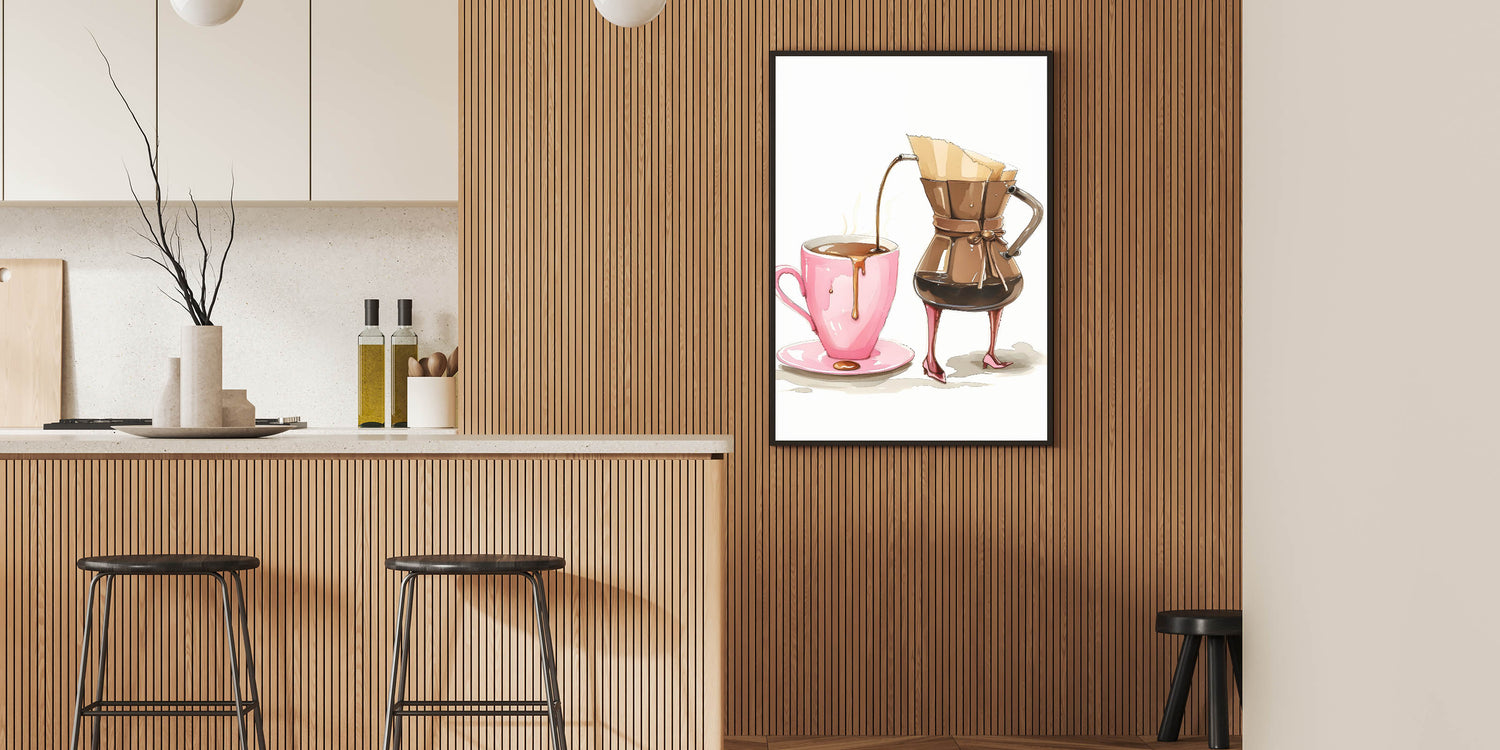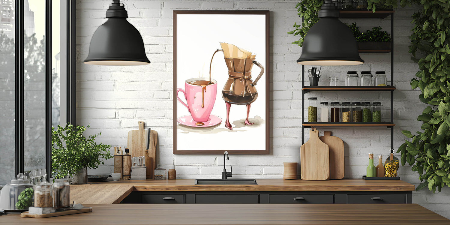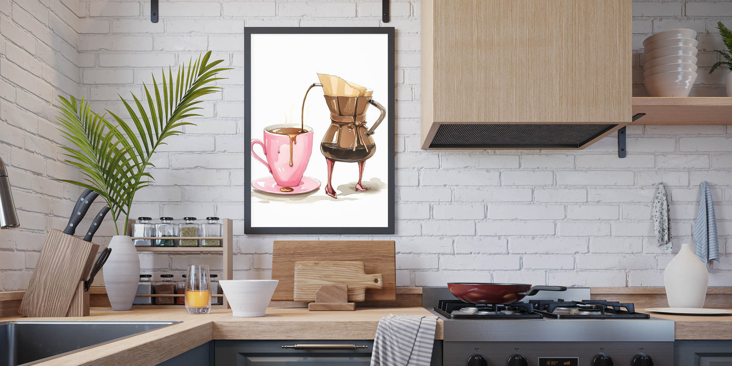 Start your day with style and a touch of humor with this coffee wall art featuring a chic, anthropomorphic coffee carafe gracefully pouring into a pink mug. The whimsical high-heel details, warm brown tones, and delicate artistic rendering make this beverage wall art a perfect addition to kitchen art decor, coffee stations, and cozy café spaces. Whether you’re a coffee enthusiast or simply enjoy playful and creative artwork, this print adds personality and charm to any space.