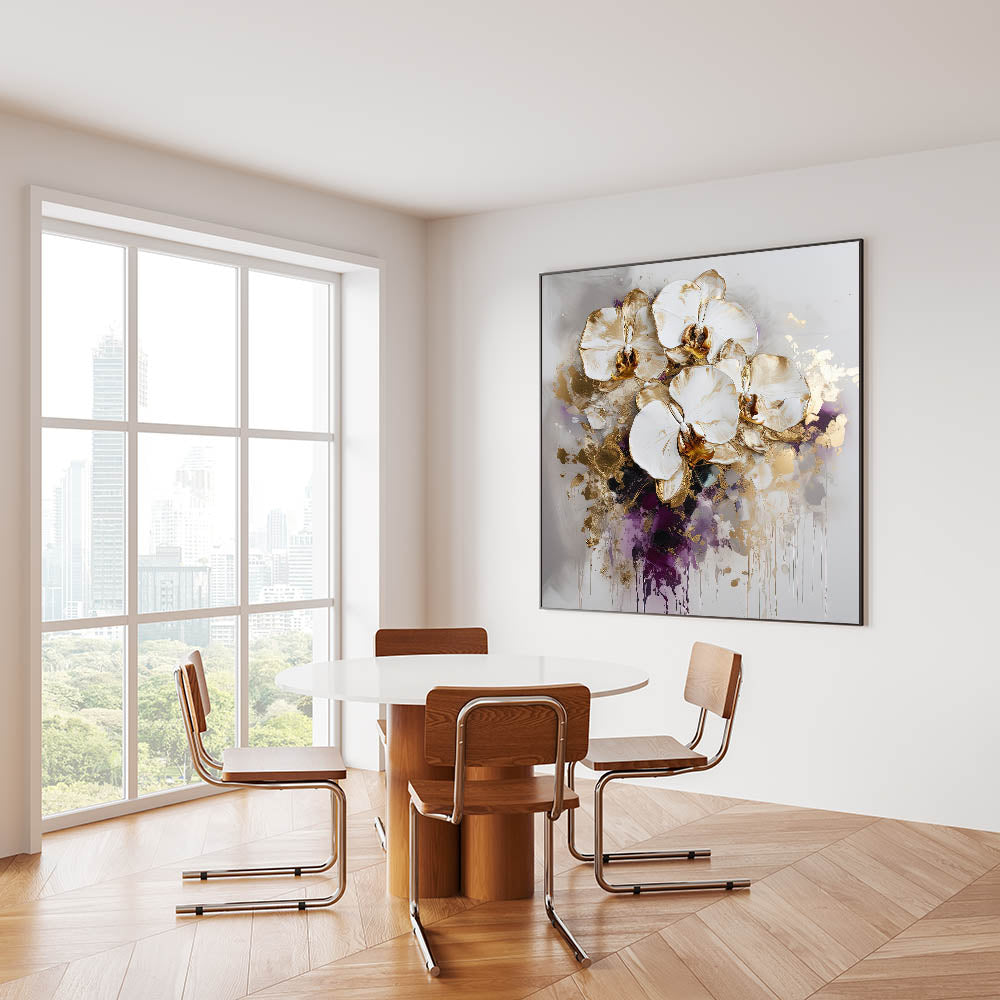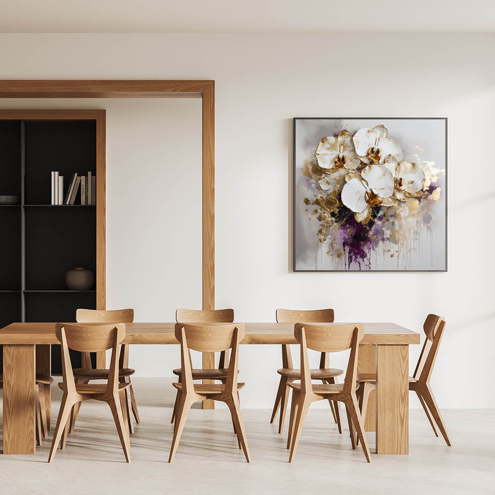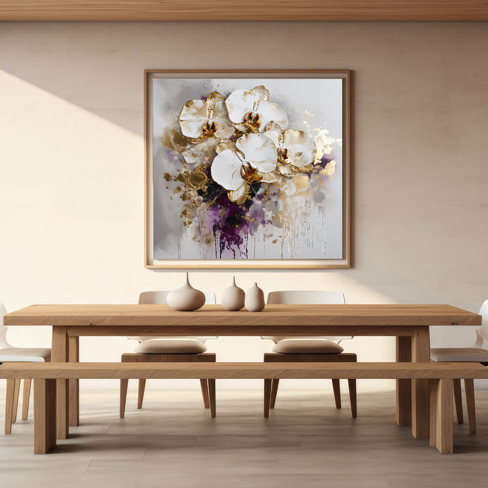 Enhance your dining space with this elegant dining room art print, featuring a breathtaking white and gold orchid painting with luxurious purple accents. The delicate floral details and rich metallic highlights make this artwork a stunning statement piece for modern and sophisticated dining room wall decor.