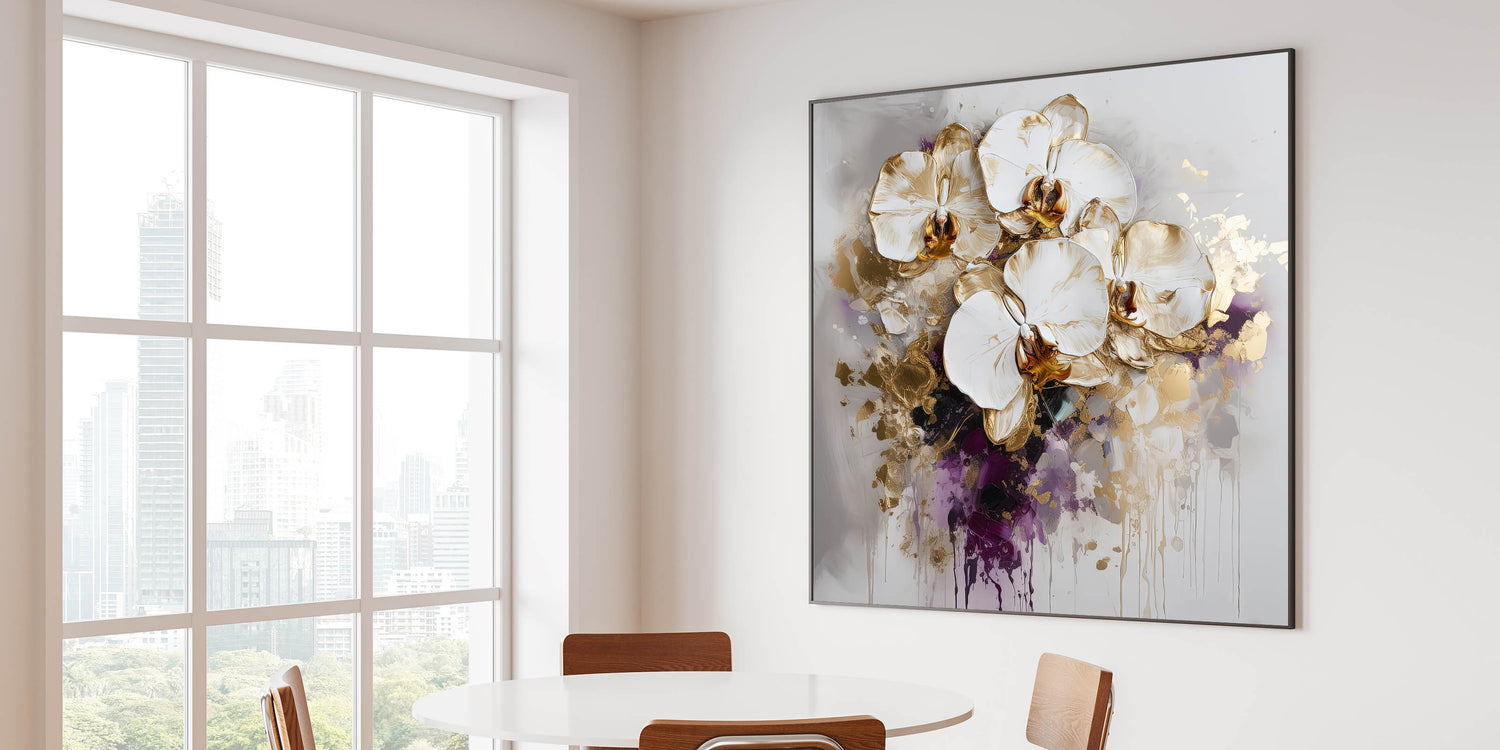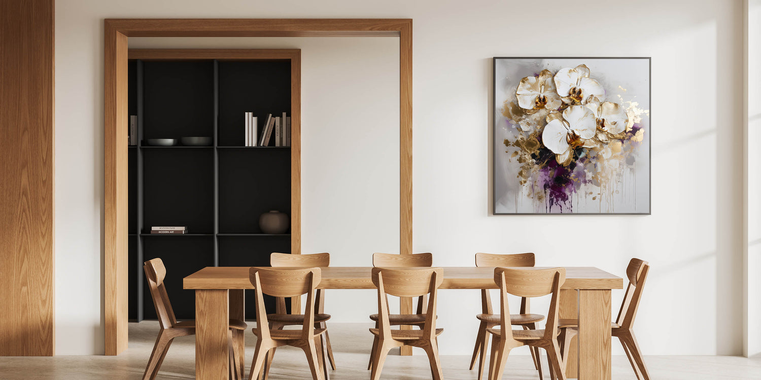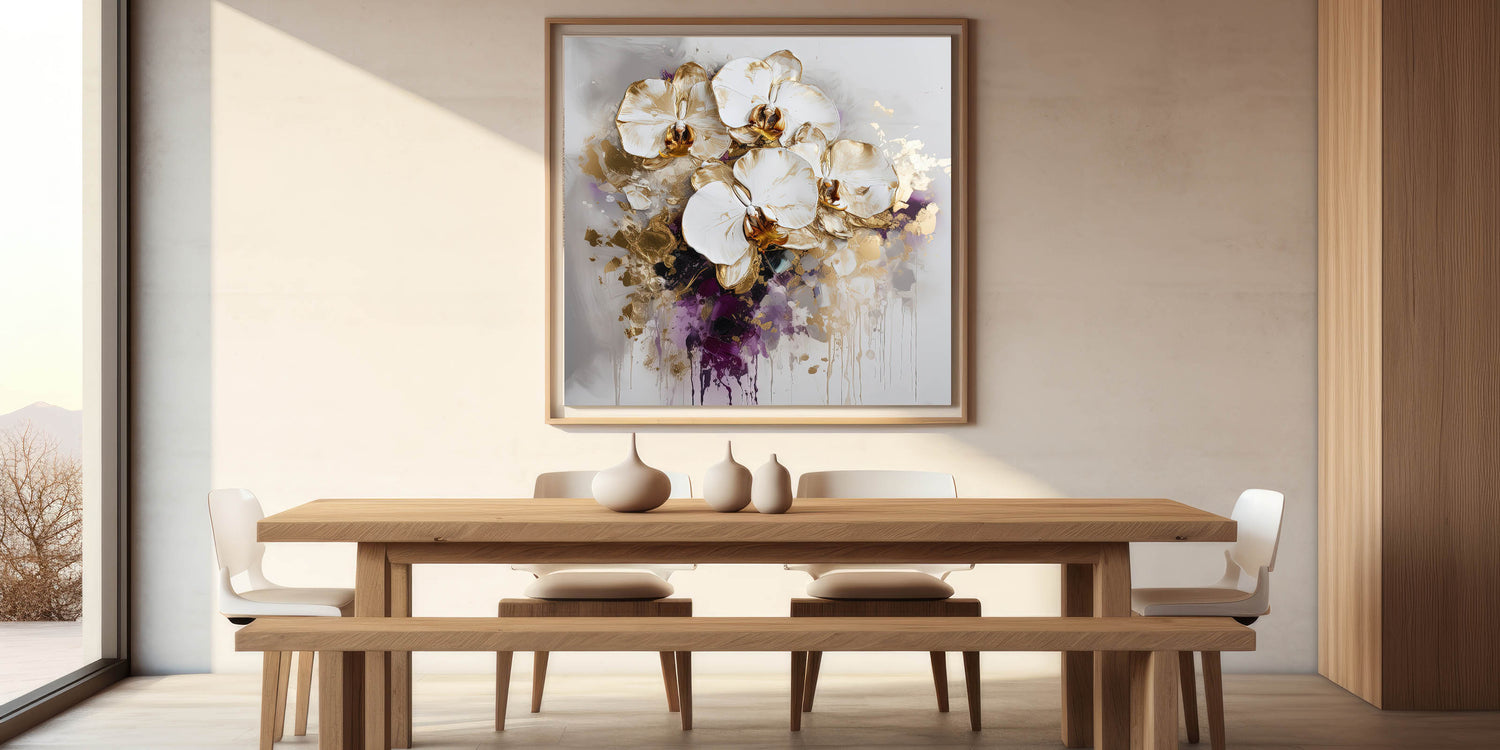 Enhance your dining space with this elegant dining room art print, featuring a breathtaking white and gold orchid painting with luxurious purple accents. The delicate floral details and rich metallic highlights make this artwork a stunning statement piece for modern and sophisticated dining room wall decor.