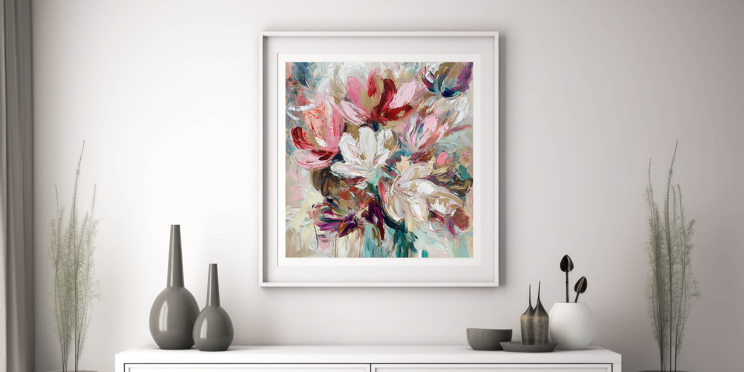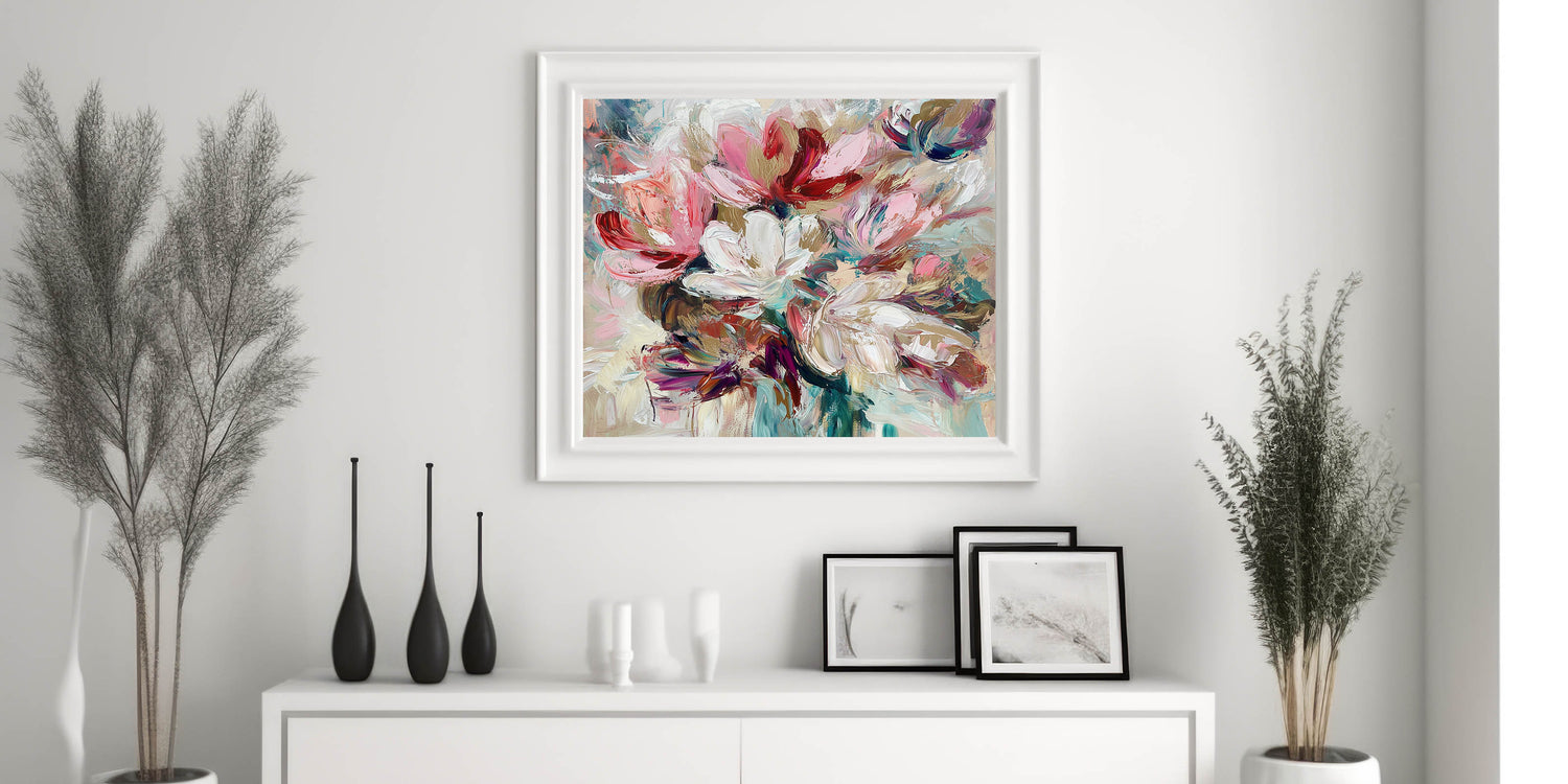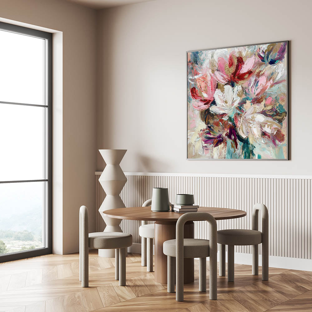 Add a touch of elegance and vibrancy to your modern living room decor with this stunning abstract floral wall art. Featuring a blend of soft pinks, bold reds, gold, and earthy tones, this artwork brings warmth, sophistication, and movement to any space. The expressive brushstrokes and textured layers create a visually striking composition, making it a perfect statement piece for contemporary interiors.