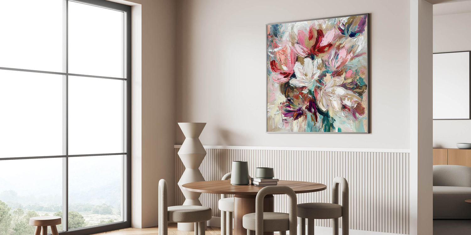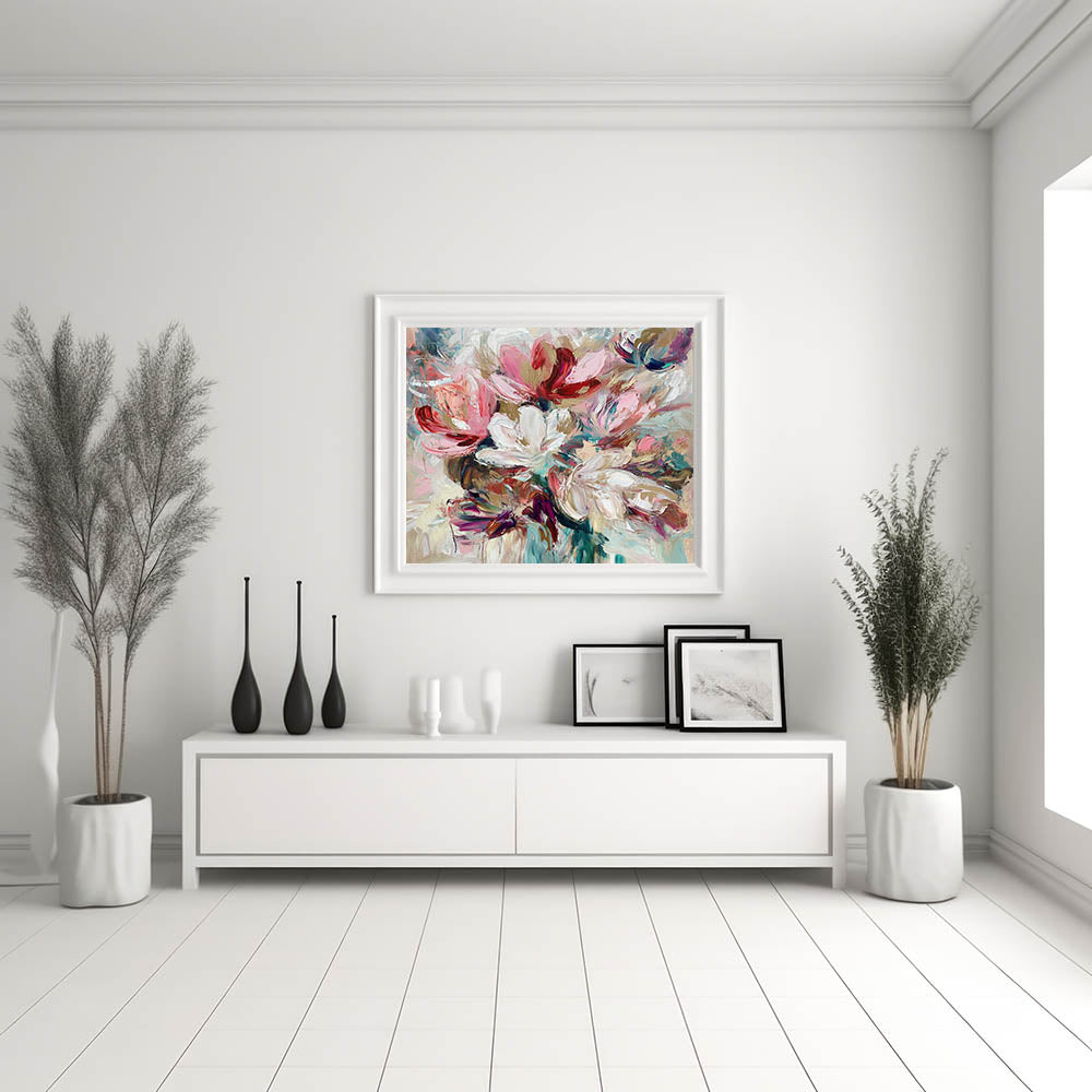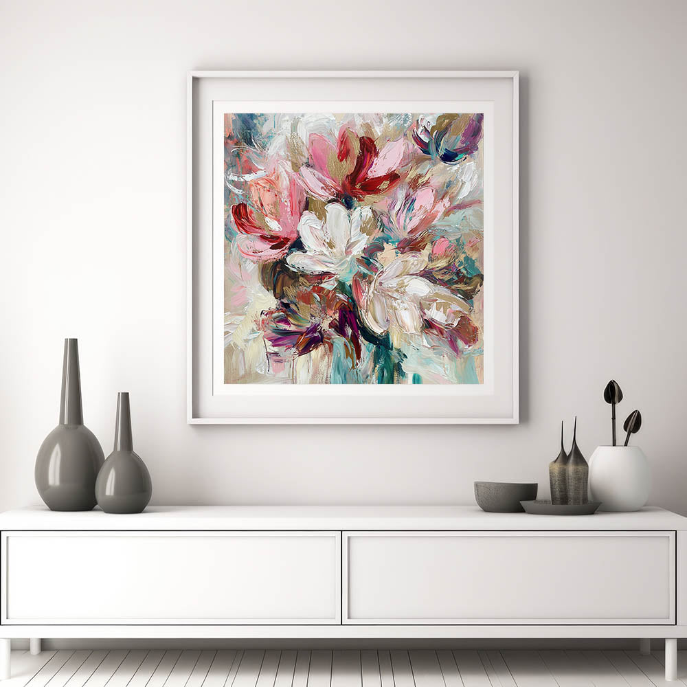 Add a touch of elegance and vibrancy to your modern living room decor with this stunning abstract floral wall art. Featuring a blend of soft pinks, bold reds, gold, and earthy tones, this artwork brings warmth, sophistication, and movement to any space. The expressive brushstrokes and textured layers create a visually striking composition, making it a perfect statement piece for contemporary interiors.