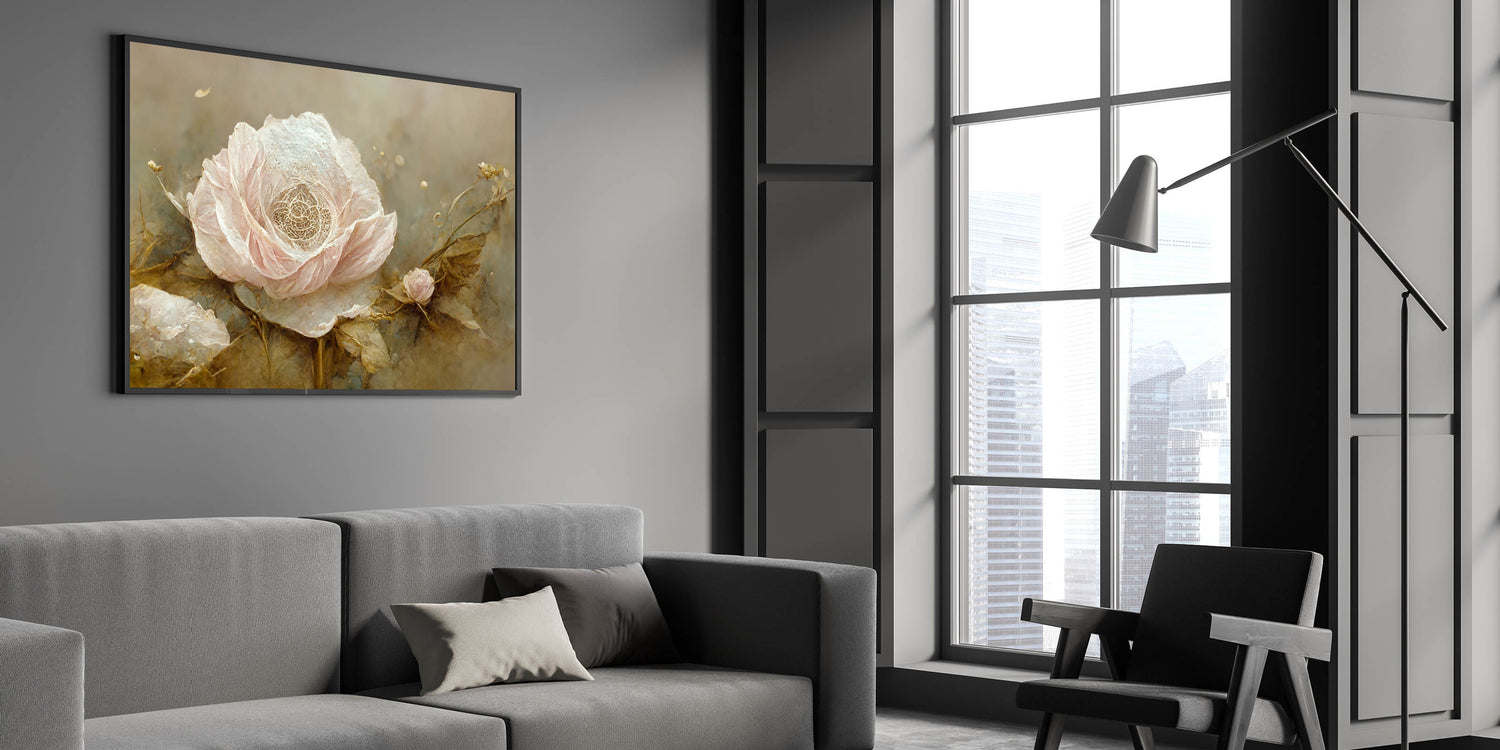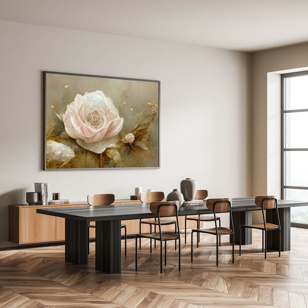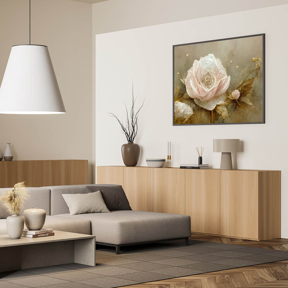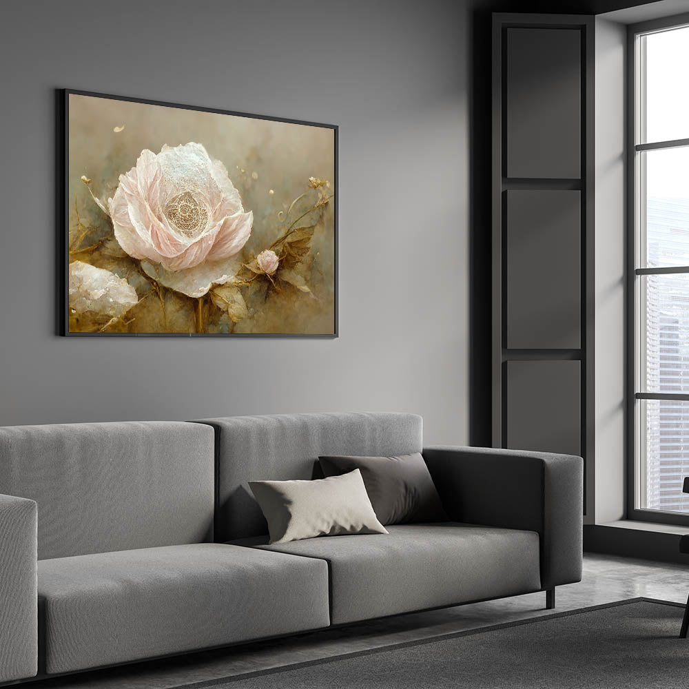 Add a touch of elegance to your home with this floral-inspired wall art, a perfect blend of softness and sophistication. Featuring a beautifully detailed blush pink rose set against a muted beige and brown background, this artwork brings warmth and romance to any space. The delicate petals and intricate textures create a serene and timeless aesthetic, making it an ideal modern living room decor piece.