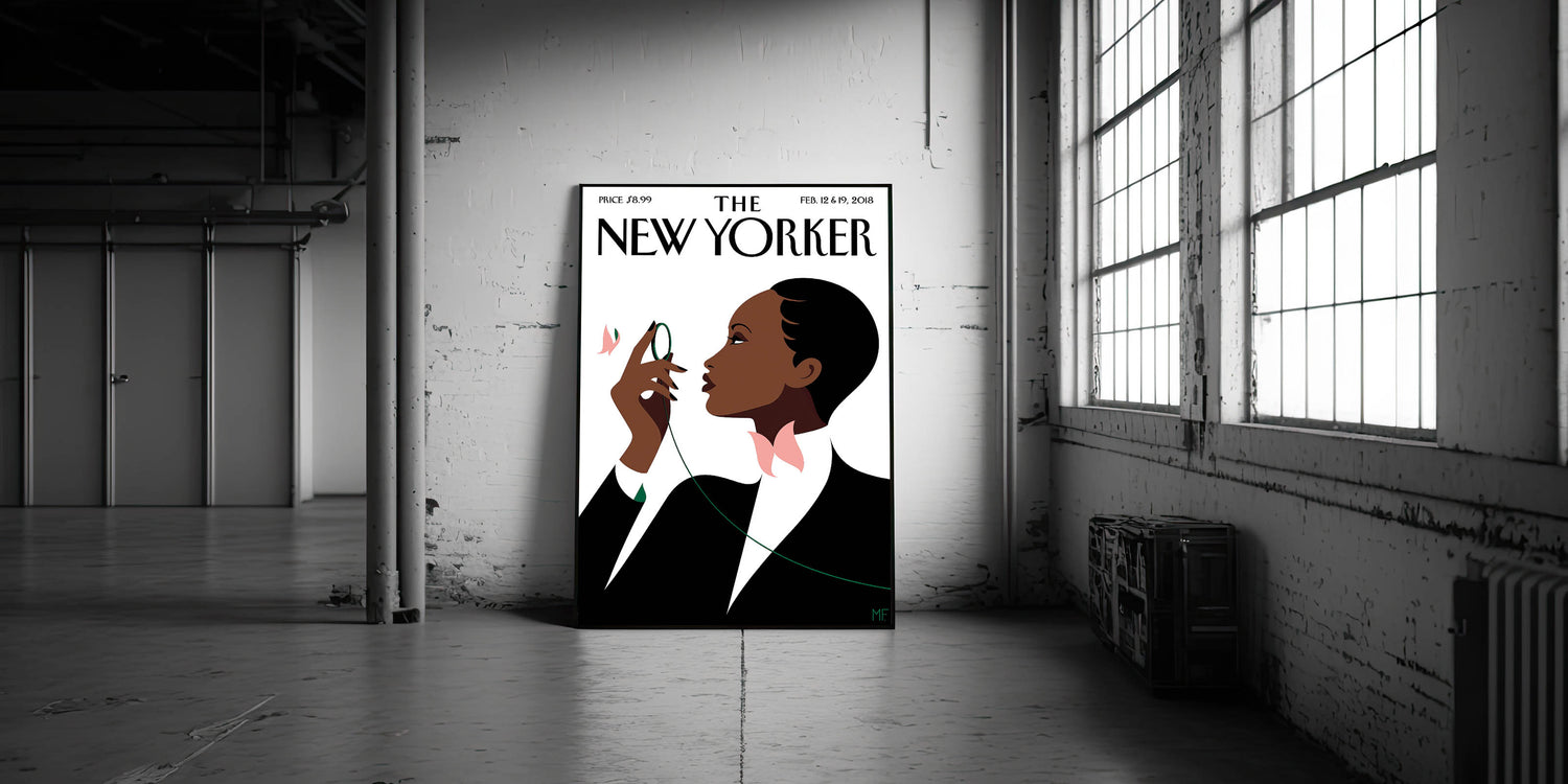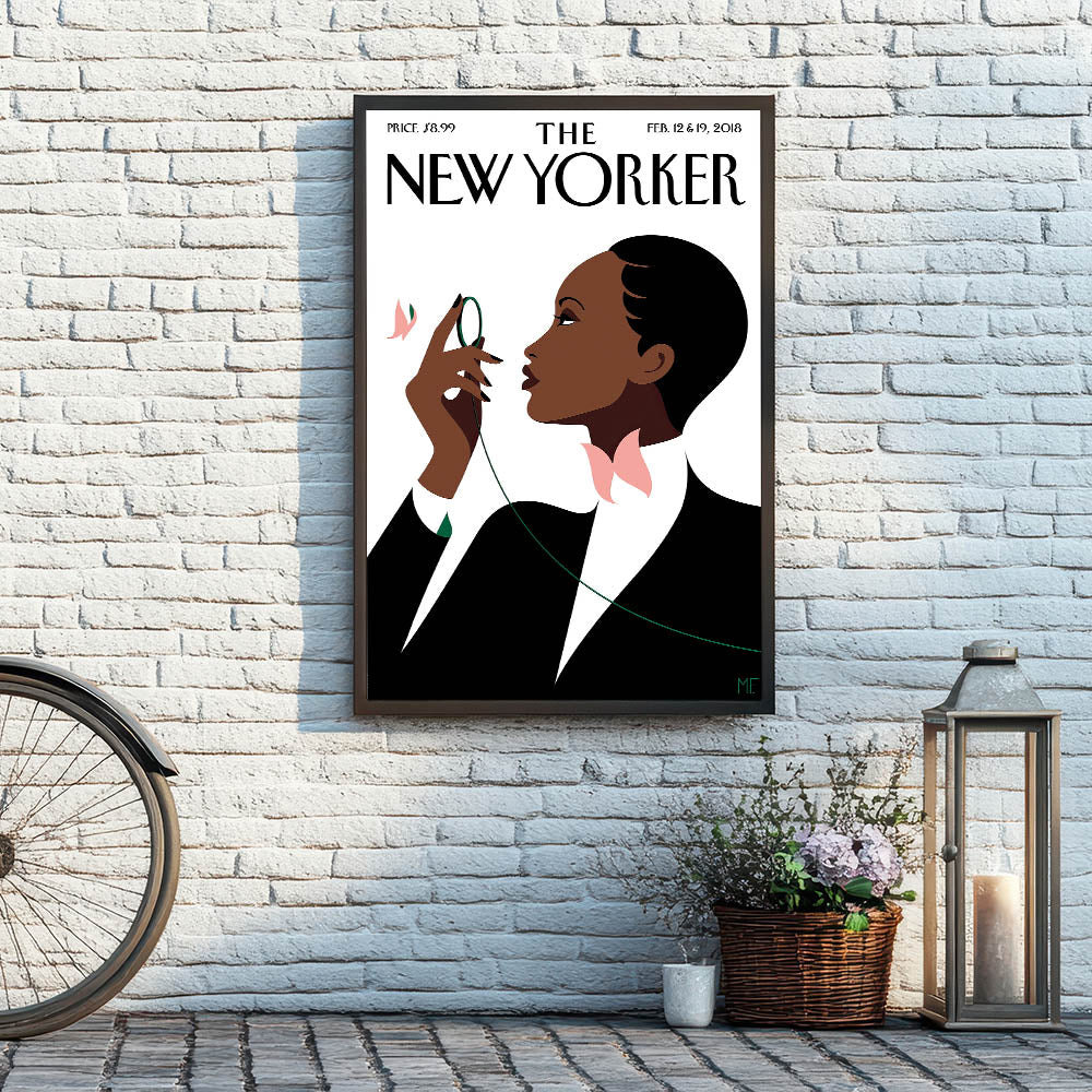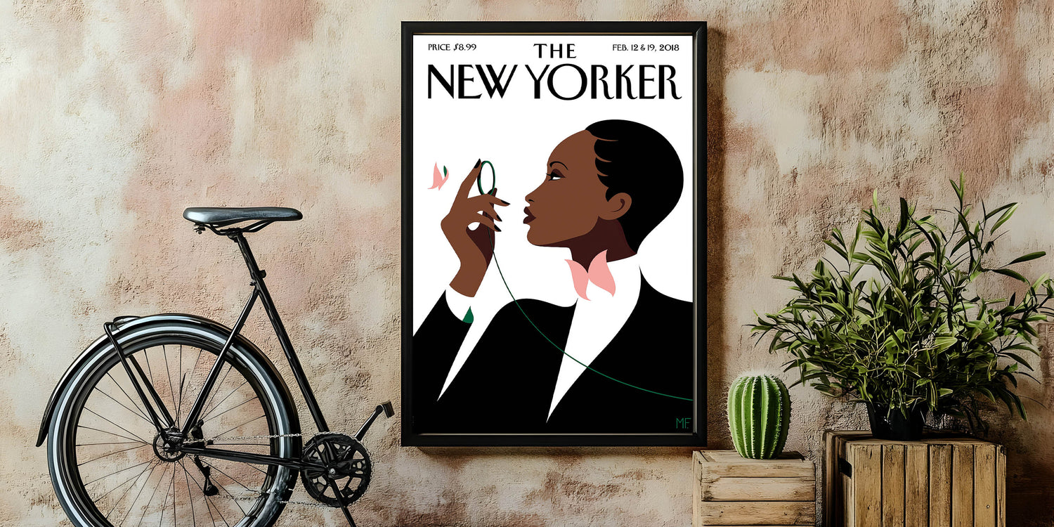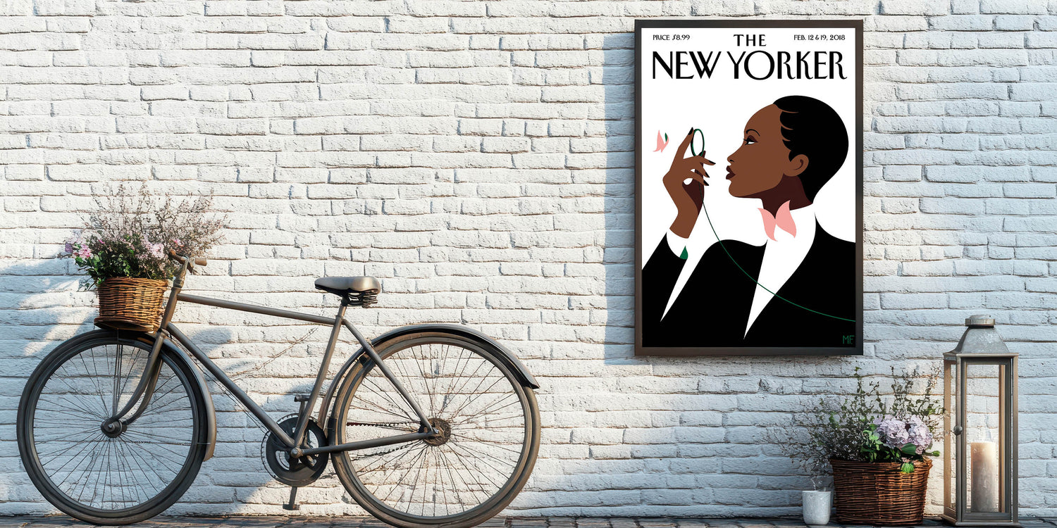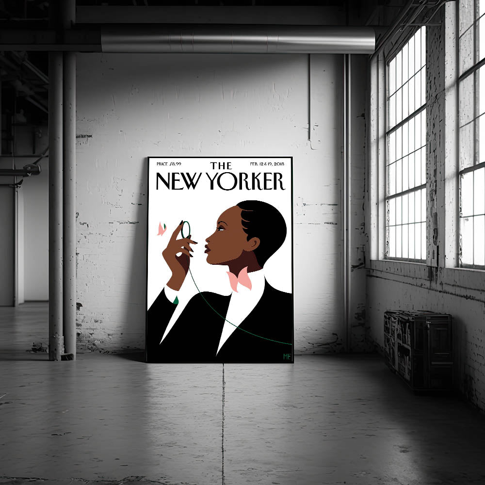 This striking New Yorker Magazine cover from February 12 & 19, 2018, beautifully depicts an elegant woman poised and contemplative. With a simple yet captivating design, the poster shows her holding a green thread and surrounded by soft pink flowers, creating a sense of grace and sophistication. The minimalist style, set against a crisp white background, highlights the bold shapes and contrasts that make this piece a timeless addition to any modern decor. Perfect for anyone who appreciates high fashion, contemporary illustration, and iconic New Yorker magazine art.