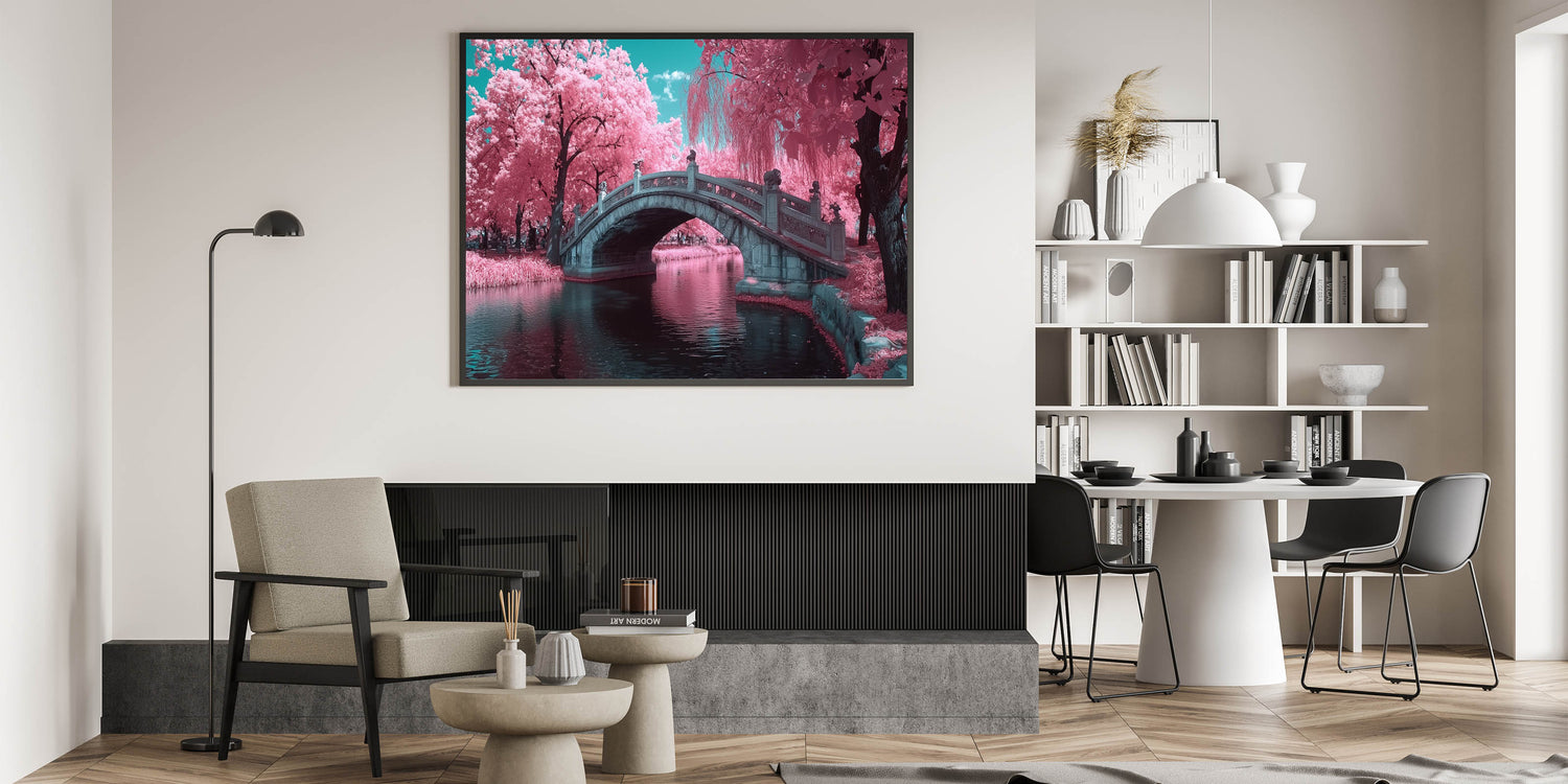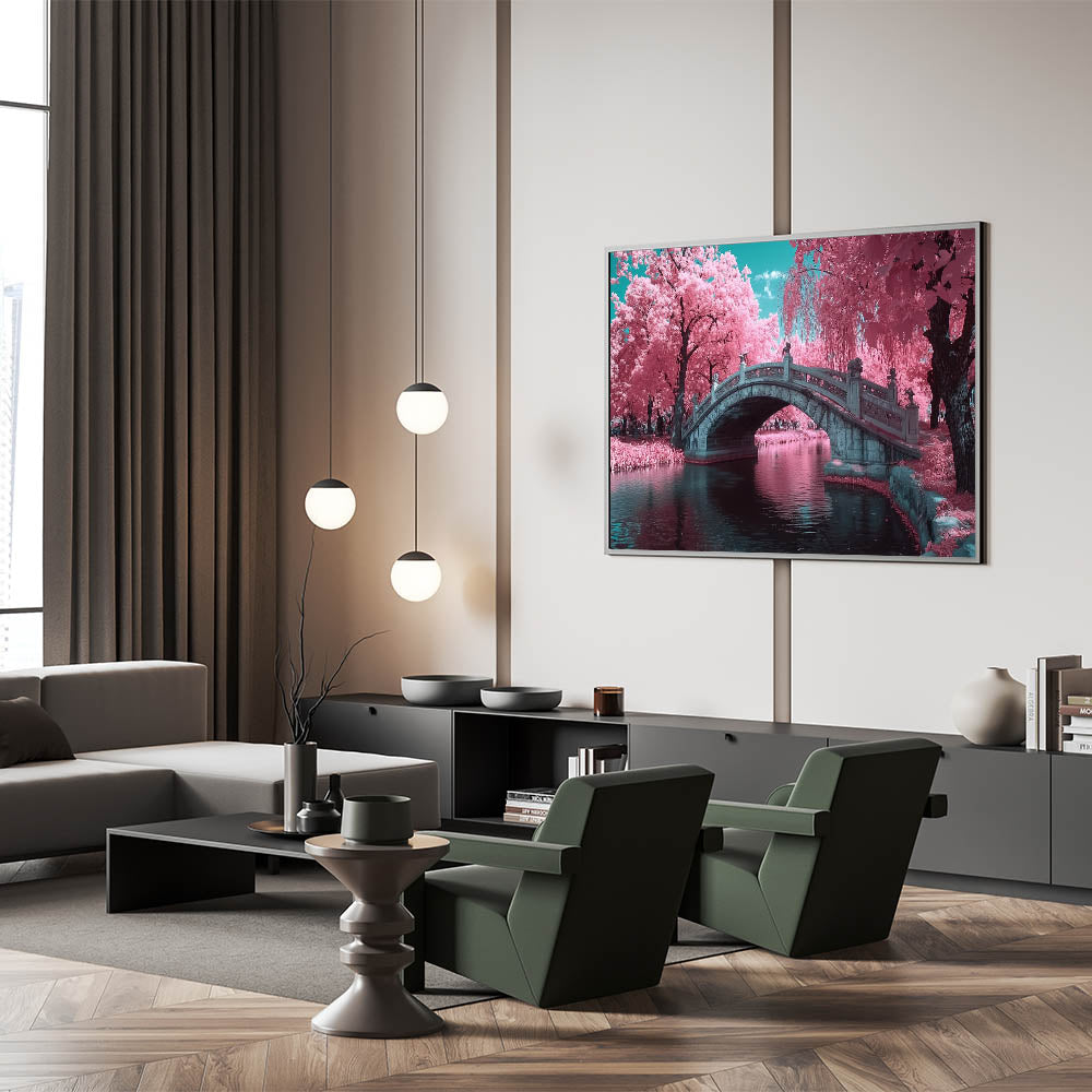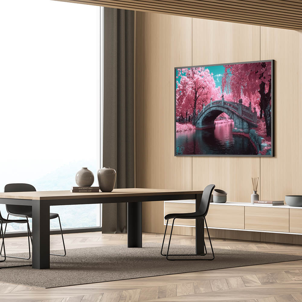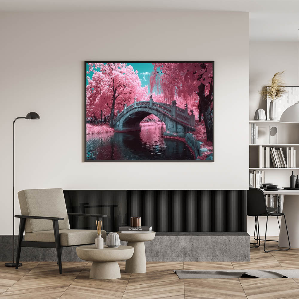 Transform your space with the charm of this enchanting decorative bridge wall art. This artwork features a beautifully detailed stone bridge surrounded by vibrant pink blossom trees, with serene water reflecting the stunning scene. The surreal color palette of pinks, turquoise, and soft blues creates a dreamy and magical atmosphere, making it an ideal piece for whimsical, modern, or romantic decor styles.