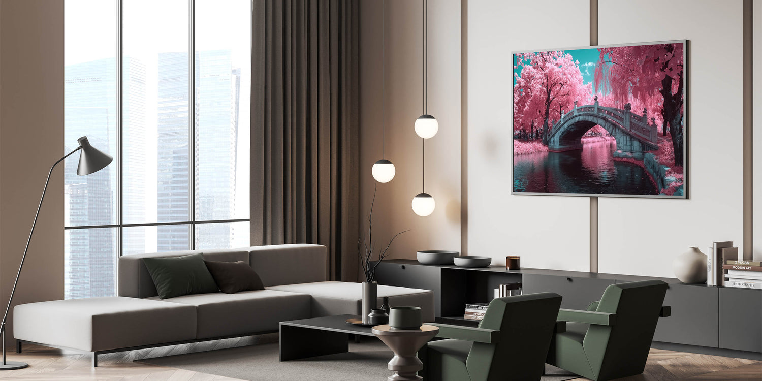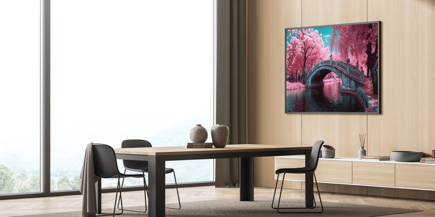 - Premium-quality art prints showcasing a detailed stone bridge and lush pink blossoms, available in Stretched Canvas, Framed Canvas, Acrylic Glass, and Framed Acrylic Glass options.