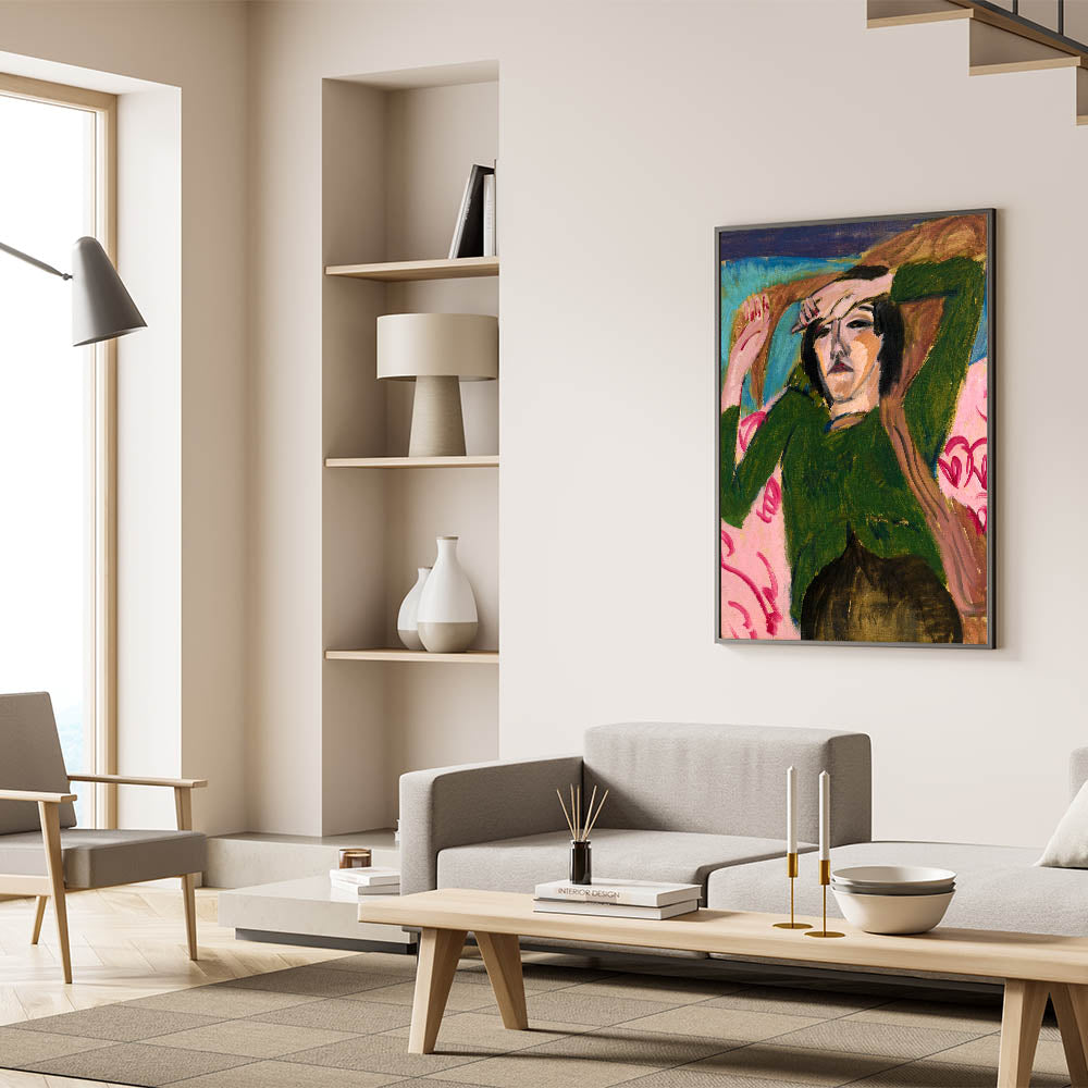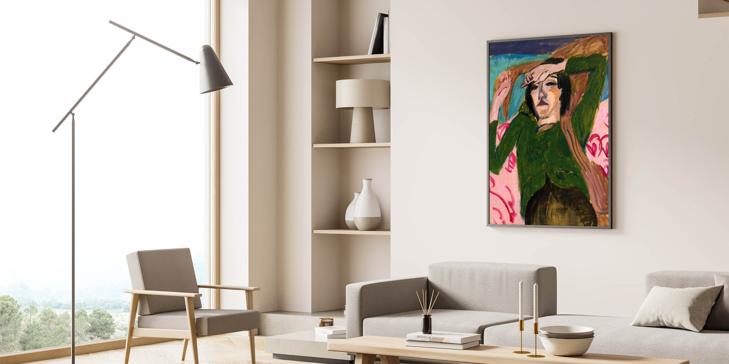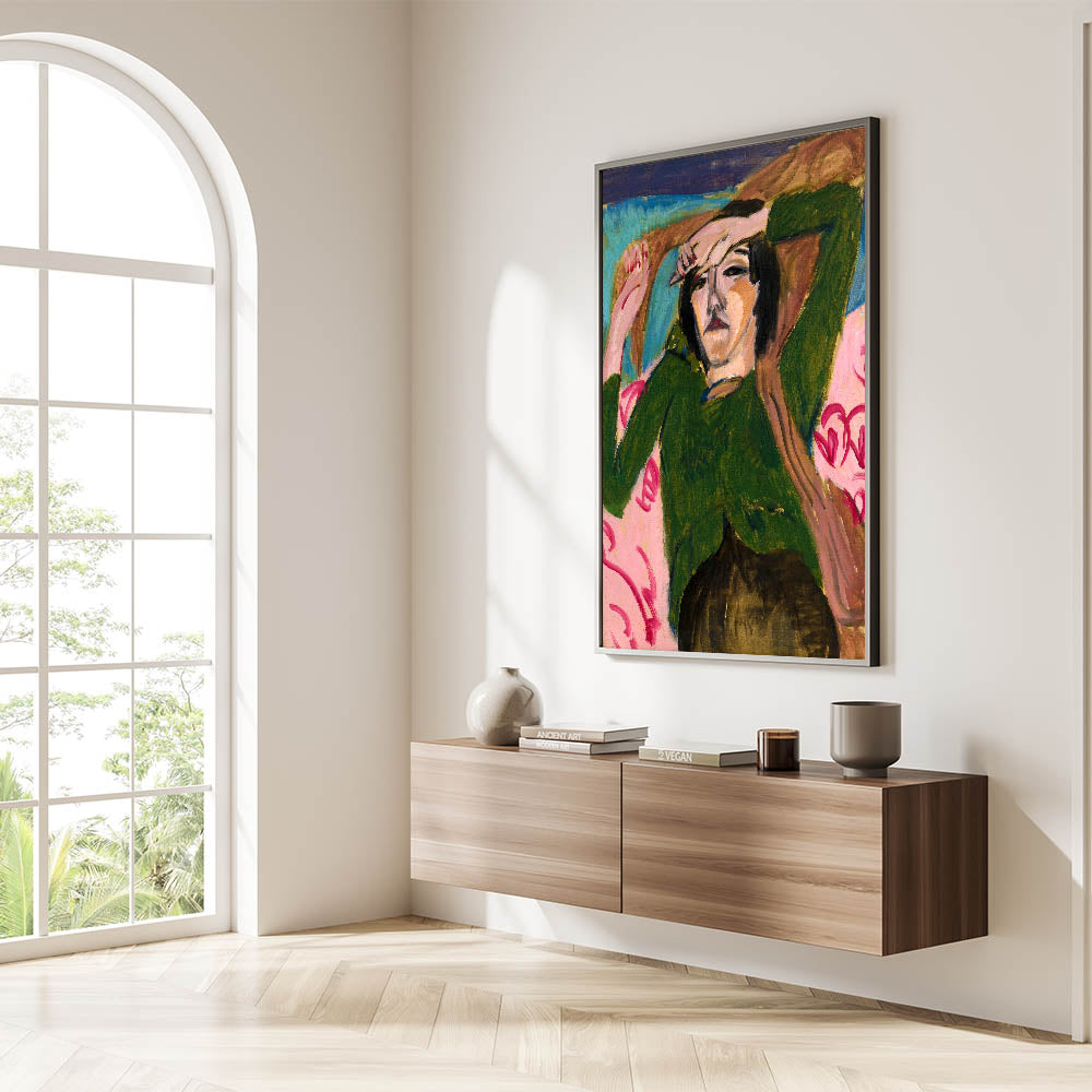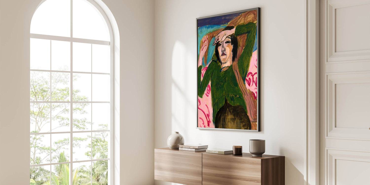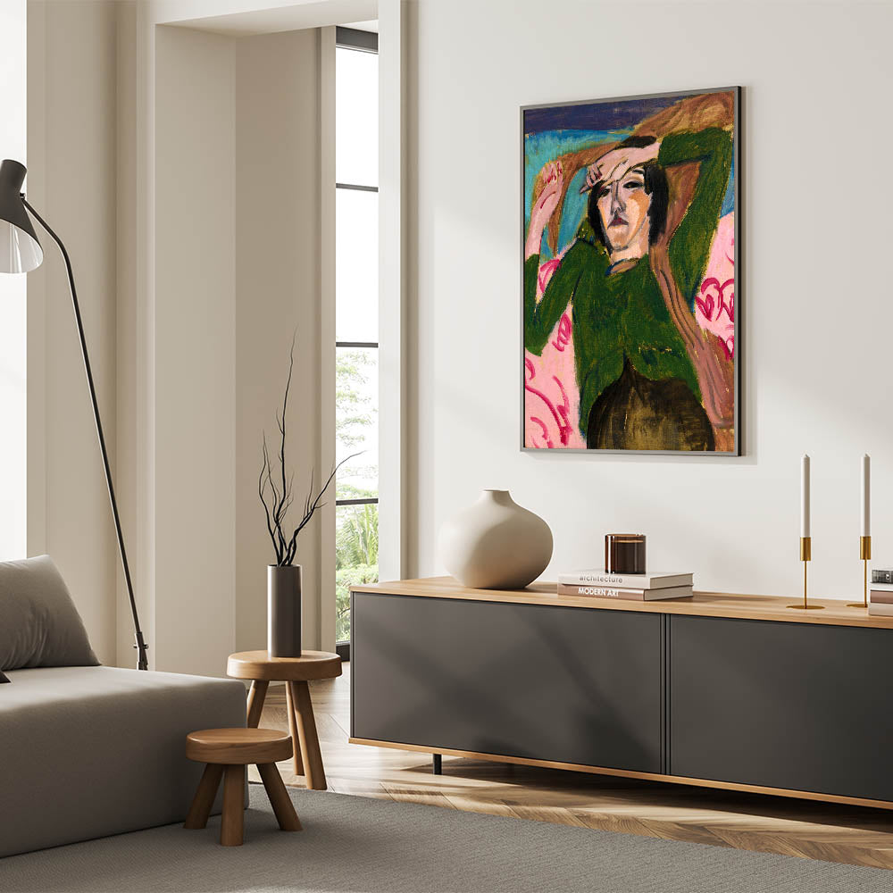 Bring the emotive depth of Expressionism to your space with Ernst Ludwig Kirchner's Woman in the Green Blouse. This striking portrait captures the relaxed yet introspective posture of its subject, rendered in vivid greens, pinks, and earthy tones. Kirchner’s bold brushstrokes and angular forms create a dynamic contrast that showcases the emotional intensity and modernist spirit of the Expressionist movement. This artwork is ideal for those looking to add sophistication and boldness to their interiors.