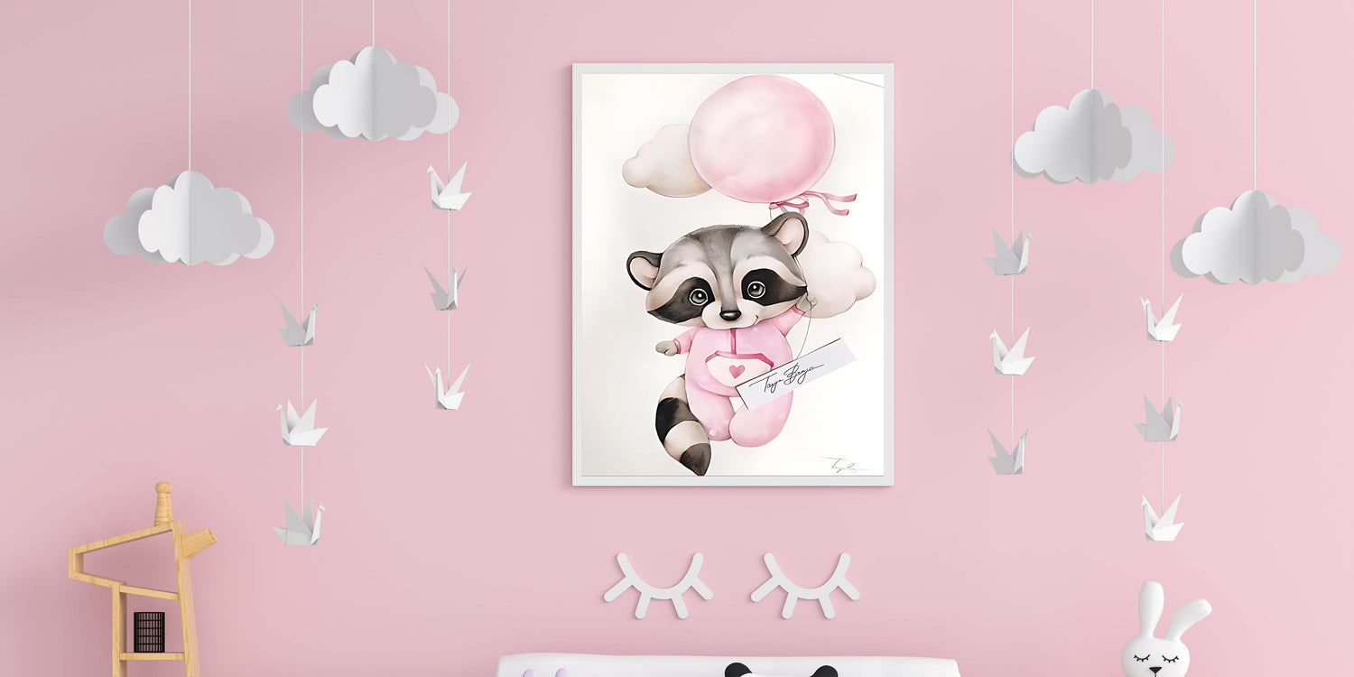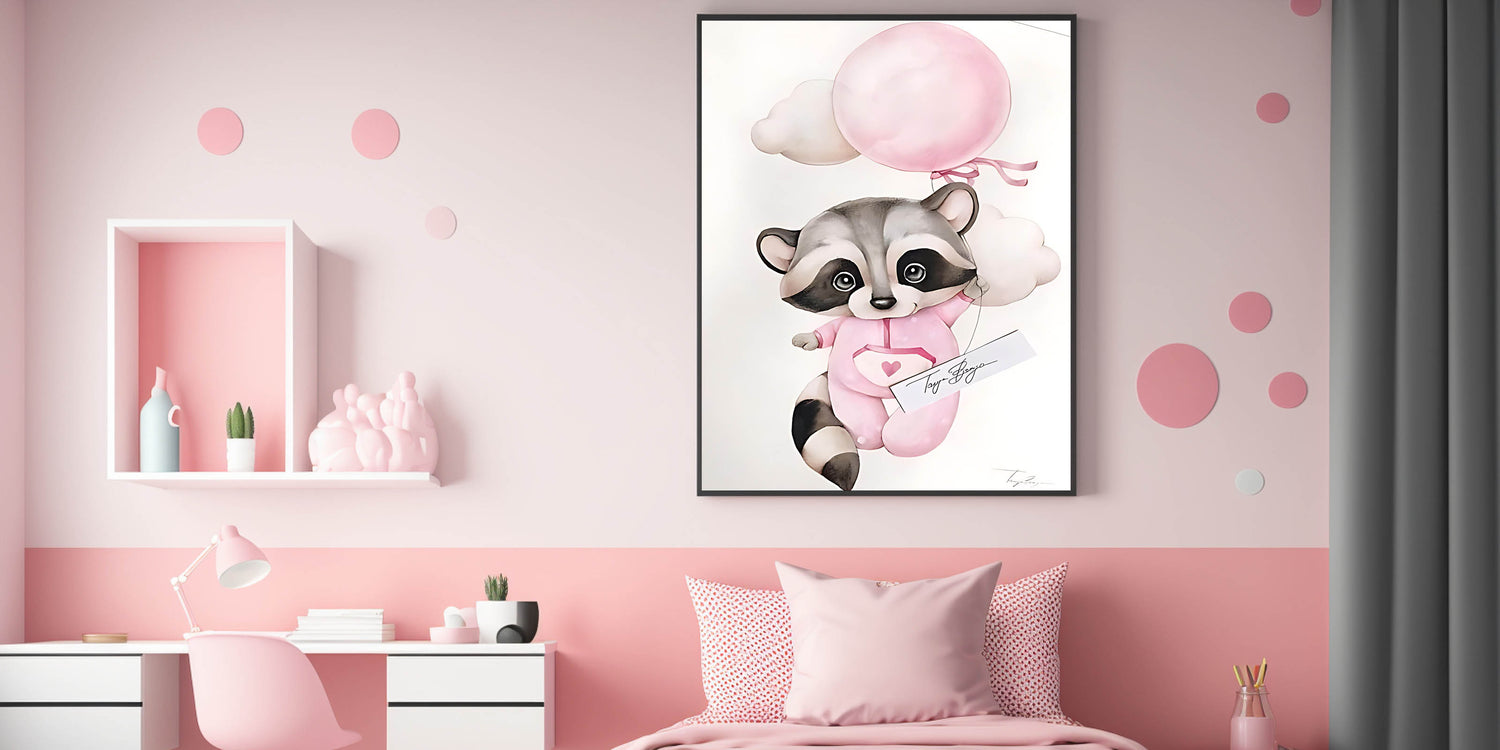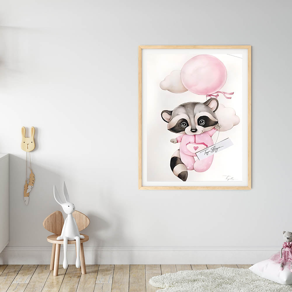 Create a soft and dreamy atmosphere in your child’s space with this floating baby raccoon wall art. Featuring an adorable baby raccoon in cozy pink pajamas, floating with a pastel pink balloon, this artwork evokes a sense of warmth, comfort, and innocence. The gentle gray, pink, and white tones create a soothing and elegant aesthetic, making it a beautiful addition to any girls' bedroom, nursery, or playroom.
