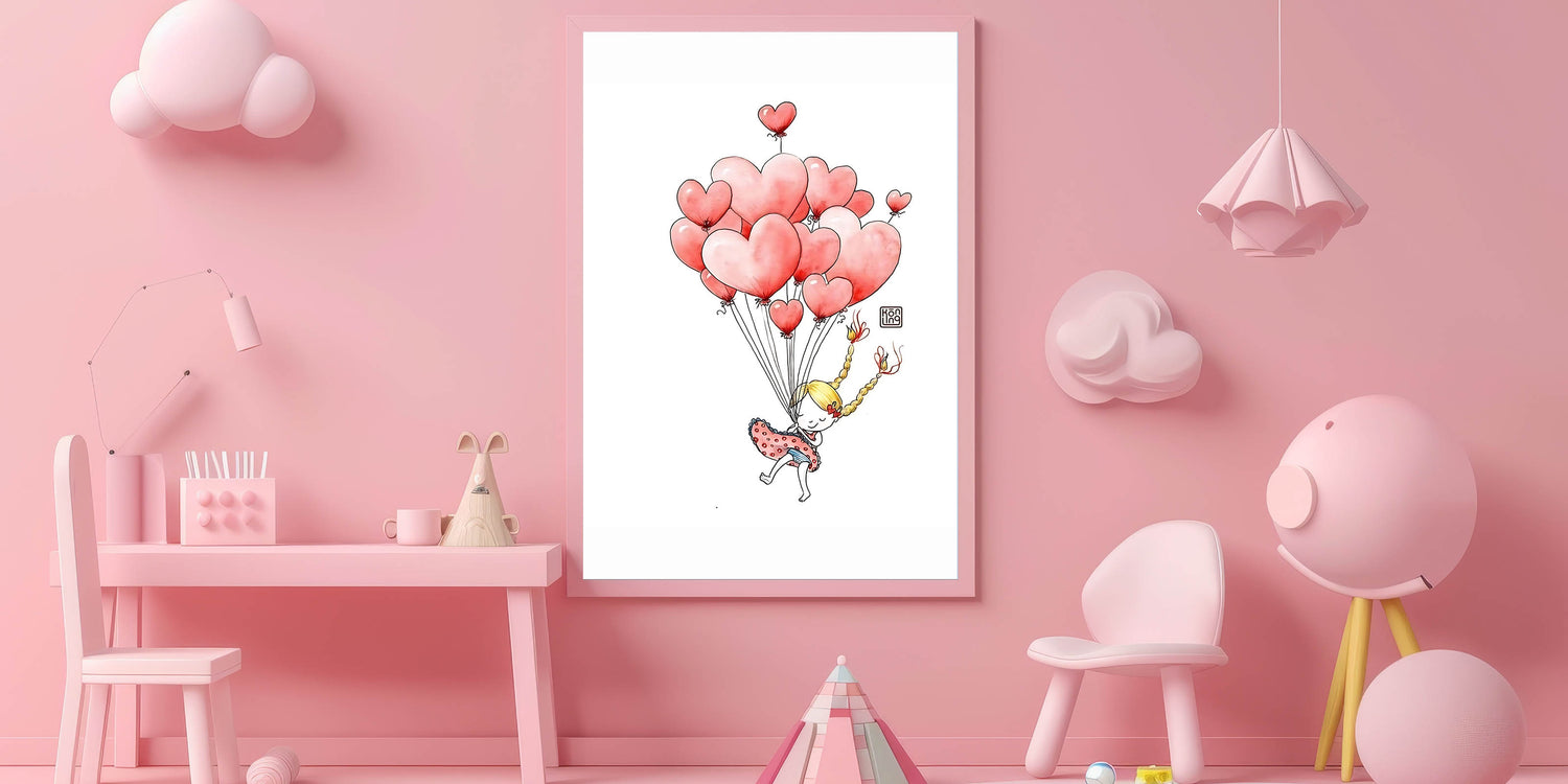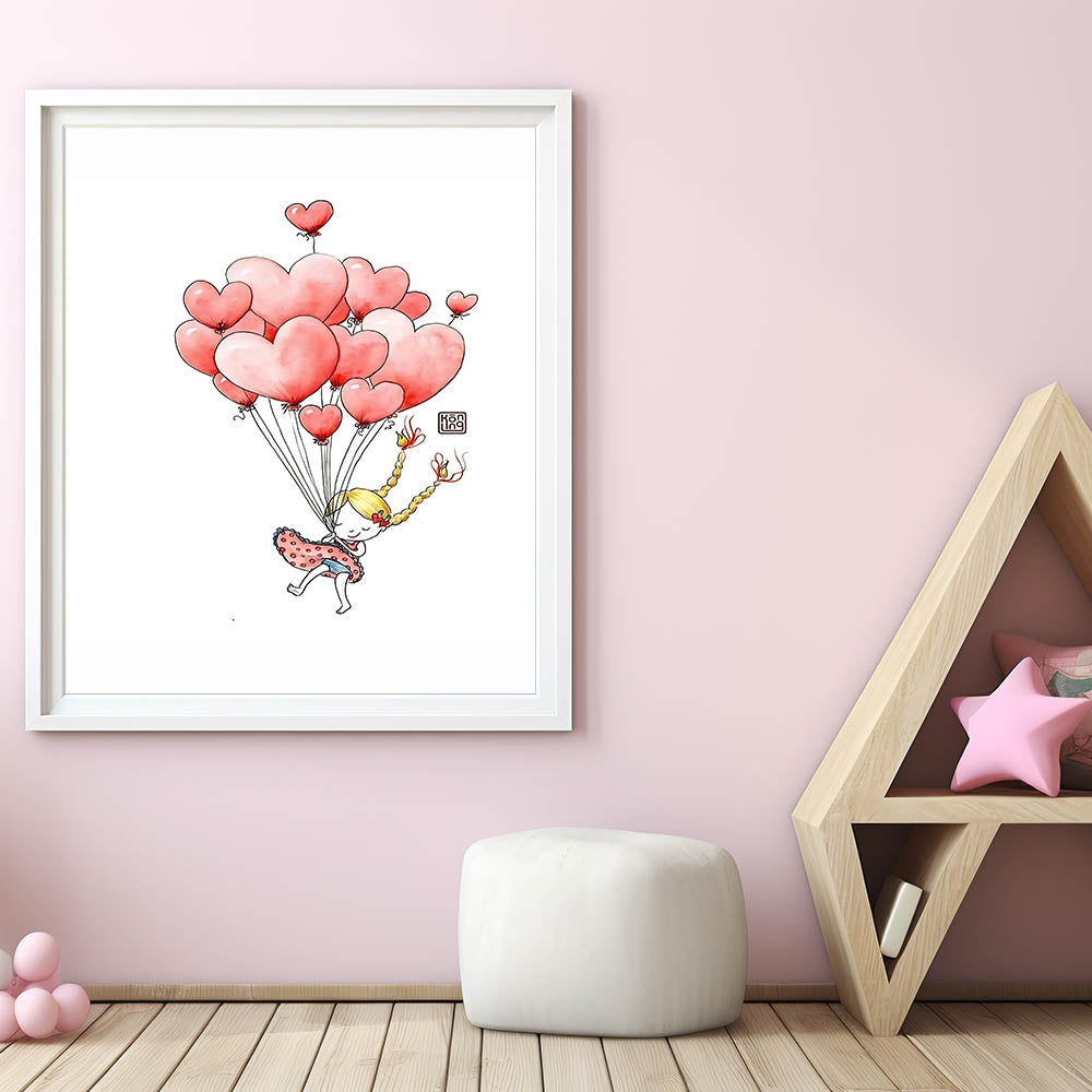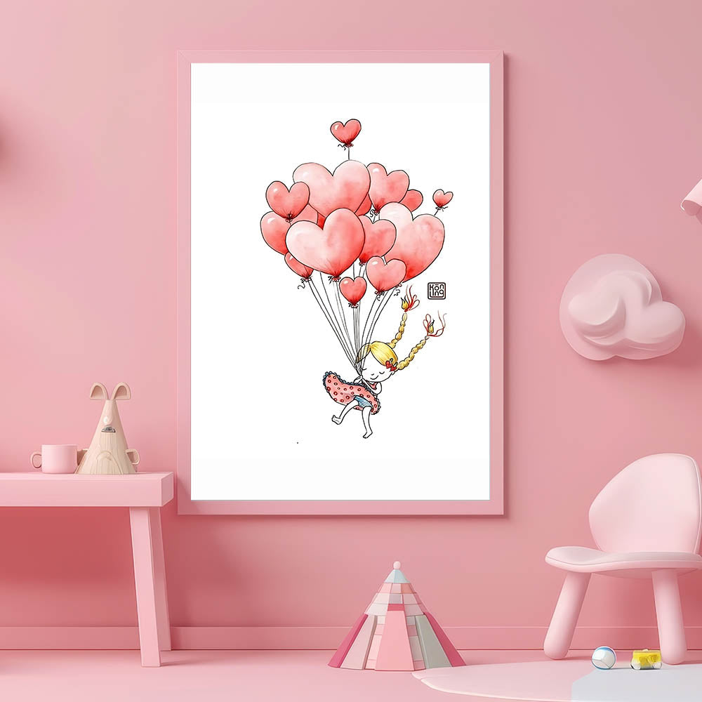 Add a whimsical and dreamy touch to your child's space with this Floating Heart Balloons wall art. Featuring an adorable girl floating among heart-shaped balloons, this artwork captures the essence of childhood joy and imagination. The delicate pink and red hues combined with a minimalist background make it a charming addition to nurseries, playrooms, or girls' bedrooms.