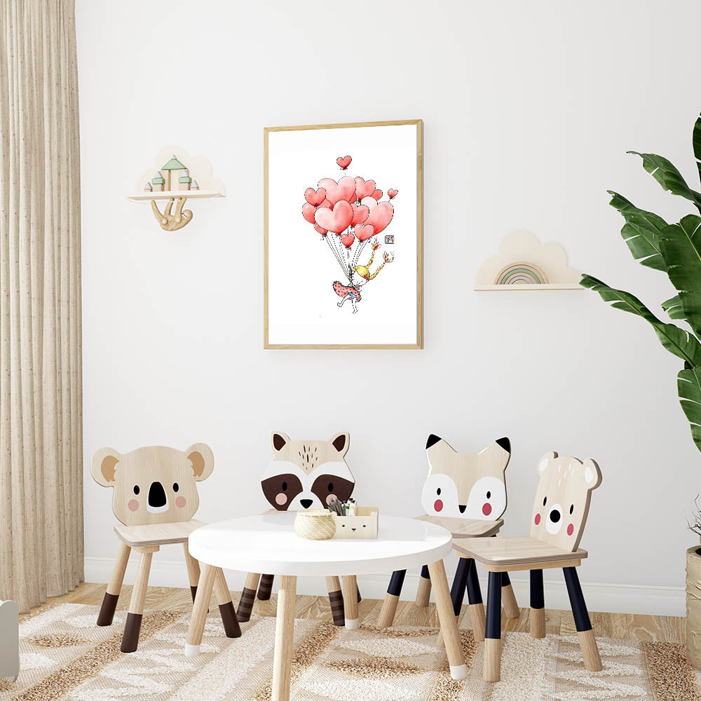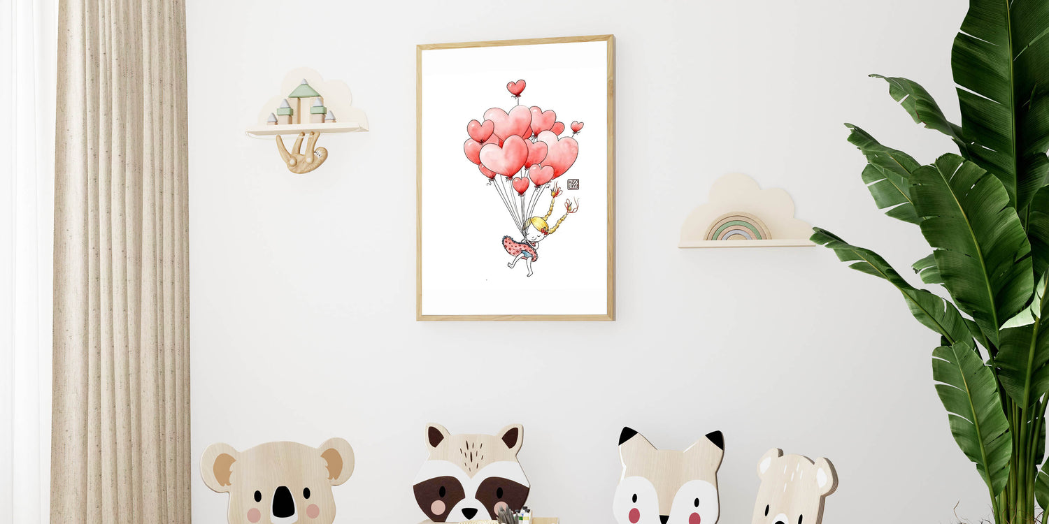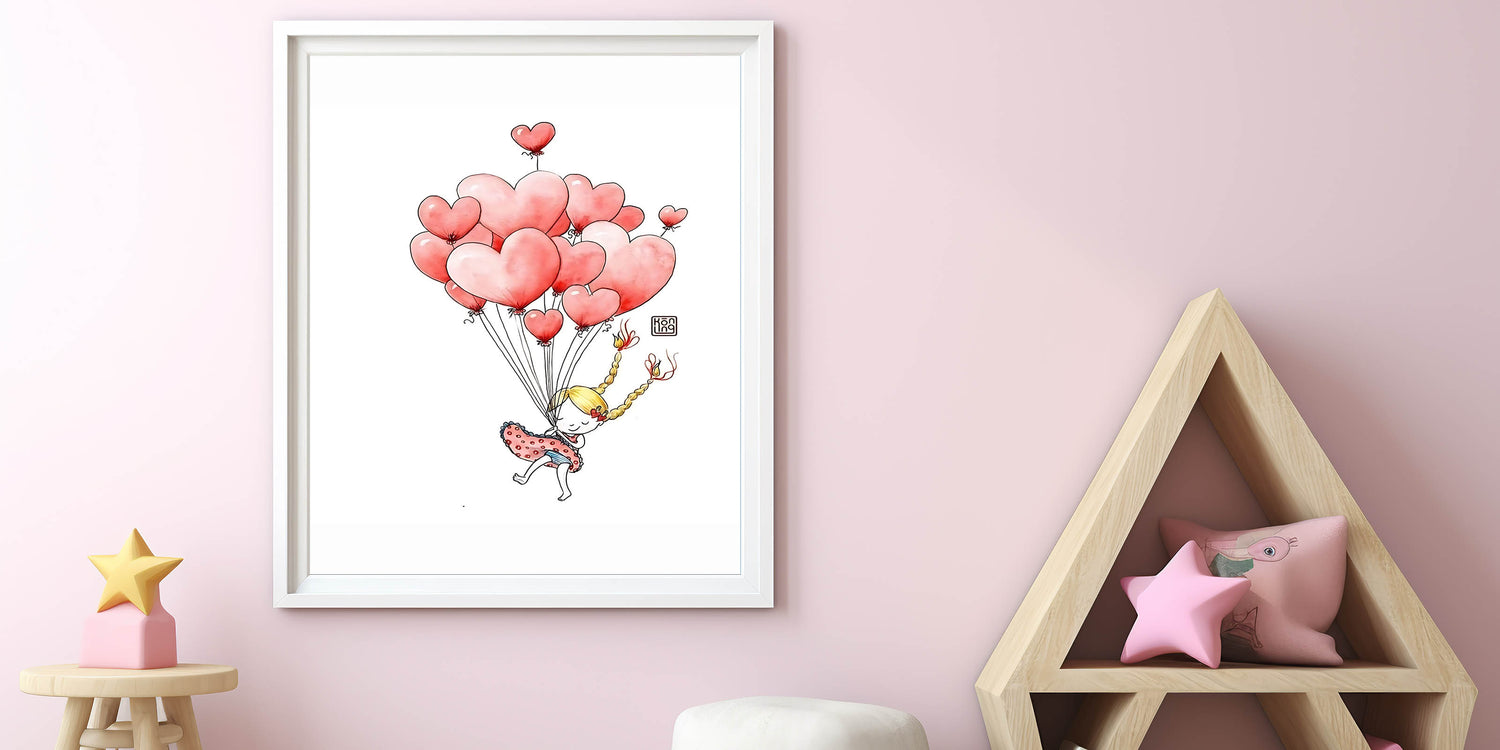 Add a whimsical and dreamy touch to your child's space with this Floating Heart Balloons wall art. Featuring an adorable girl floating among heart-shaped balloons, this artwork captures the essence of childhood joy and imagination. The delicate pink and red hues combined with a minimalist background make it a charming addition to nurseries, playrooms, or girls' bedrooms.