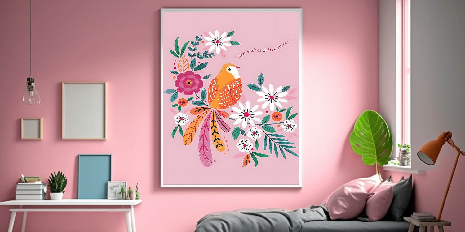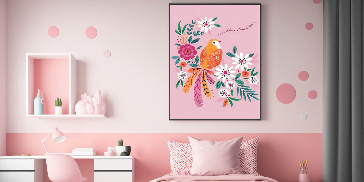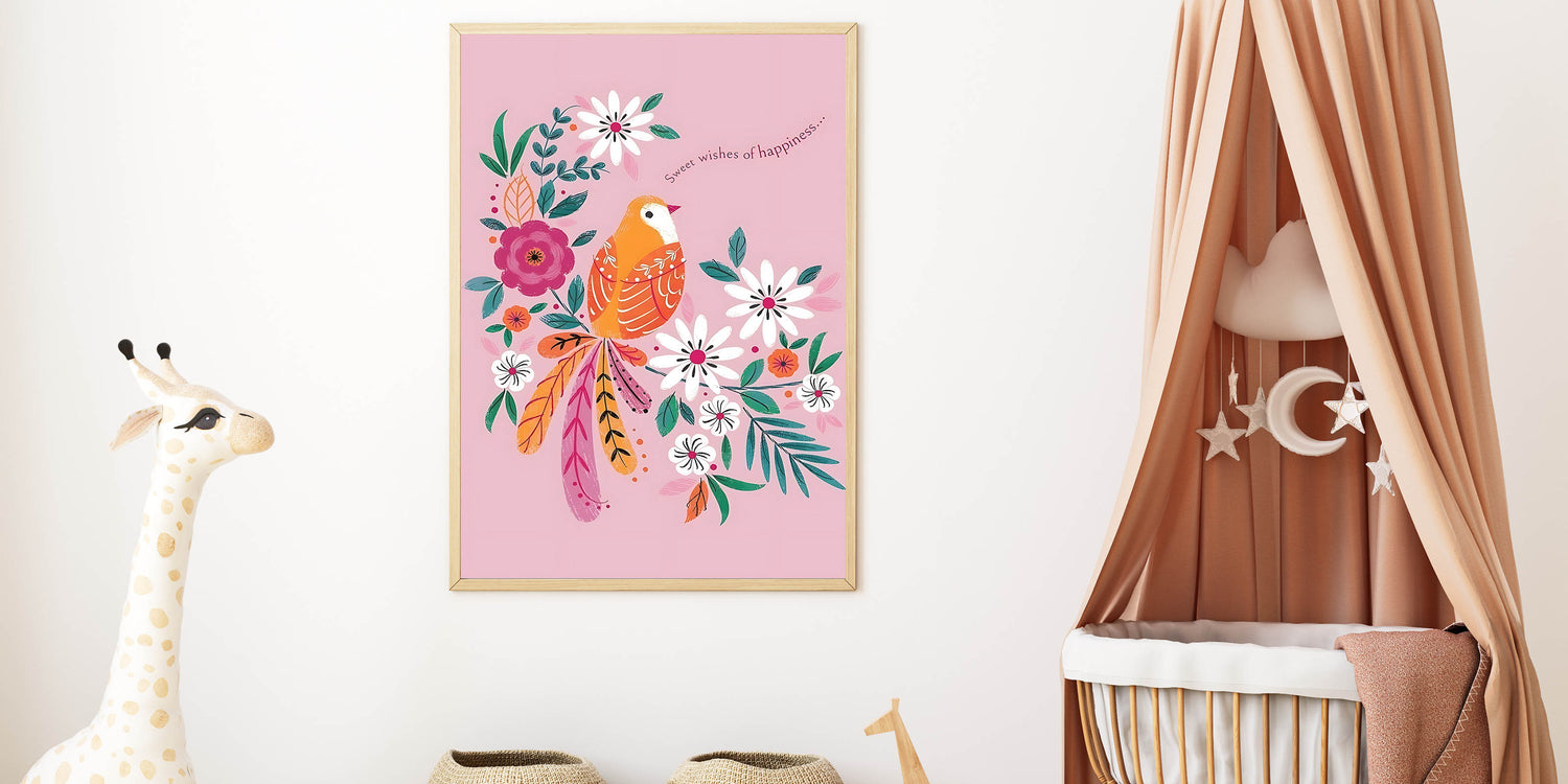 Create a serene and cheerful atmosphere with this floral bird wall art, perfect for enhancing girls' bedrooms, nurseries, and playrooms. Featuring a beautifully illustrated orange and pink bird surrounded by lush flowers and green foliage, this artwork brings warmth, joy, and a touch of nature to any children’s wall decor. The handwritten phrase "Sweet wishes of happiness..." adds an extra sentimental charm, making this print a heartfelt addition to any space.