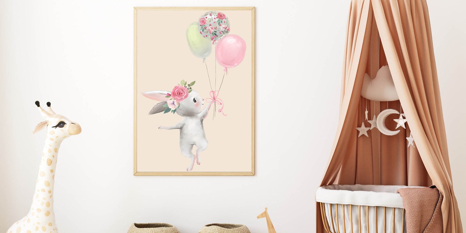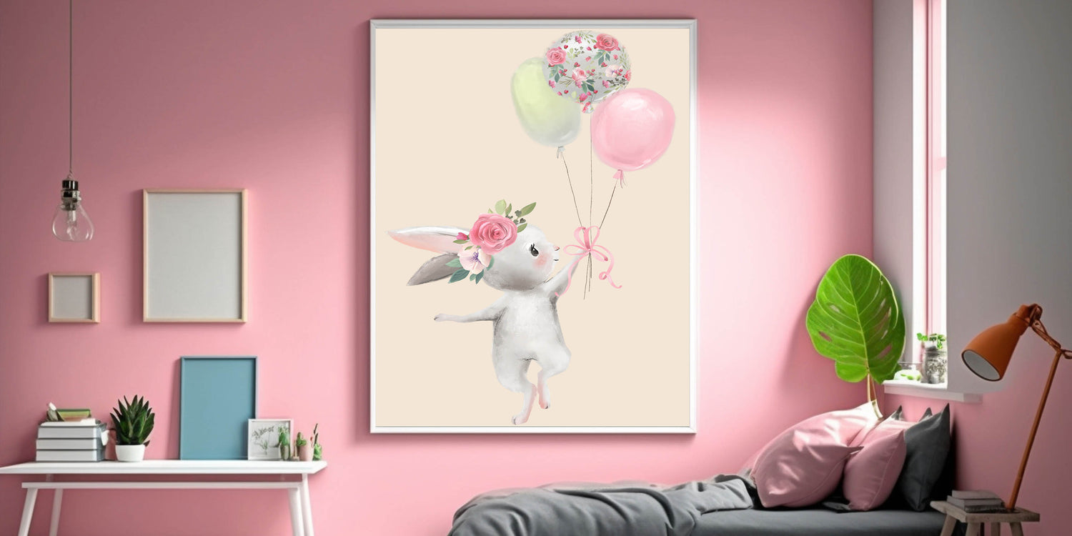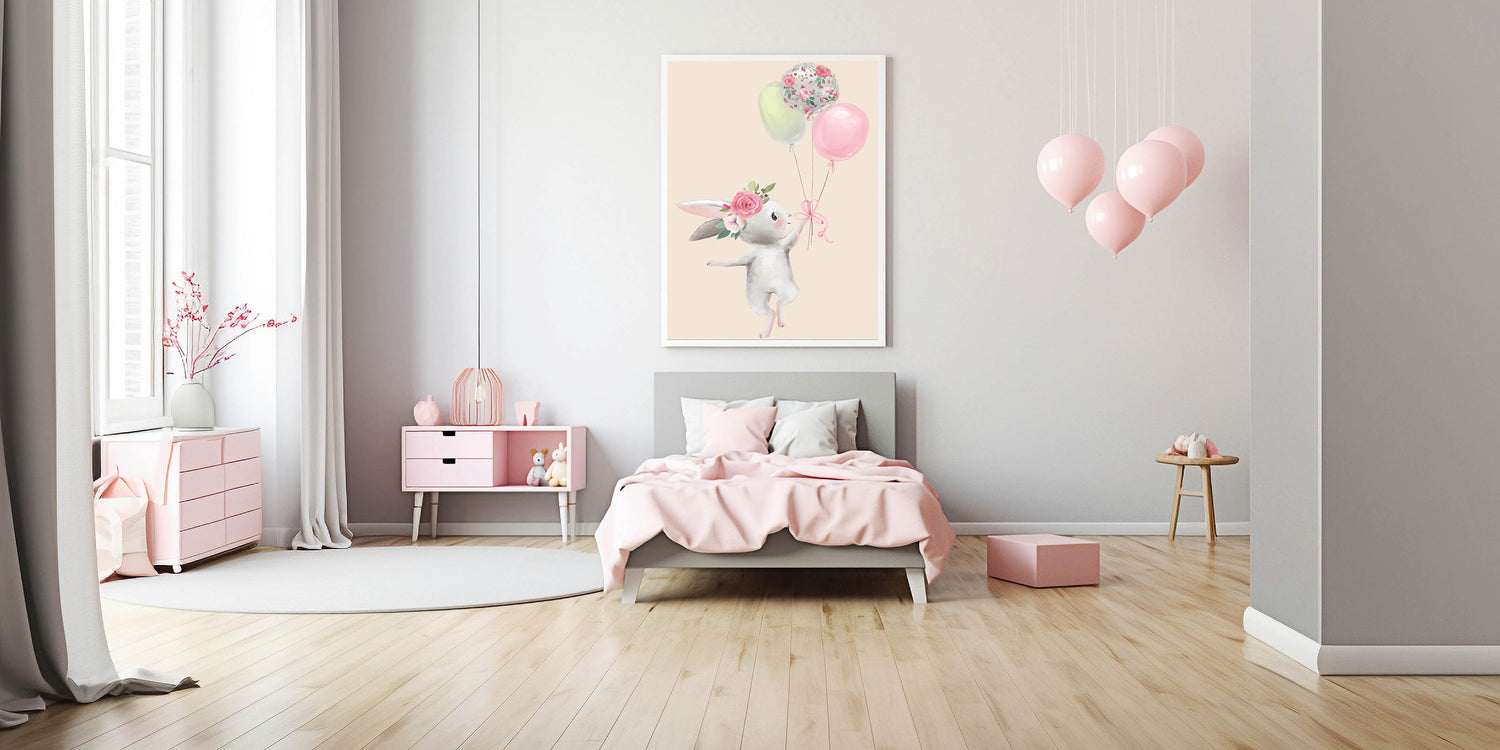 Floral Bunny Balloon Girls Room Wall Art – Kids Room Art Print