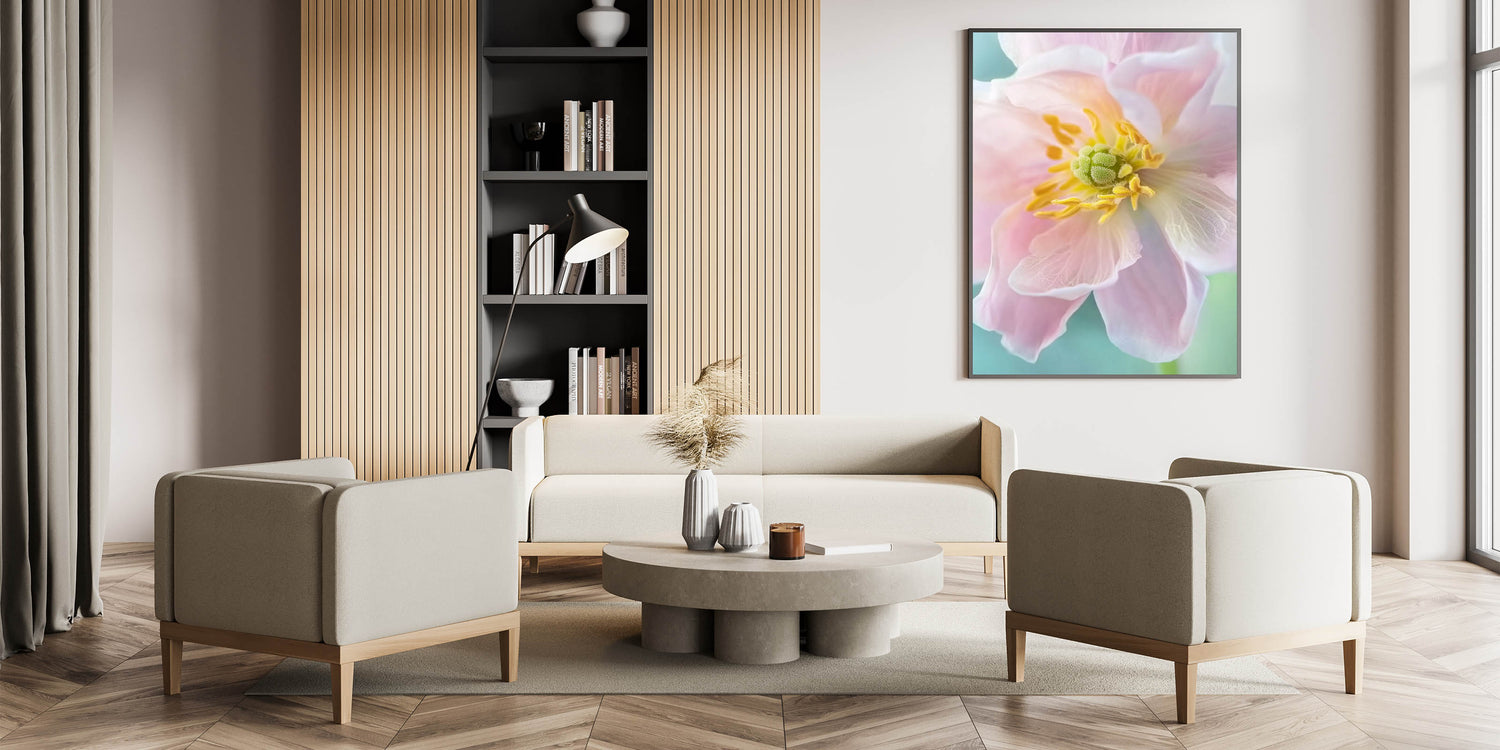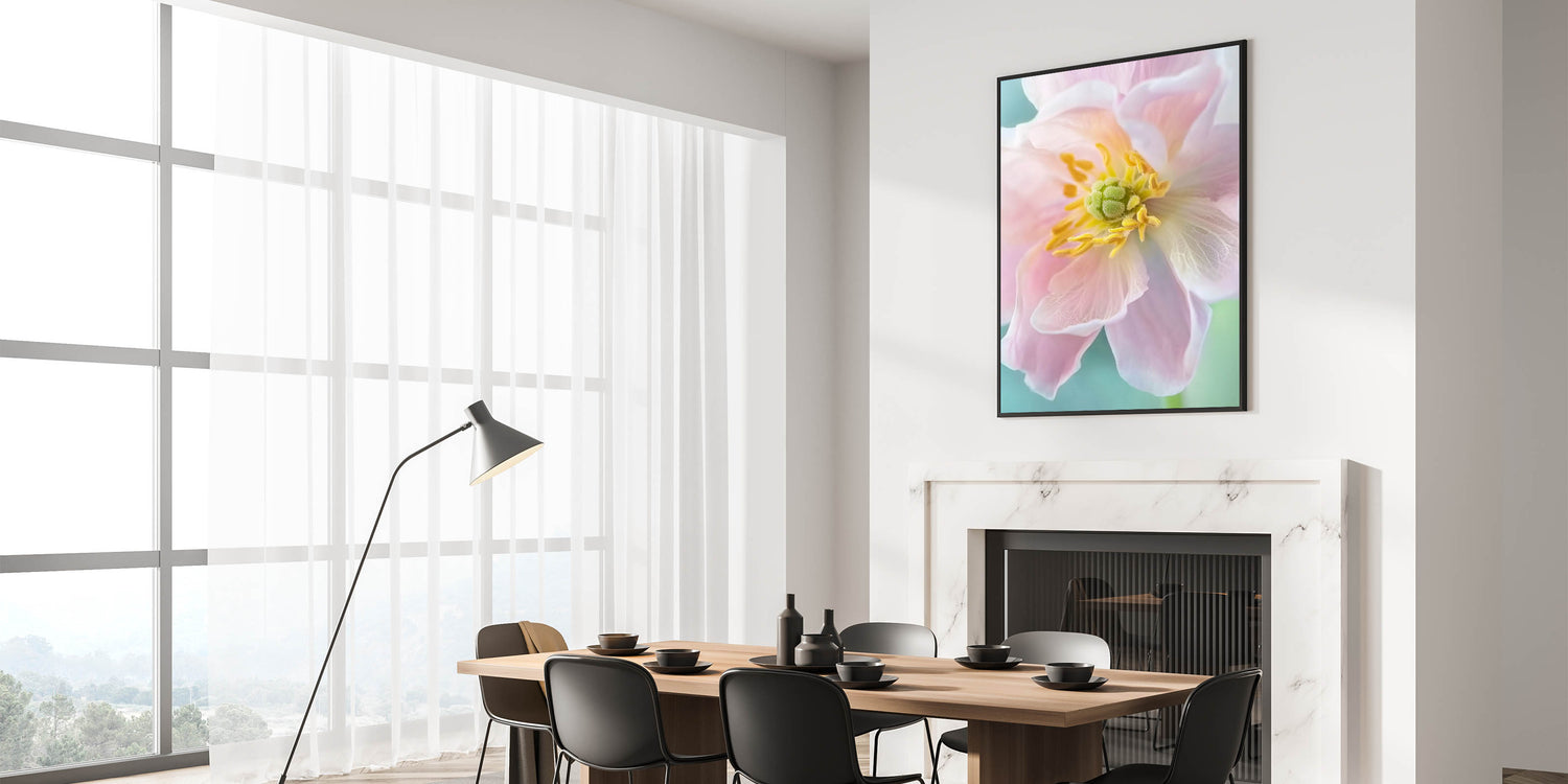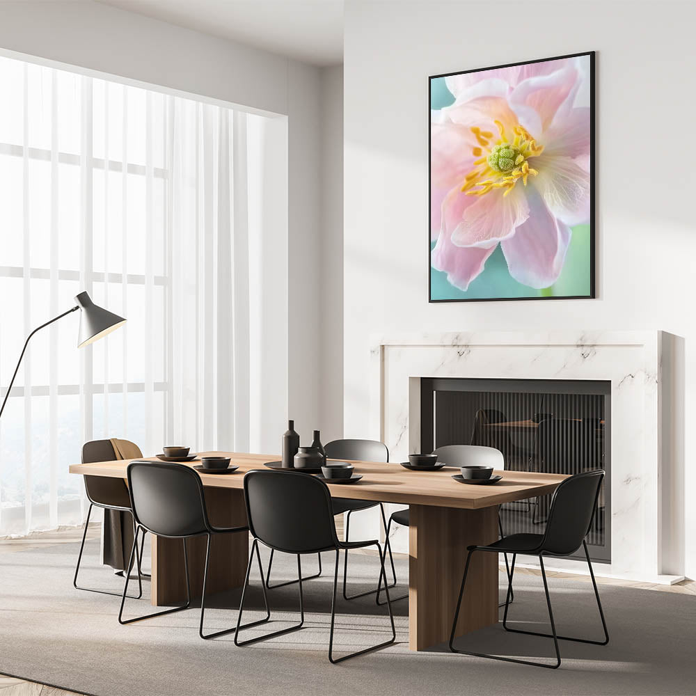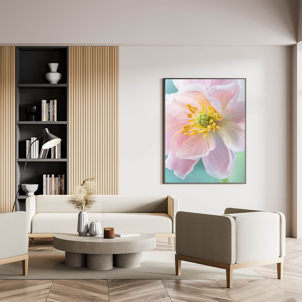 Bring the delicate beauty of nature into your home with this stunning floral wall art. Featuring a close-up view of a blooming pastel flower, this artwork highlights soft pink petals, vibrant yellow accents, and a calming green background. Perfect for adding a touch of elegance and serenity to your space, this nature-inspired piece will complement any interior design.