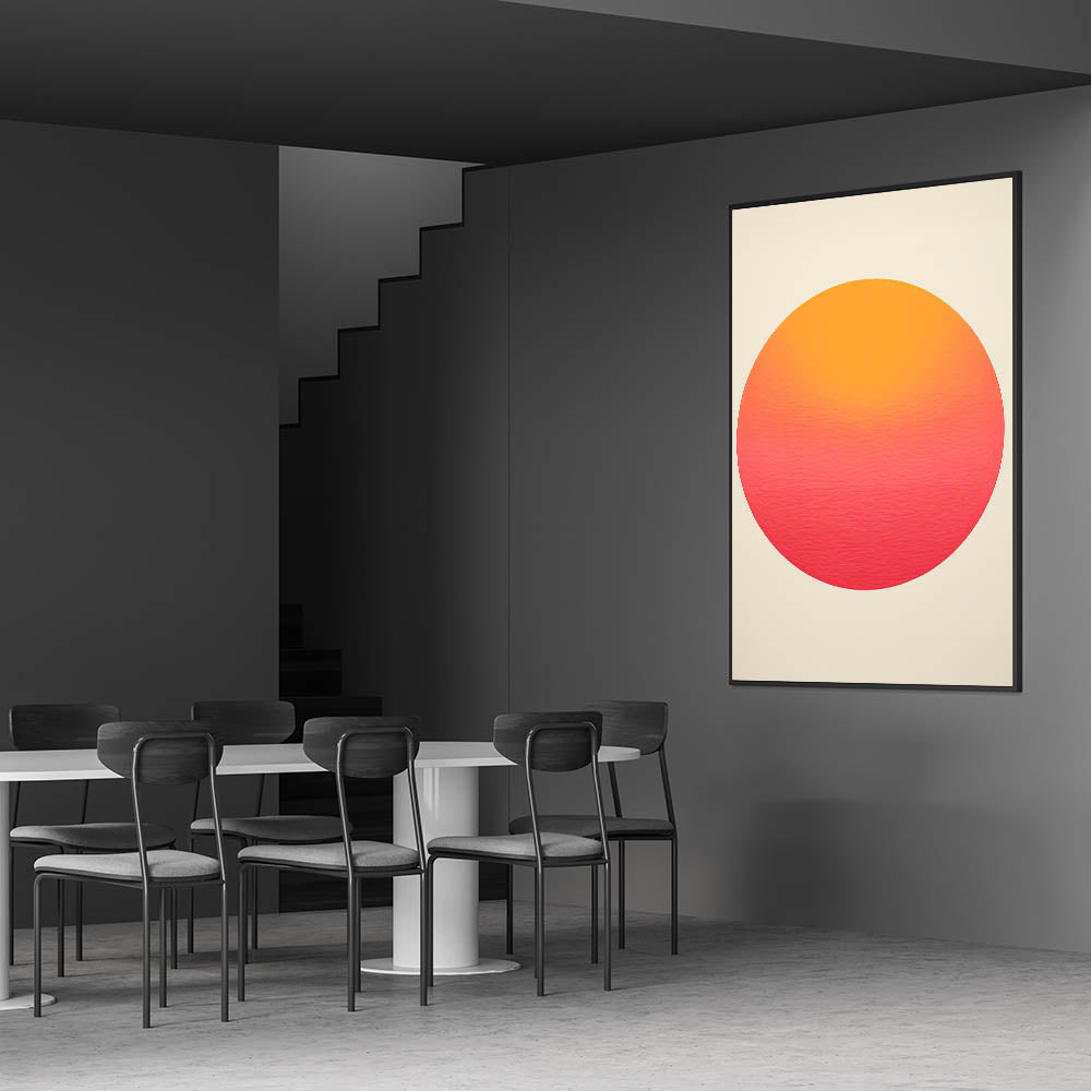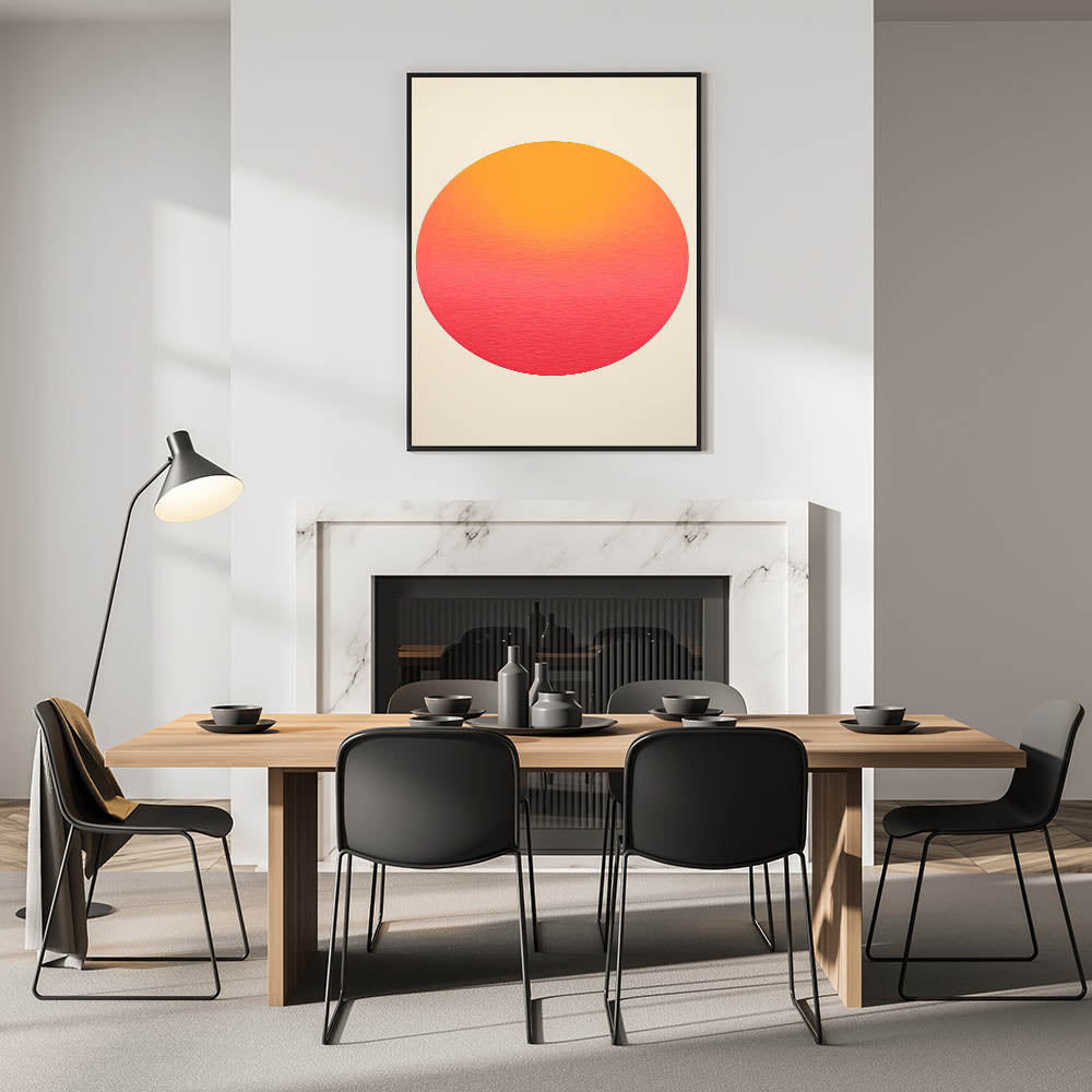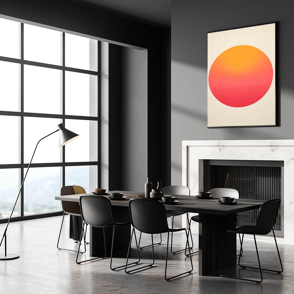 Add warmth and modern elegance to your dining space with this framed and canvas dining room art, featuring a vibrant sunset-inspired gradient circle. The smooth blend of warm orange, coral, and pink hues creates a contemporary dining art piece that brings a calming yet bold presence to your walls. Ideal for minimalist, modern, or mid-century interiors, this piece enhances any dining area with its simple yet striking aesthetic.