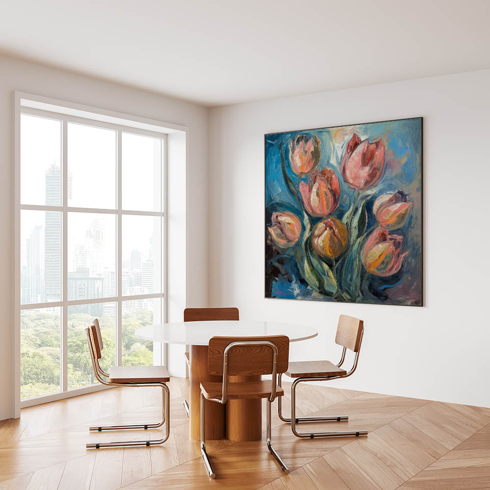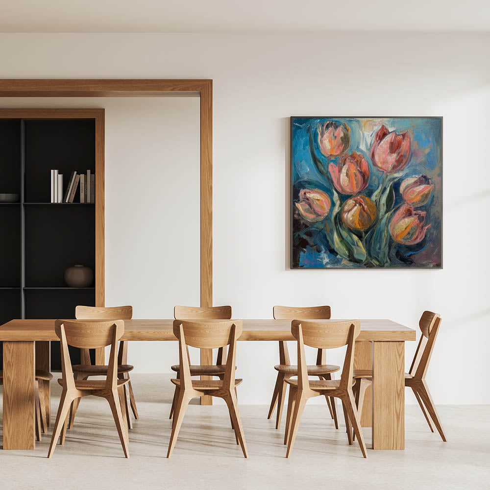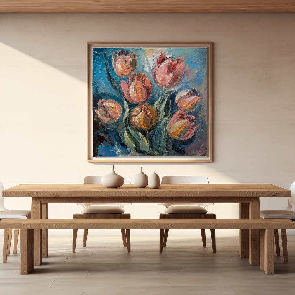Bring a touch of elegance and nature to your dining space with this framed dining room print, featuring a breathtaking floral tulip painting in vibrant hues of pink, orange, and deep blue. The rich brushstrokes and expressive texture make this piece a stunning focal point for any dining room wall decor.
