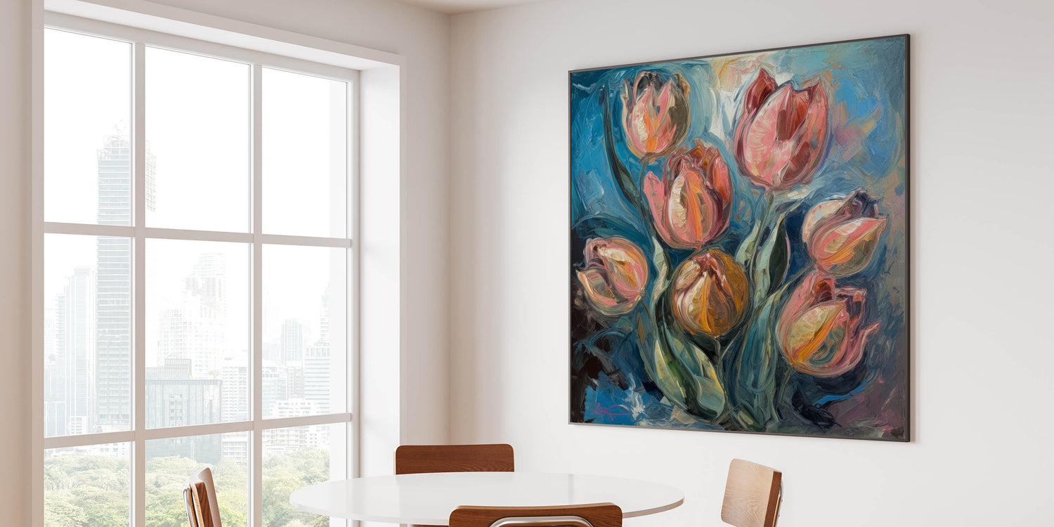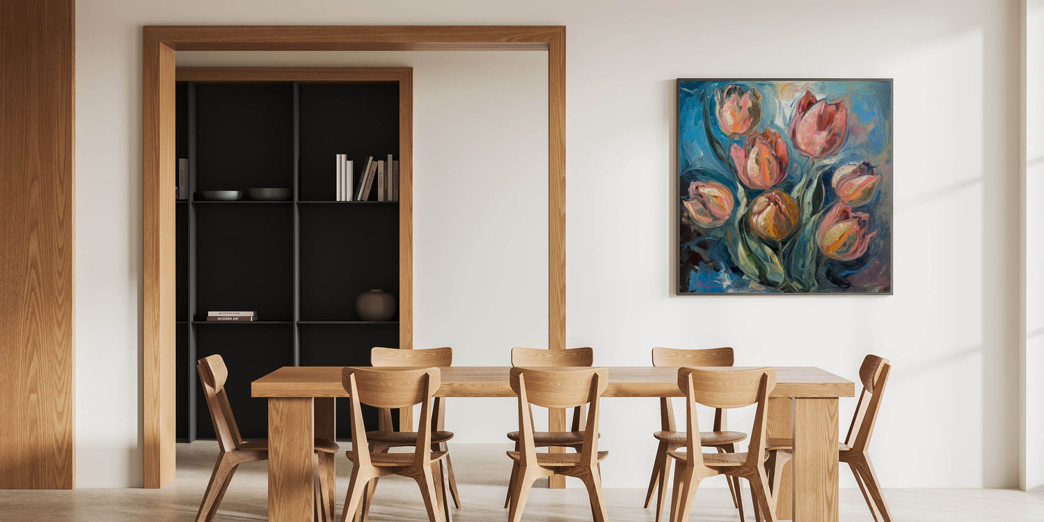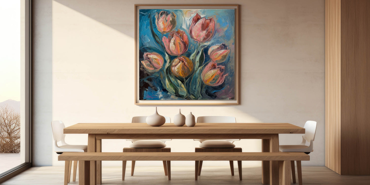 Bring a touch of elegance and nature to your dining space with this framed dining room print, featuring a breathtaking floral tulip painting in vibrant hues of pink, orange, and deep blue. The rich brushstrokes and expressive texture make this piece a stunning focal point for any dining room wall decor.
