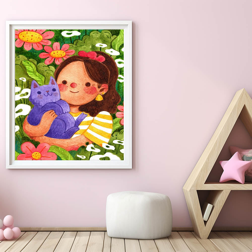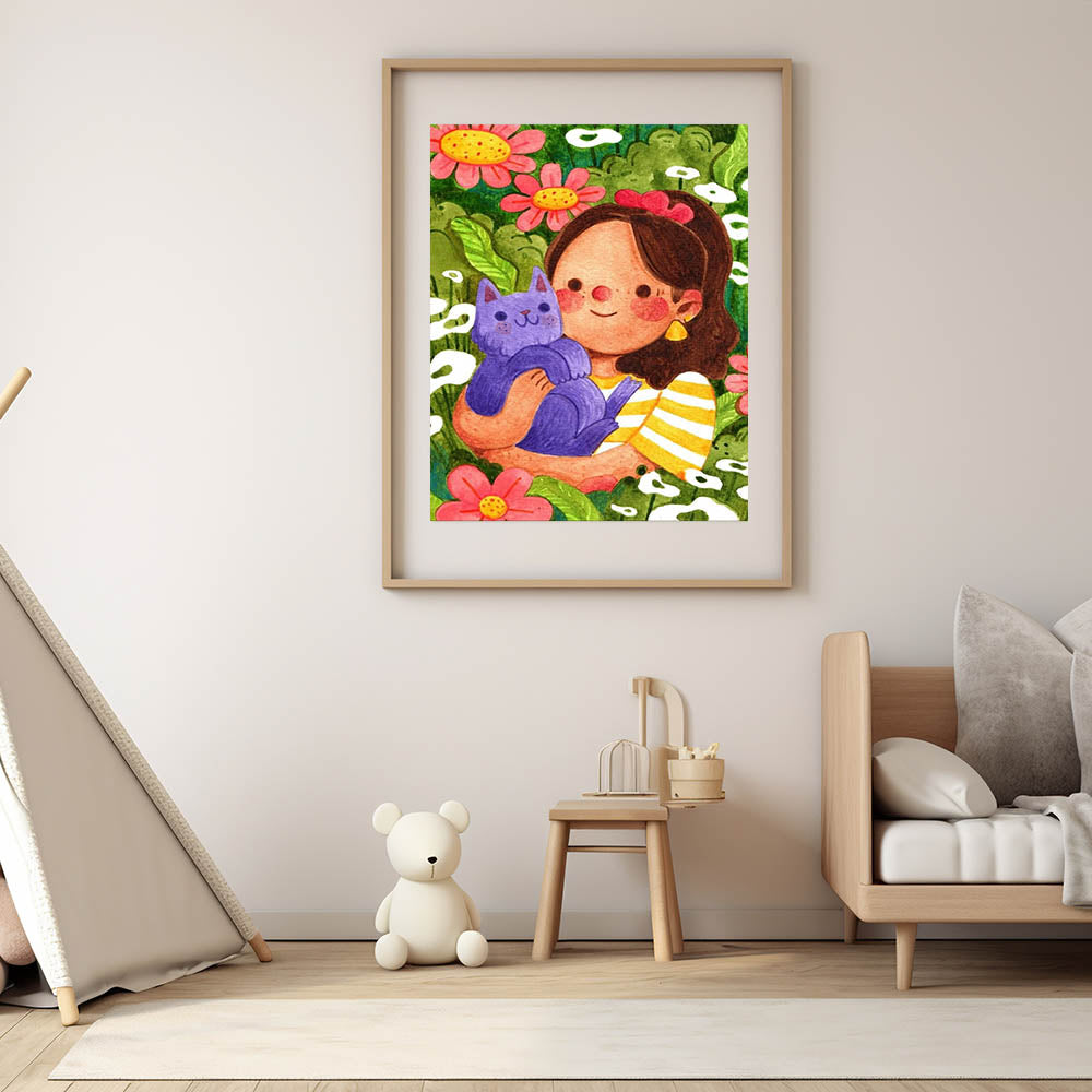 Girl & Cat in Garden Girls Room Wall Art – Kids Room Art Print