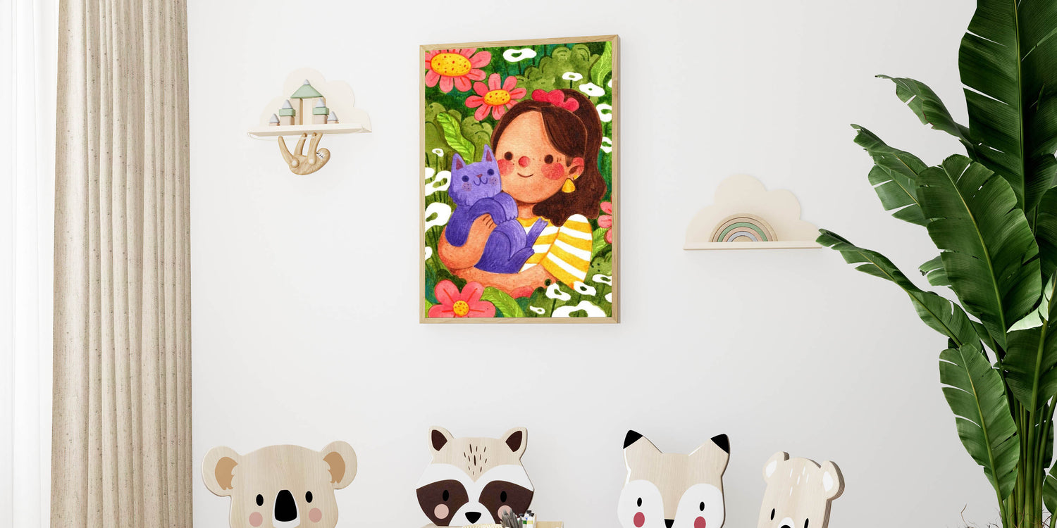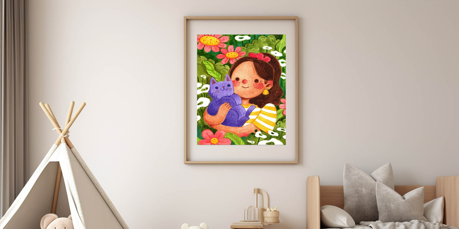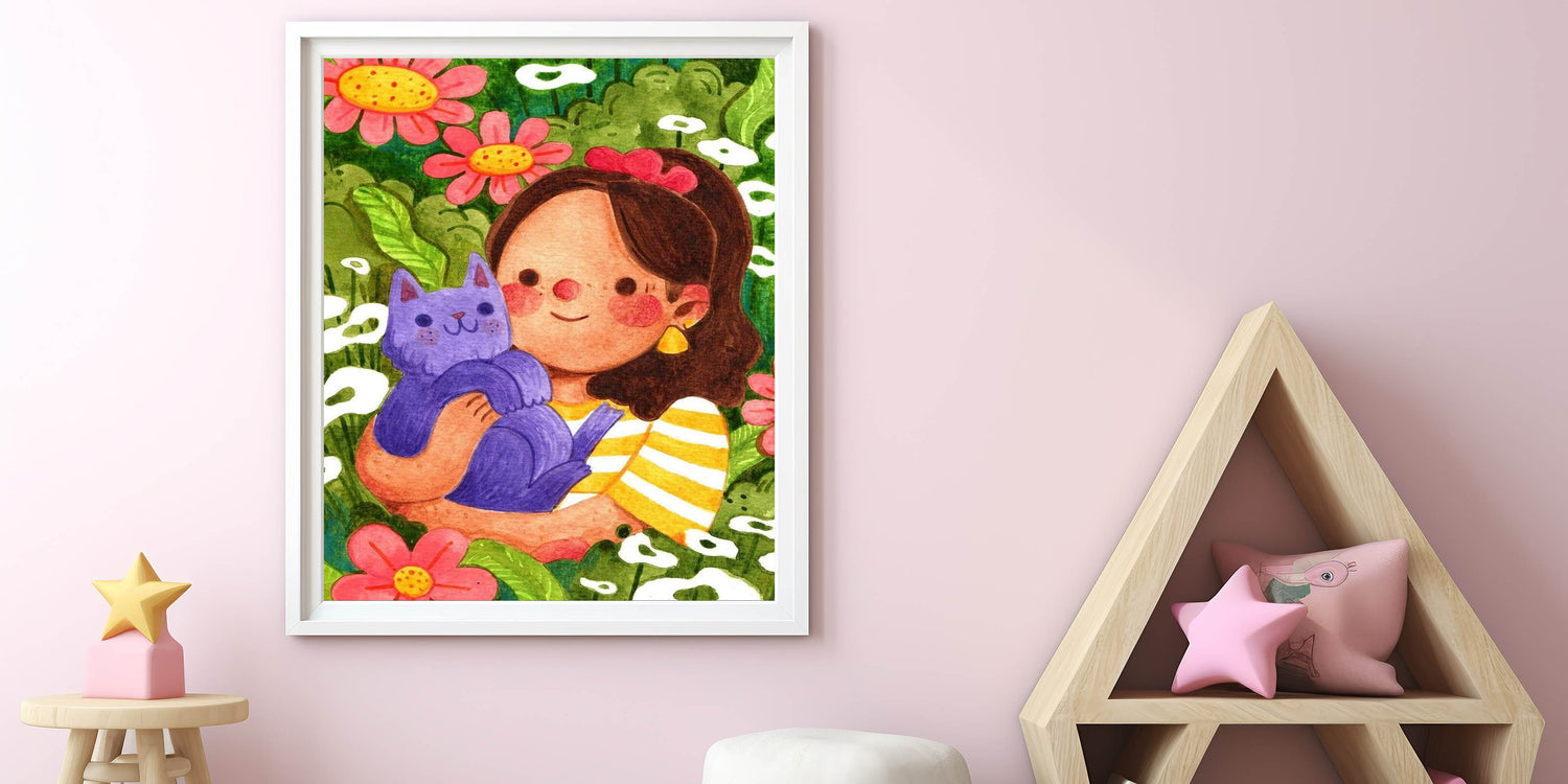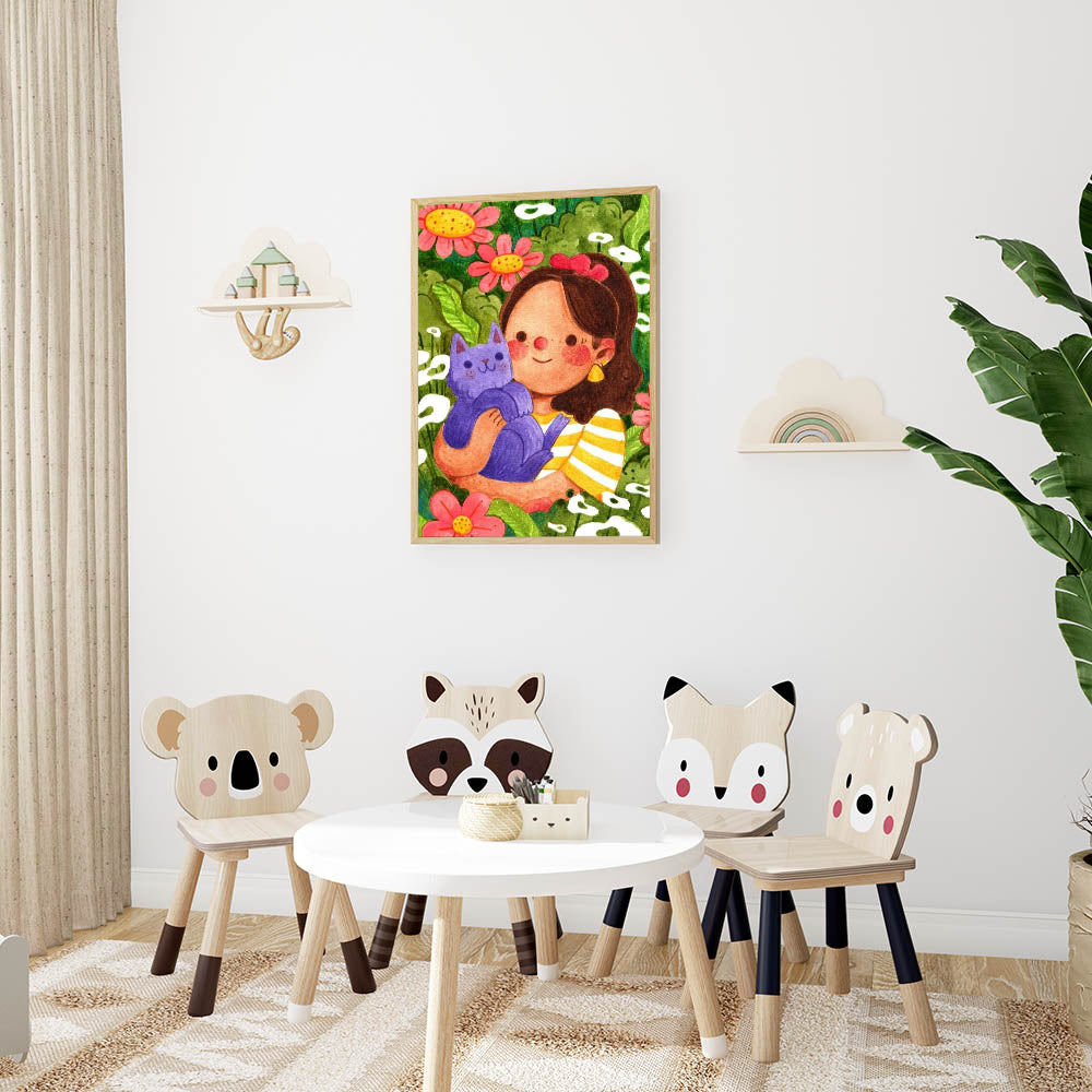 Add a touch of joy and nature to your child’s space with this Girls Room Wall Art, featuring a sweet girl embracing her purple cat in a lush, flower-filled garden. The rich greens, bright pinks, warm yellows, and deep purples create a vibrant and playful aesthetic, making this artwork a perfect addition to a nursery, kids’ bedroom, or playroom. This beautifully illustrated piece captures the essence of friendship, love for animals, and the magic of nature, making it a delightful part of any children’s wall decor collection.