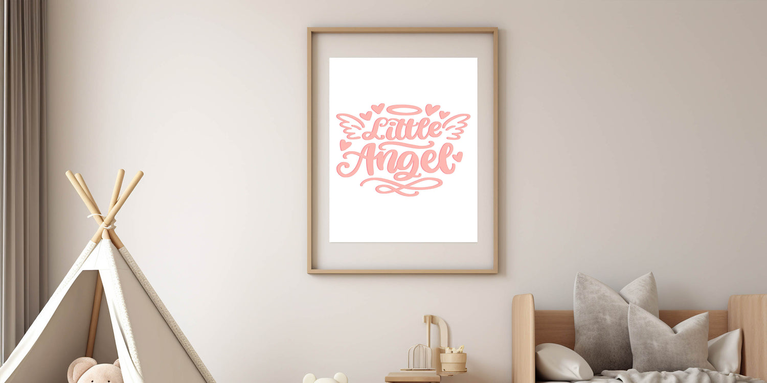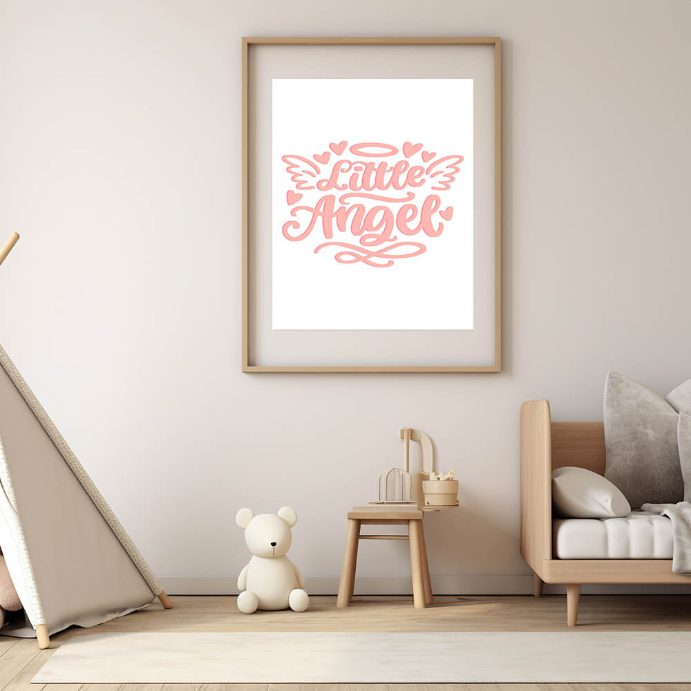 Add a heavenly touch to your little one's space with this "Little Angel" wall art, a perfect piece for nurseries, girls' bedrooms, and playrooms. Designed in soft pastel pink with delicate angel wings, hearts, and a halo, this artwork creates a warm, serene, and loving atmosphere. Its clean white background keeps the design modern and versatile, making it ideal for any room style.