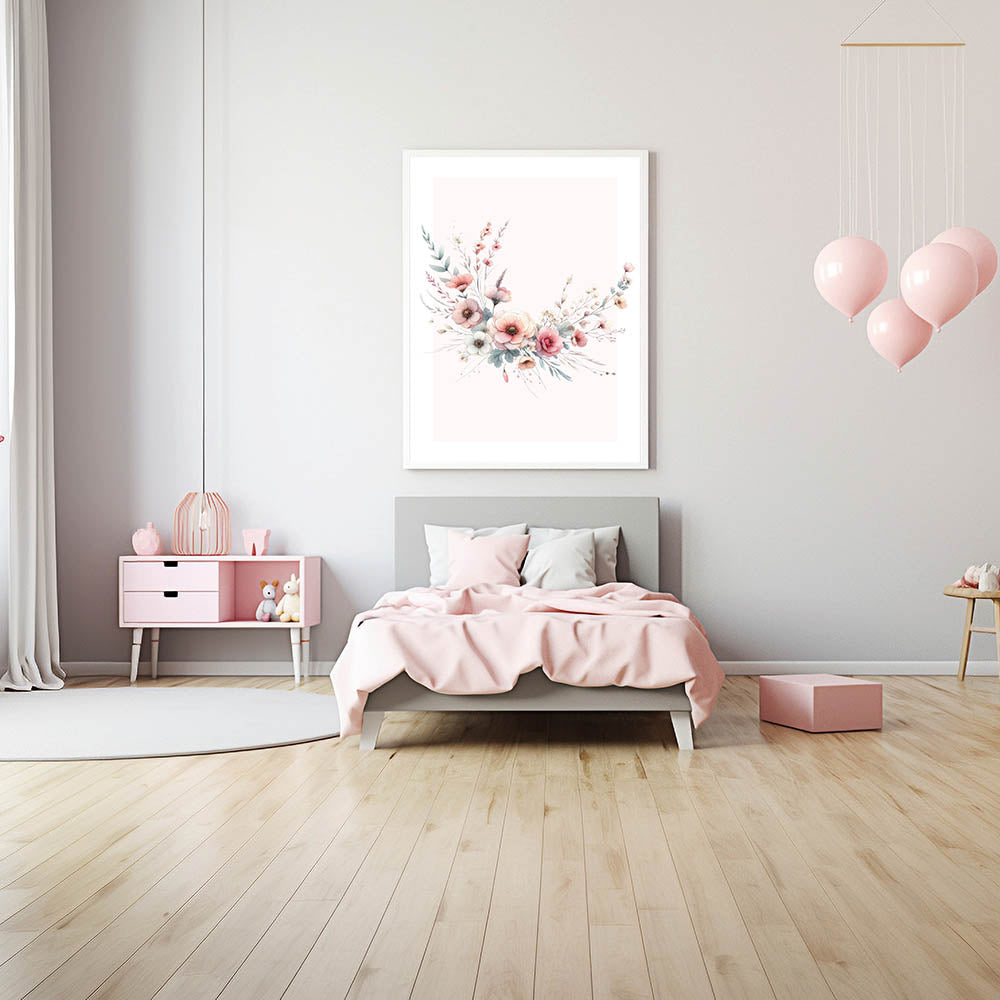 This customizable wall art for girls' bedrooms makes an excellent gift for birthdays, baby showers, or nursery decor. The combination of soft pink florals and lush greenery blends beautifully with modern, vintage, and boho interior styles.