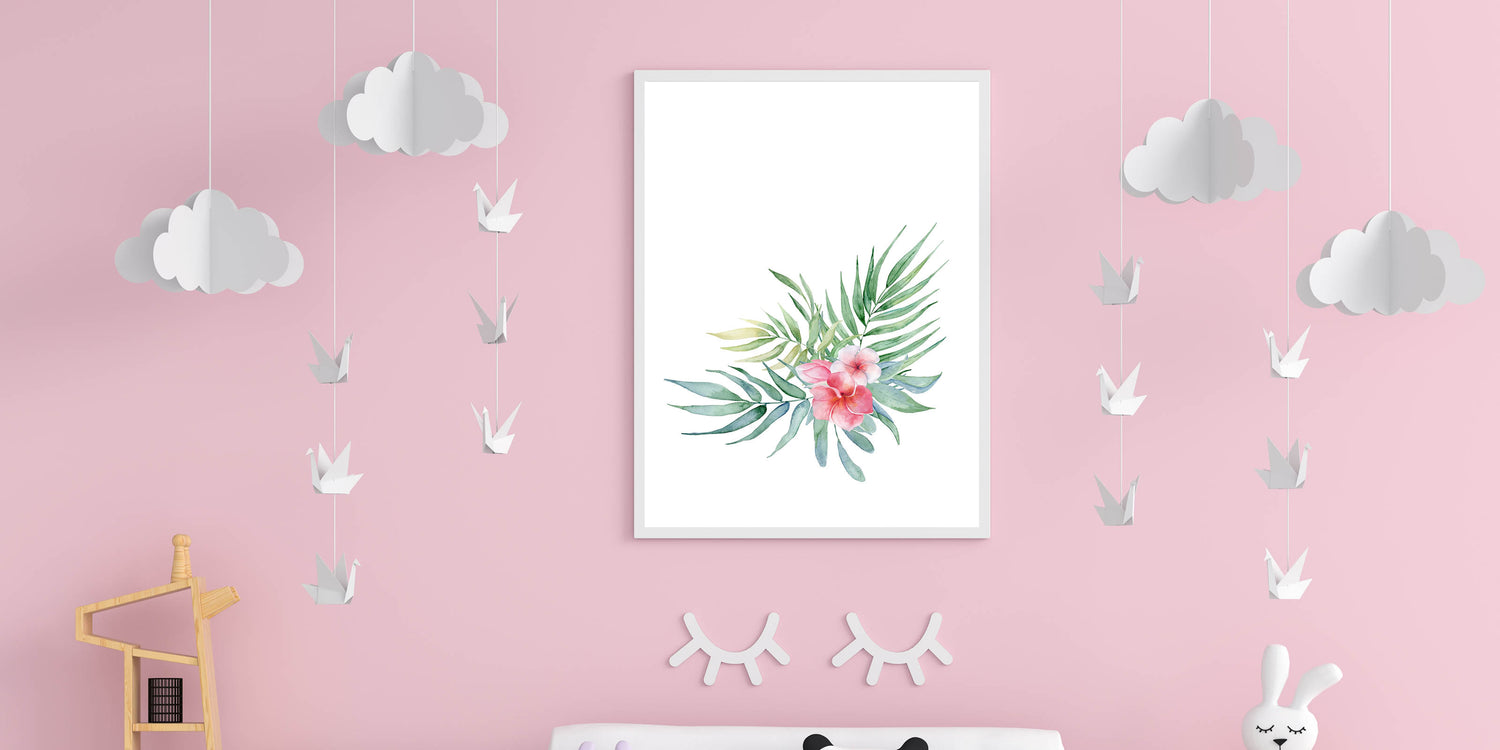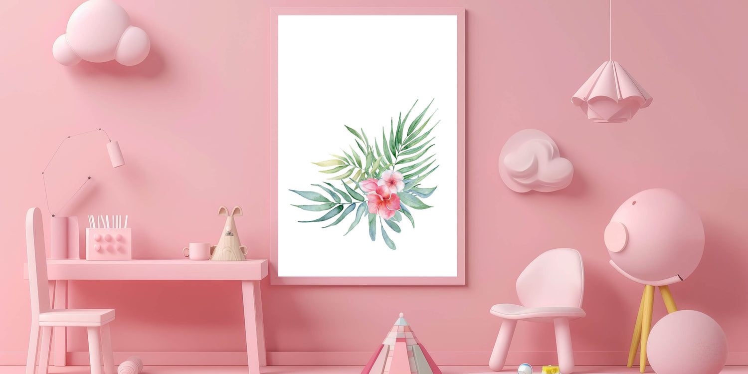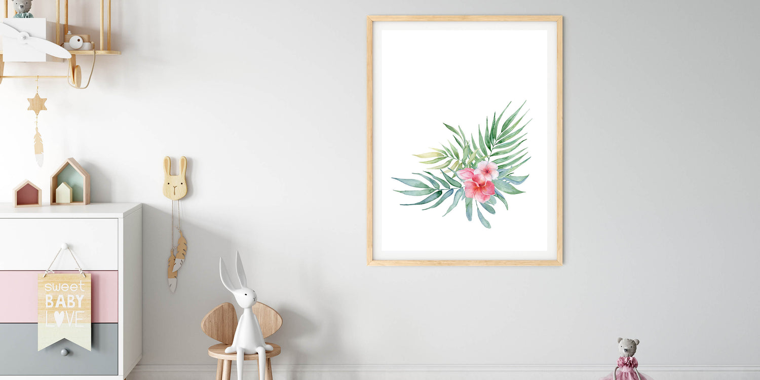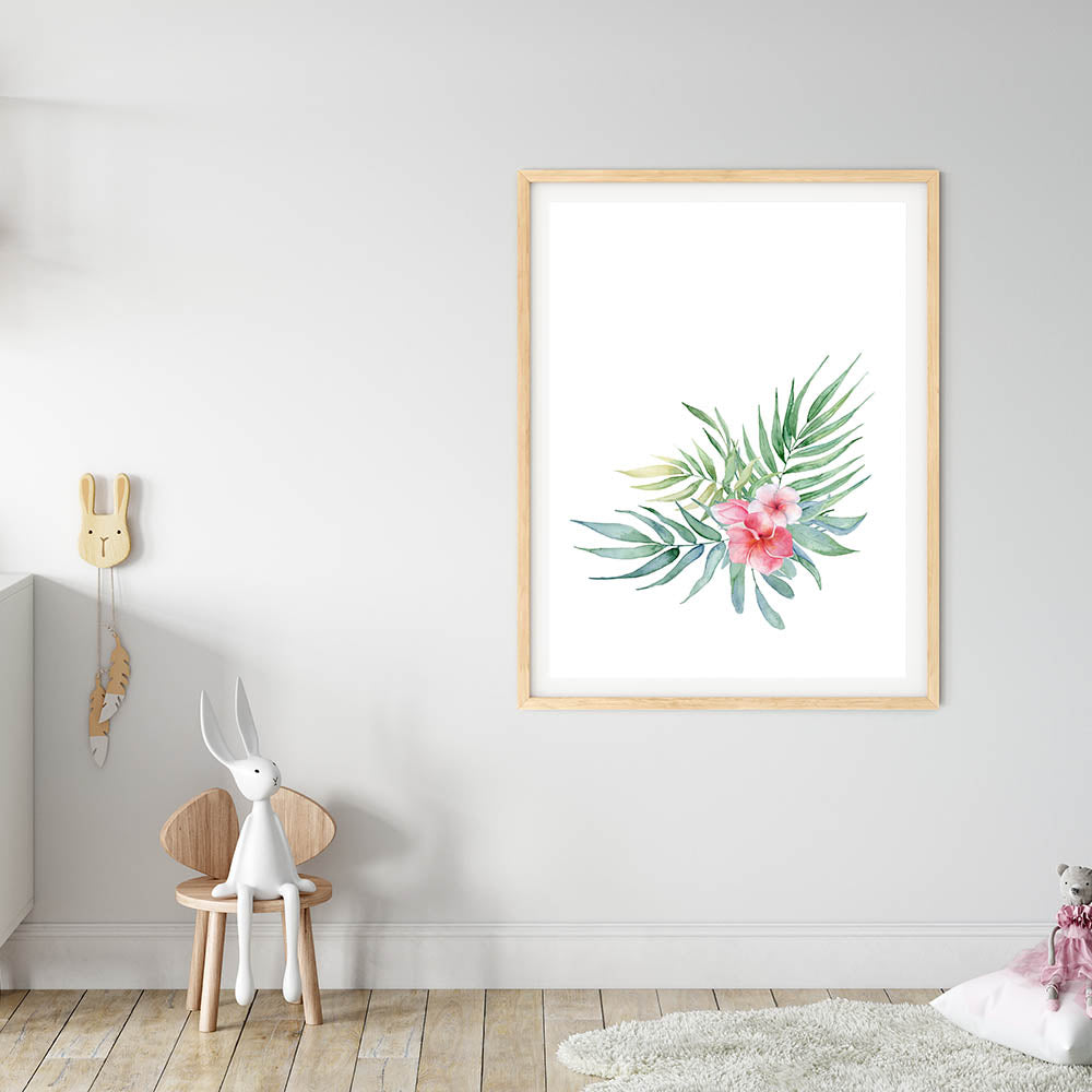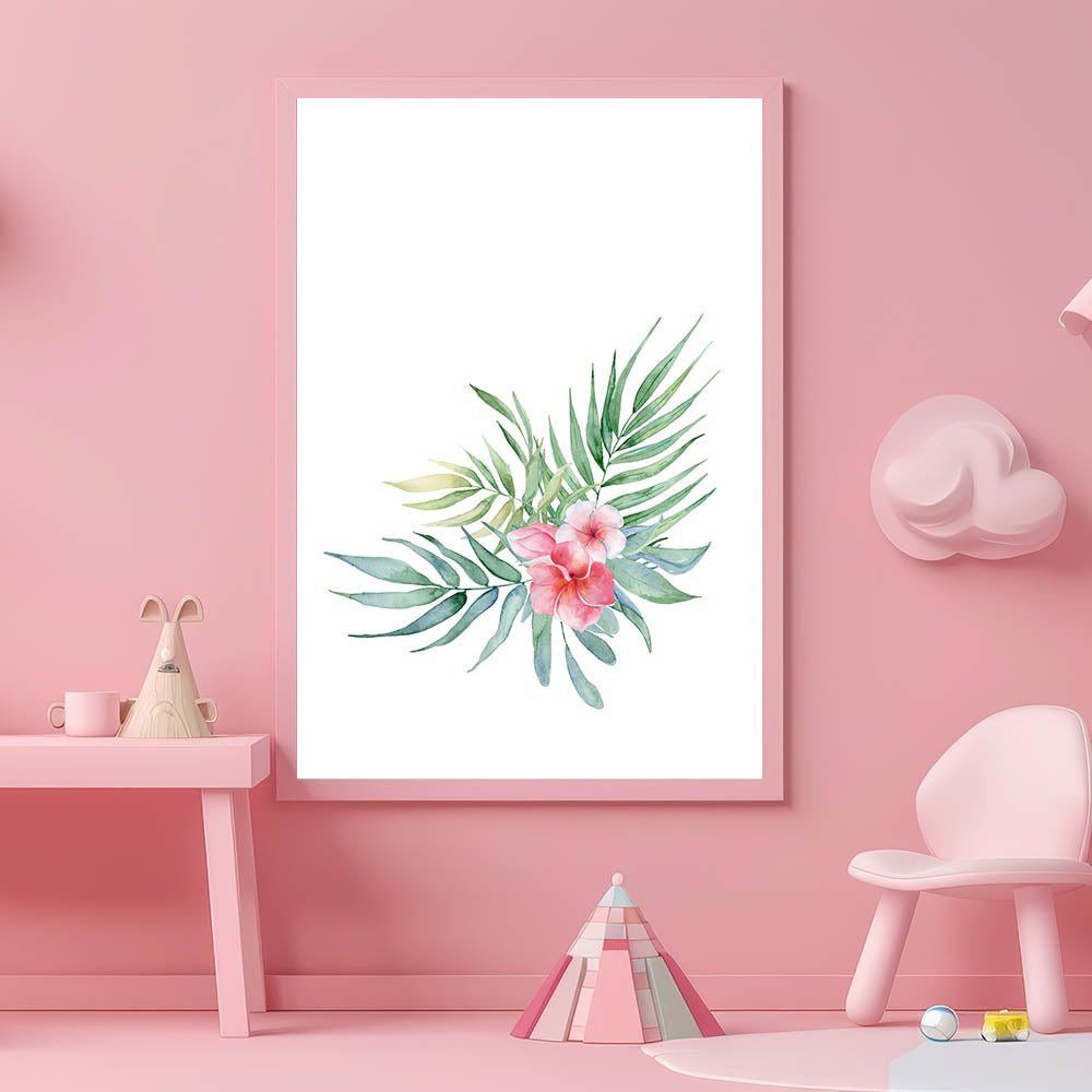 Add a fresh and tropical touch to your child’s space with this elegant watercolor floral wall art. Featuring soft pink tropical flowers nestled among lush green palm leaves, this delicate design brings a calming, nature-inspired feel to nurseries, girls' bedrooms, and playrooms. The clean white background highlights the vibrant watercolor details, making it a versatile addition to modern or classic decor.